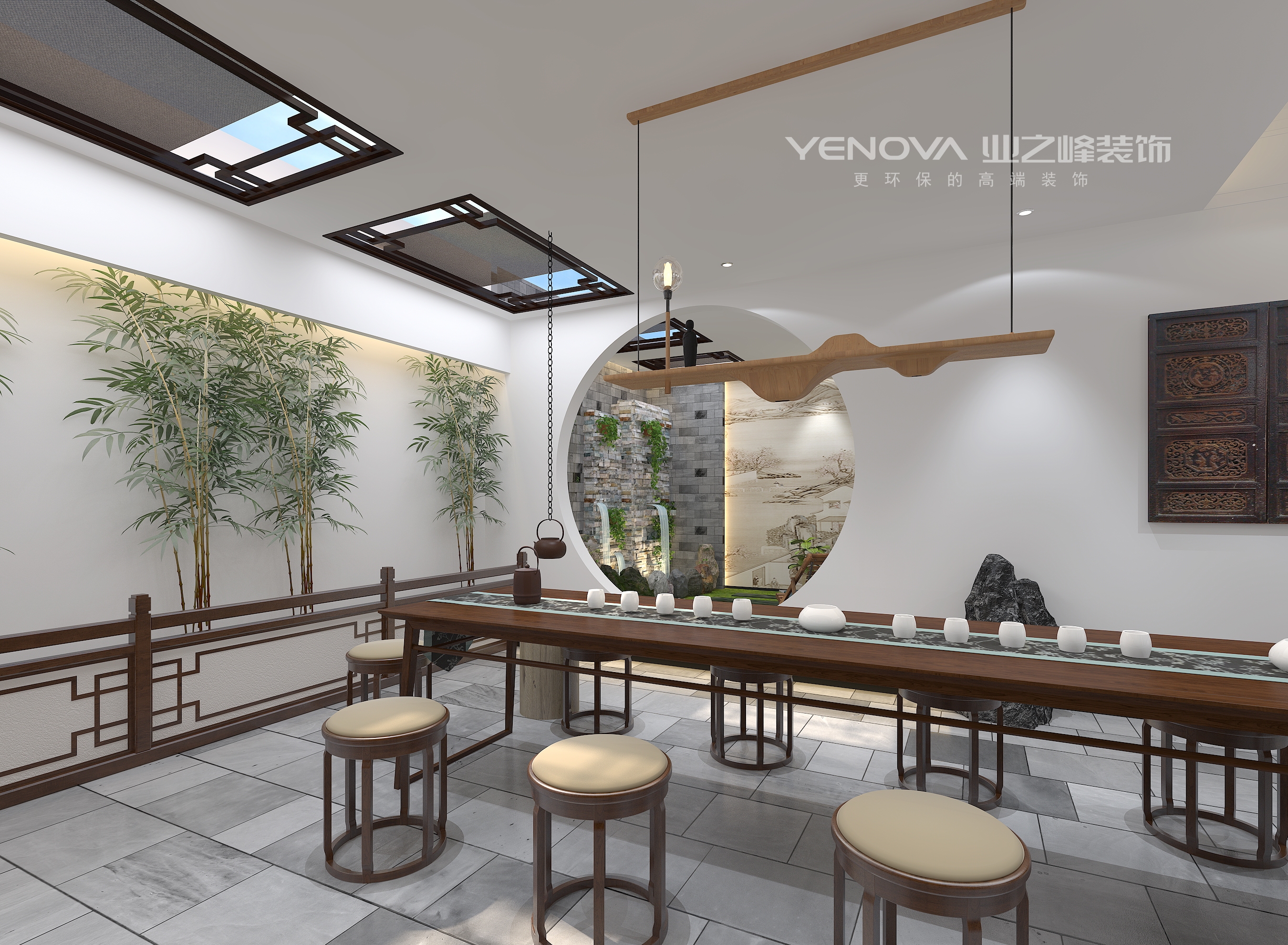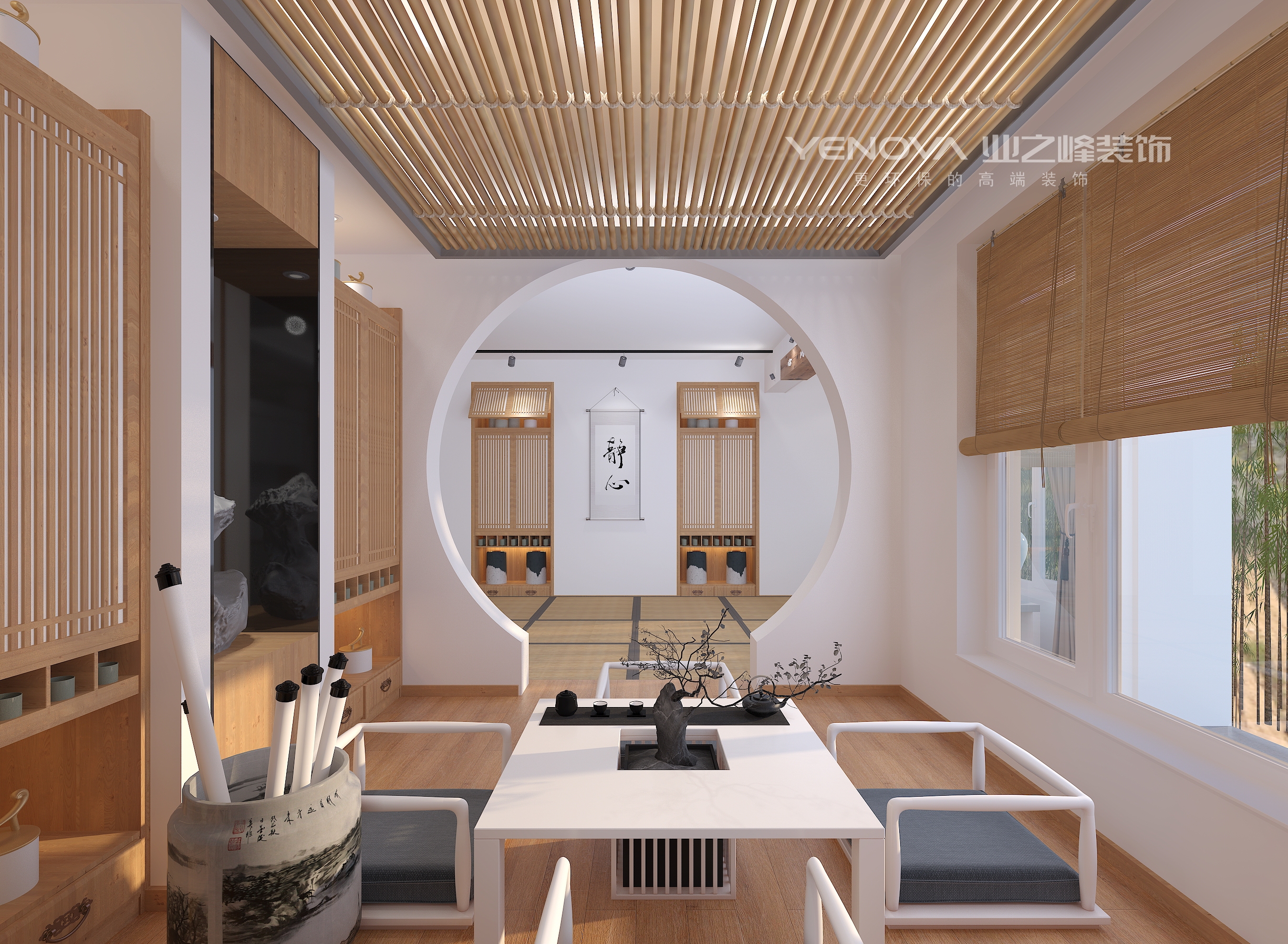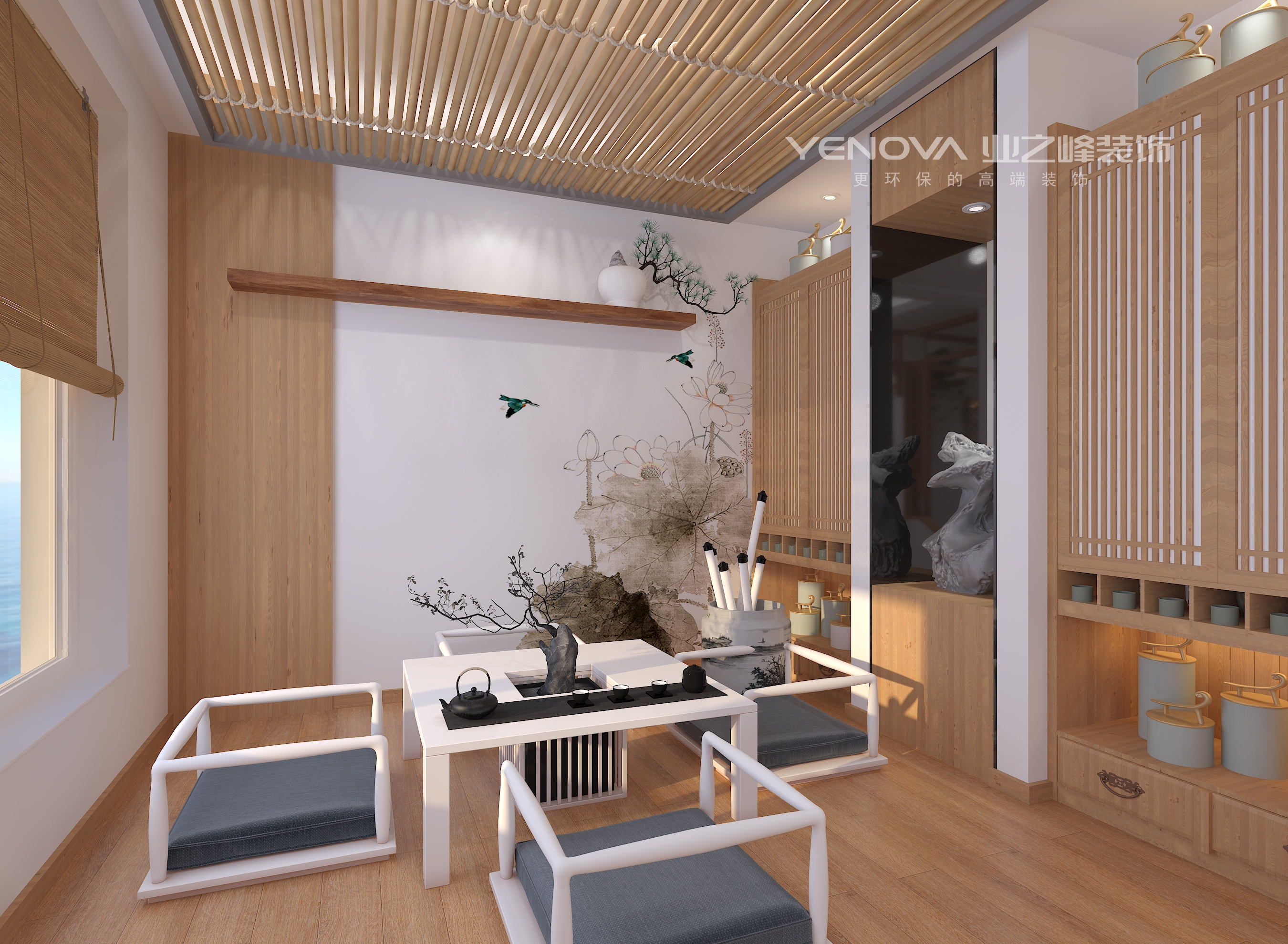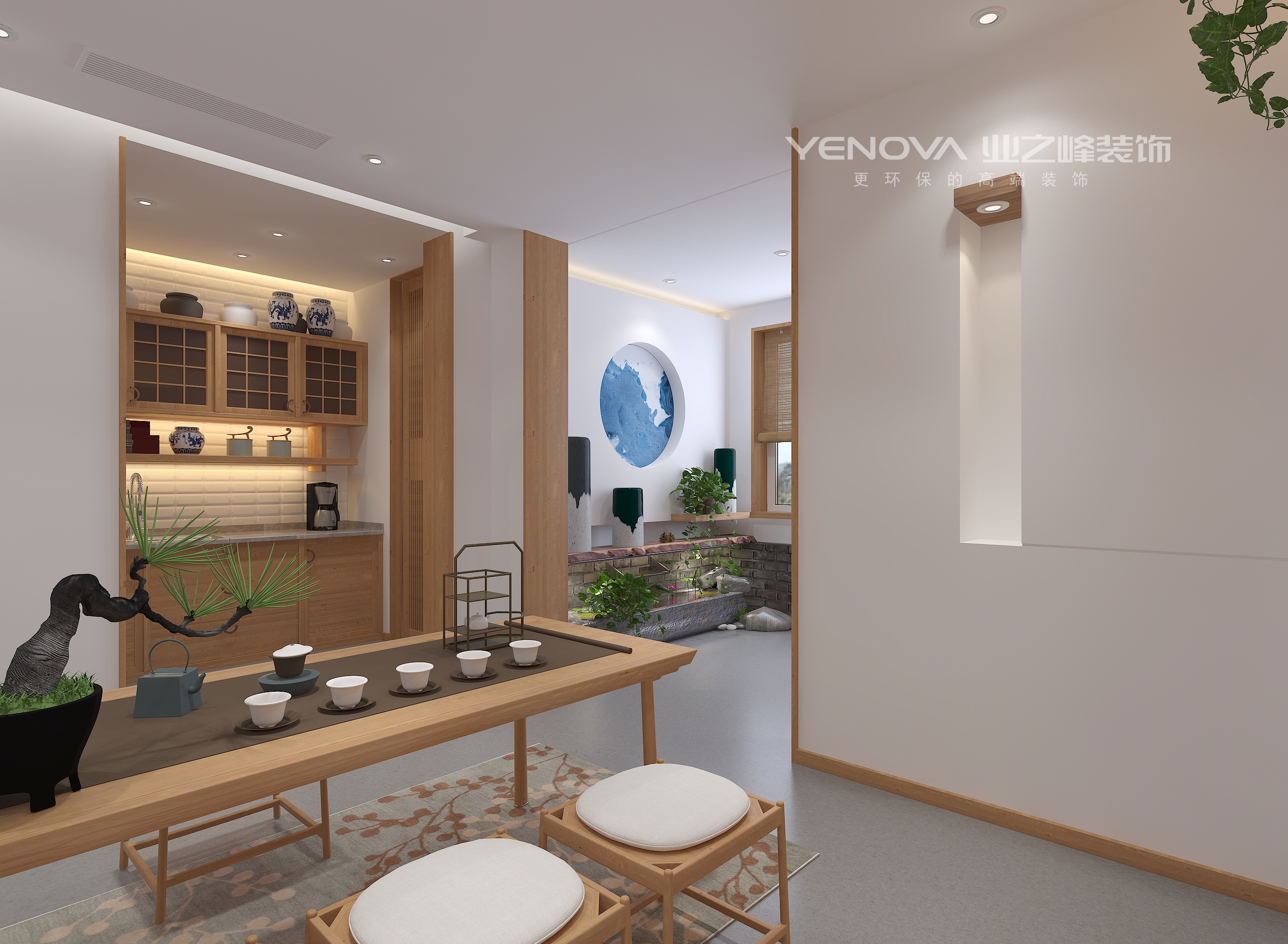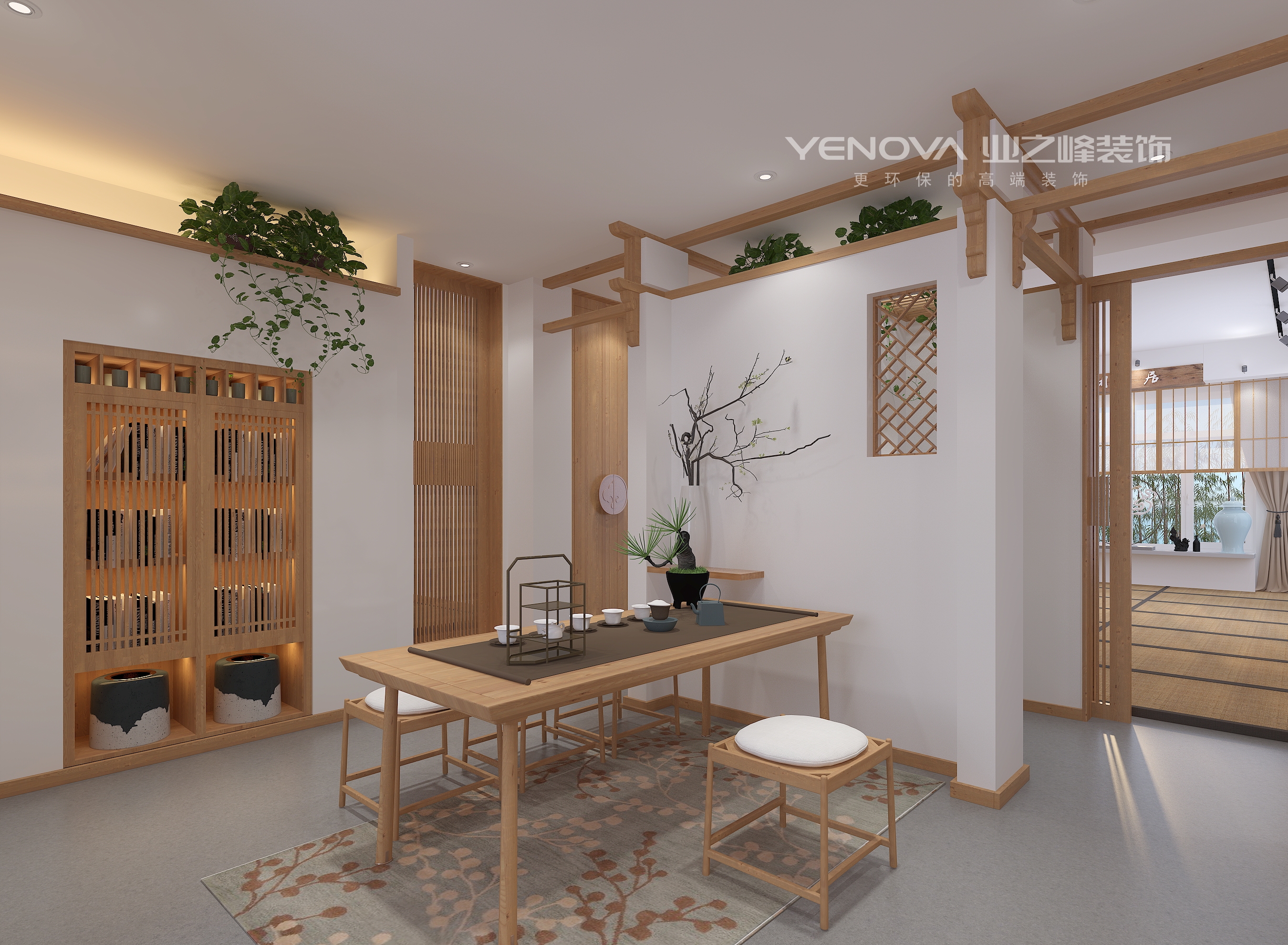 茶室是一个安放心灵的空间 所以在设计上,以简约、自然舒适为主温润的木色和清雅的绿植年释放一种素雅、静谧的空间气质 茶架的格子柜体,在使用上也更得心应手.有藏有露的设计,既能放常看书籍 也能收纳起--些藏品台 为生活更平添了许多悠闲和禅意。