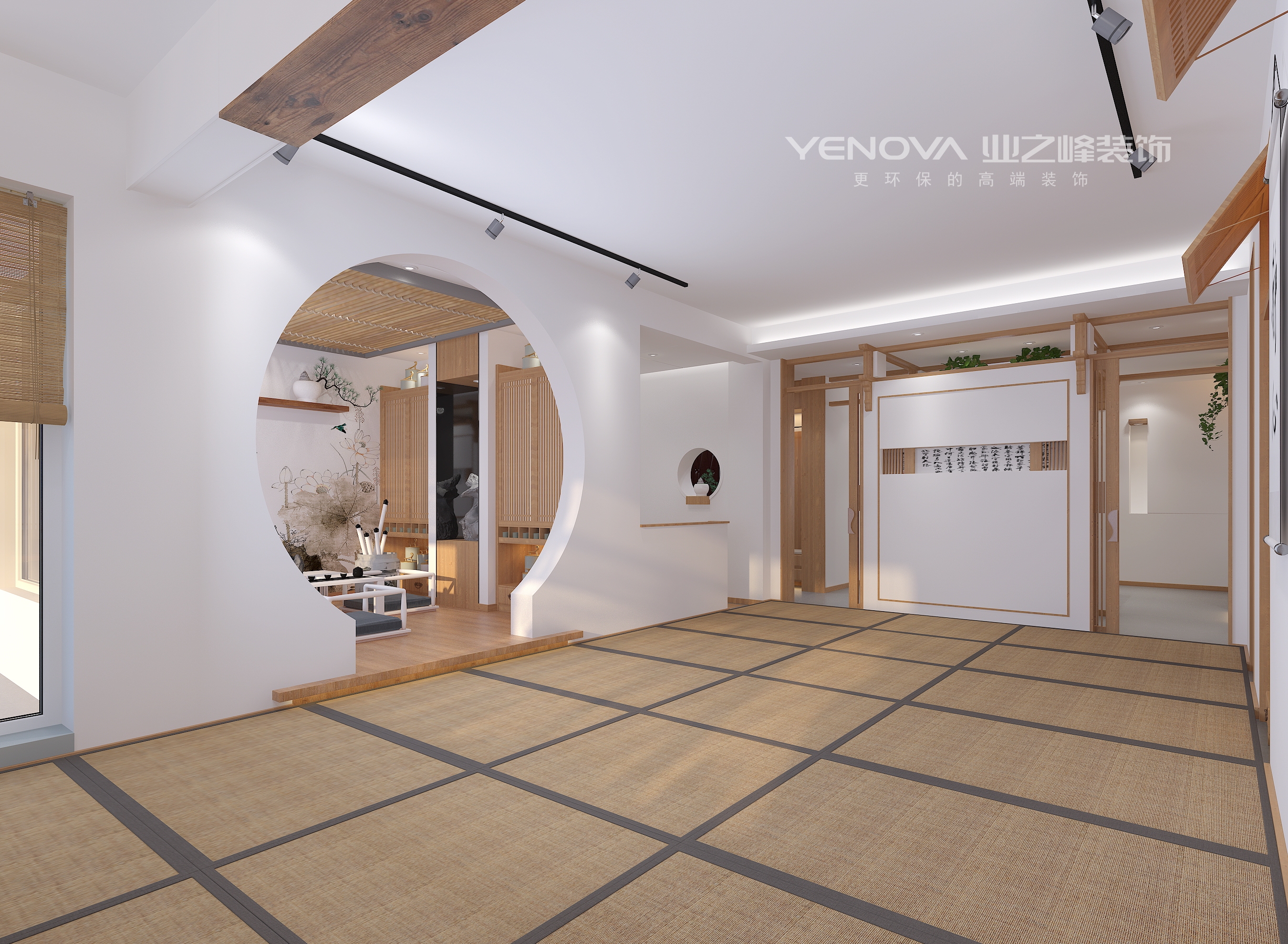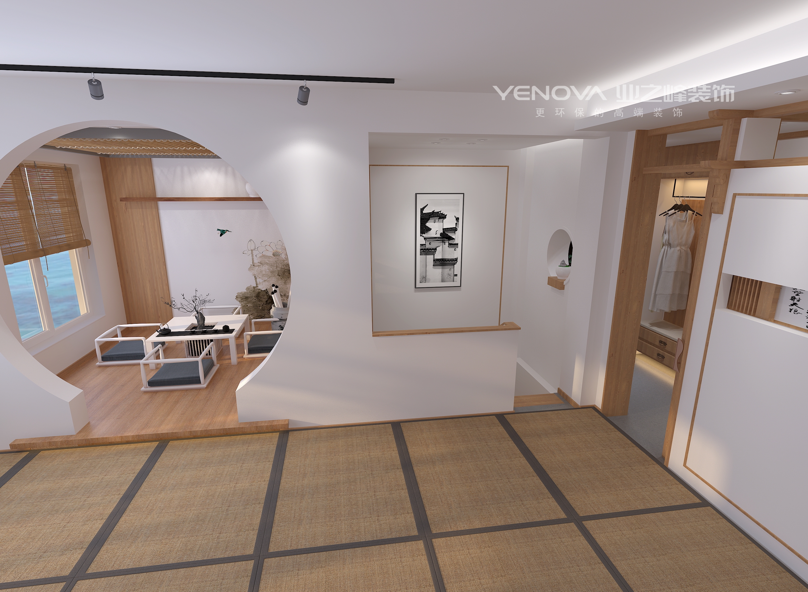 本案例禅意新中式,整个色调以浅木色为主,中式木格栅与中式元素相结合。既能体现出中国的文化素雅,又融入了现代风格。