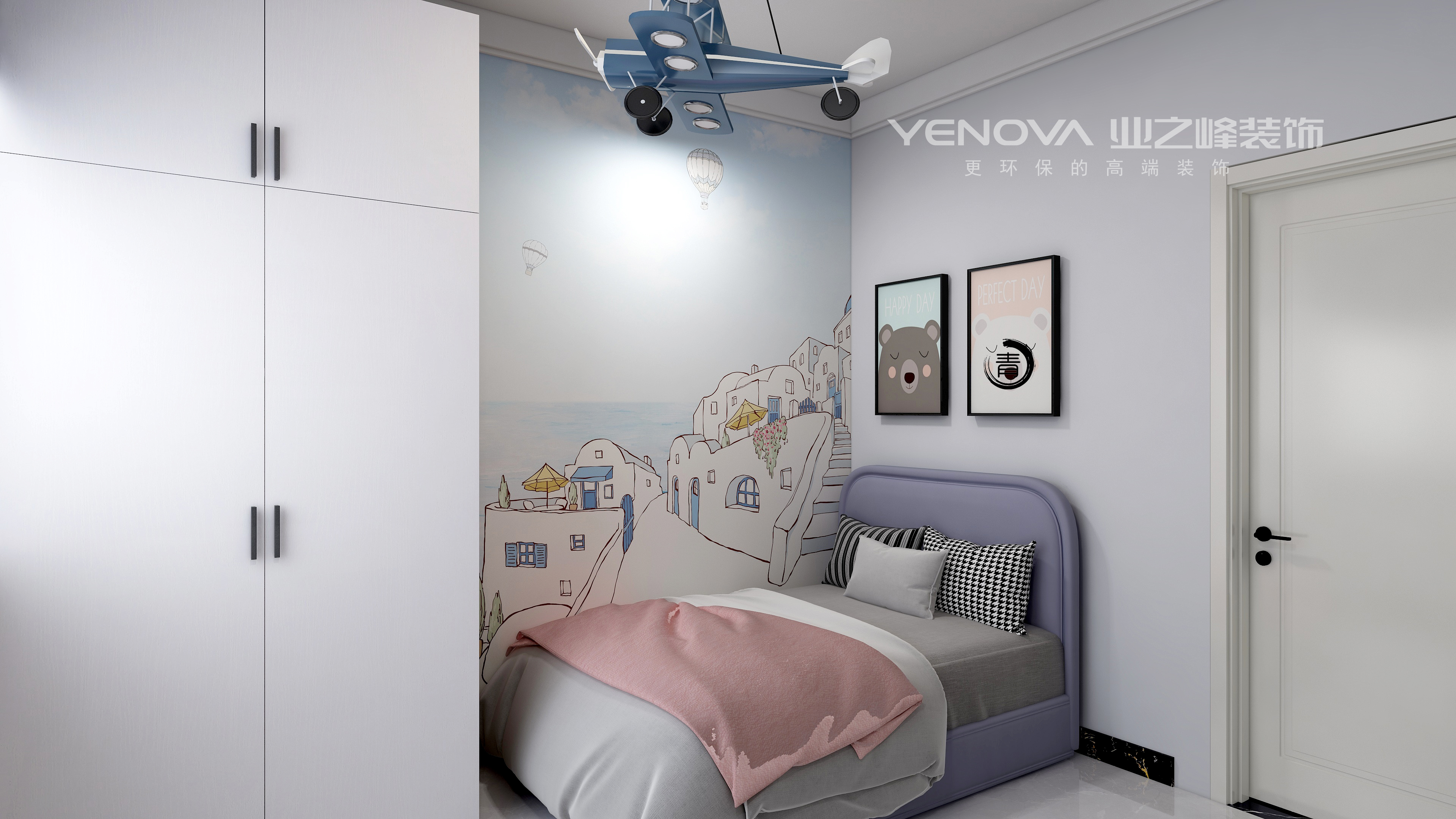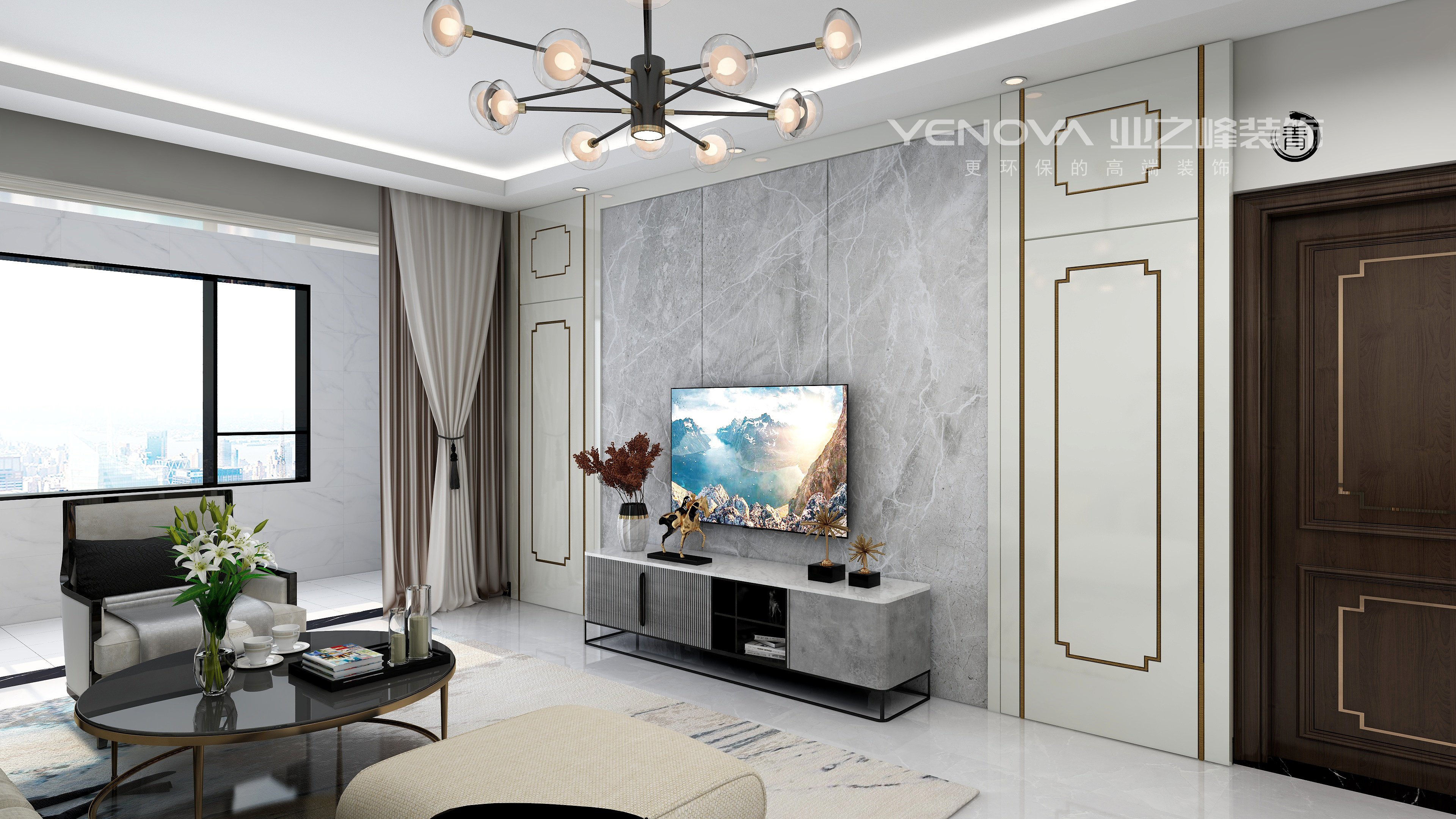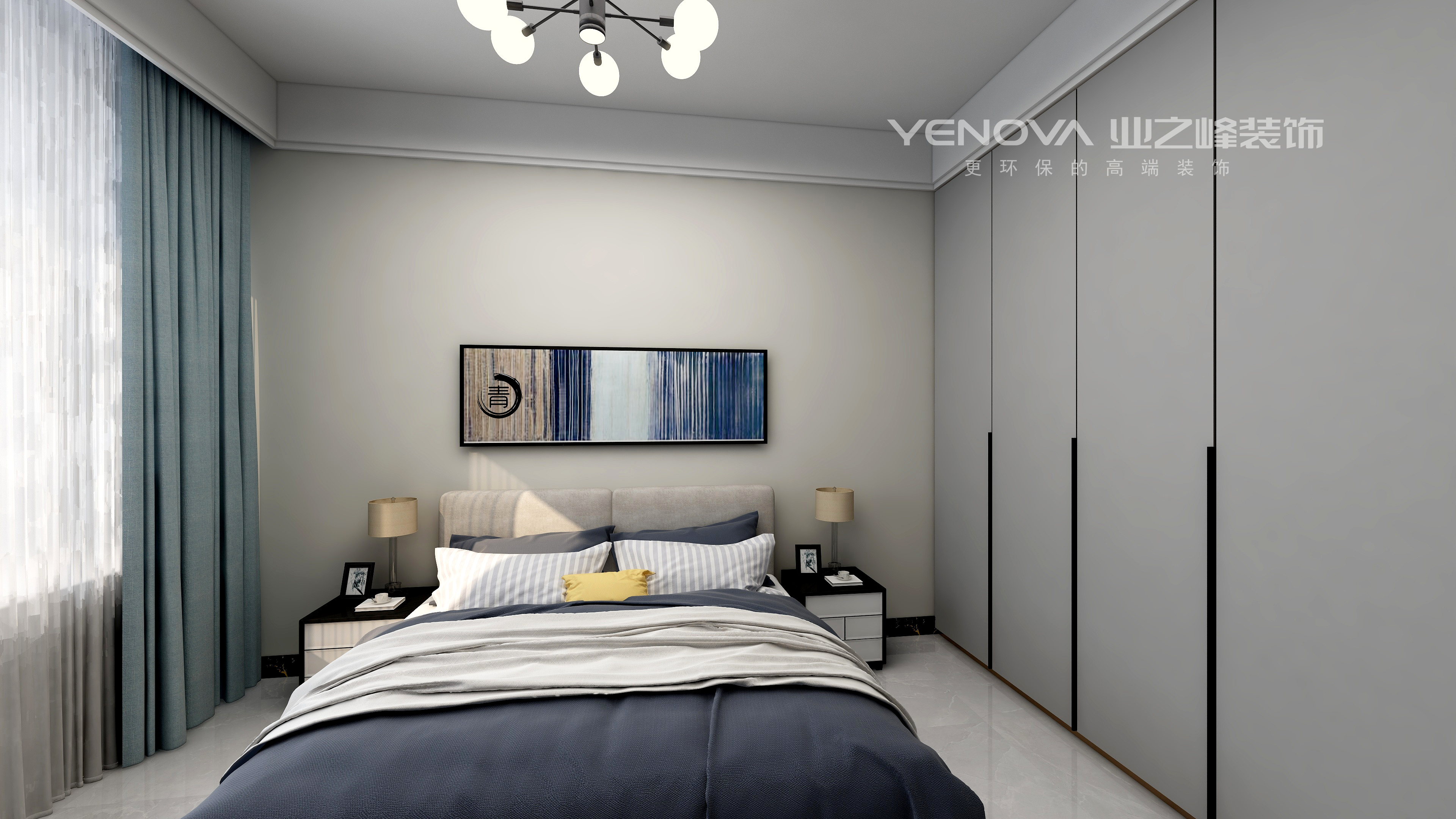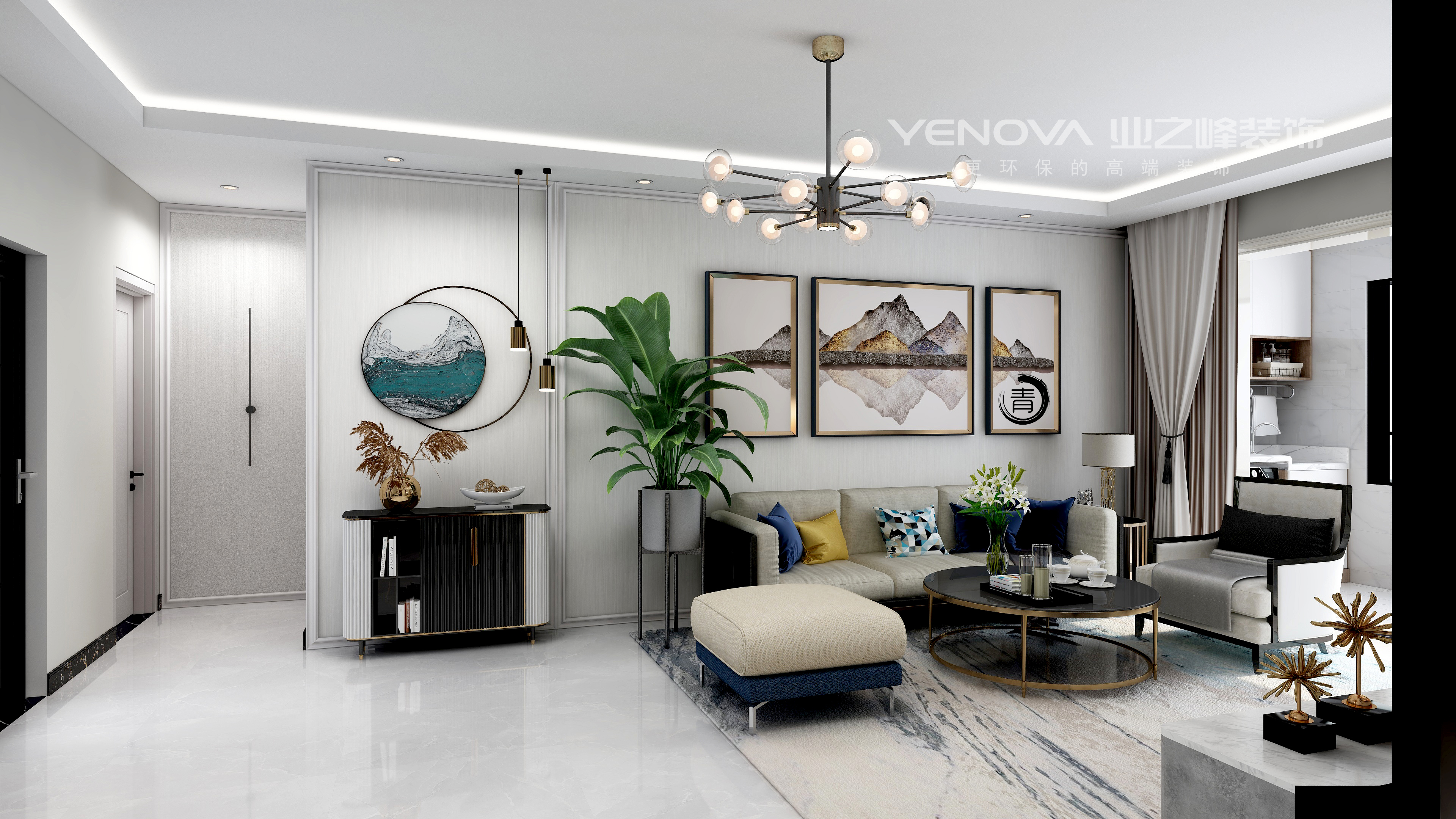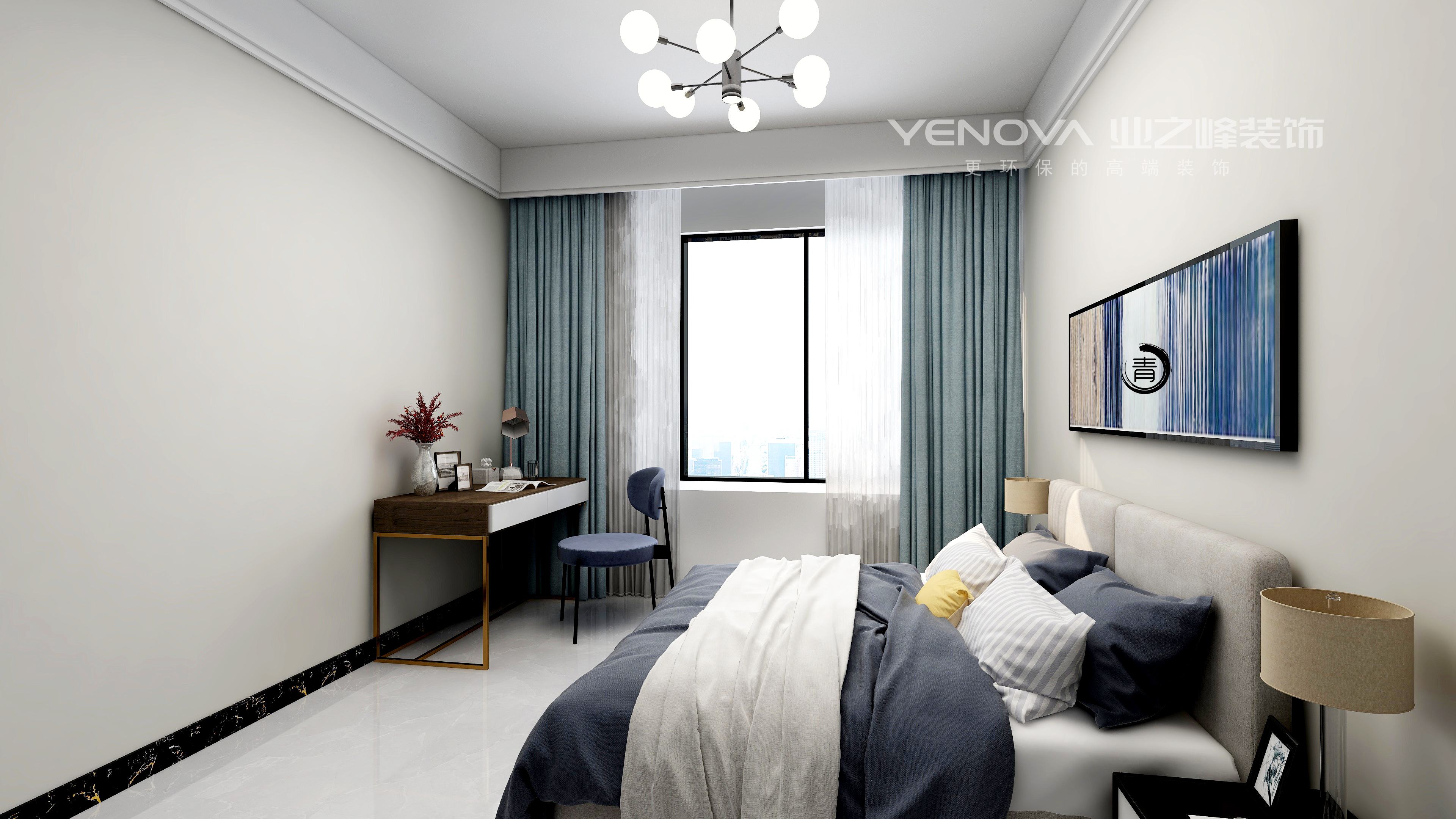 现代简约中离不开金属灯罩、玻璃灯、高纯度色彩、线条简洁的家具、到位的软装。同时考虑到业主家里还有两个年幼的孩子,安全应该放在首位,所以就将玻璃灯只吊在了顶棚,避免别的地方的使用带来安全隐患。电视背景墙上的软包,实惠又大方,同时不失时尚,