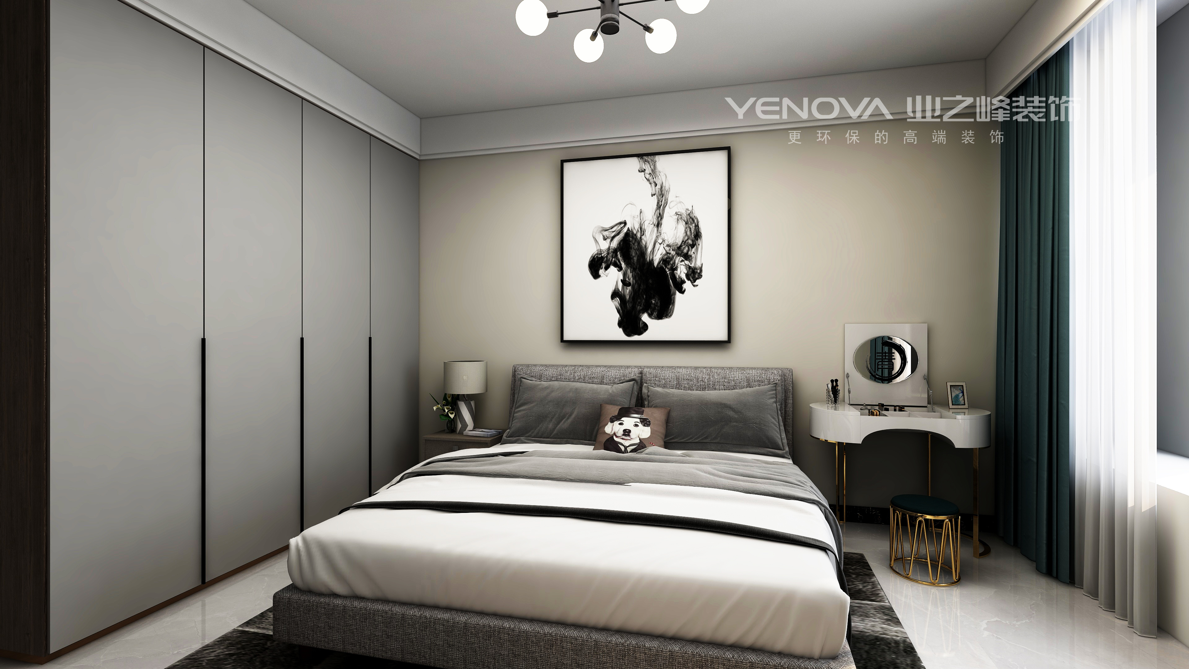 在家具配置上,白亮光系列家具,独特的光泽使家具倍感时尚,具有舒适与美观并存的享受。在配饰上,延续了黑白灰的主色调,以简洁的造型、完美的细节,营造出时尚前卫的感觉。不论是卧室还是客厅,本设计都集中体现了这一点,同时也满足了业主的要求,避免了白色的木地板带来的不便。