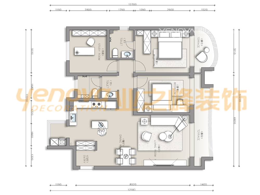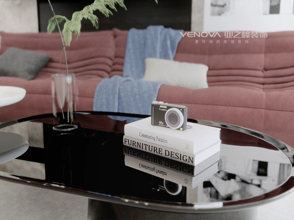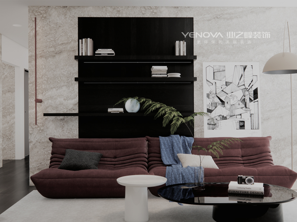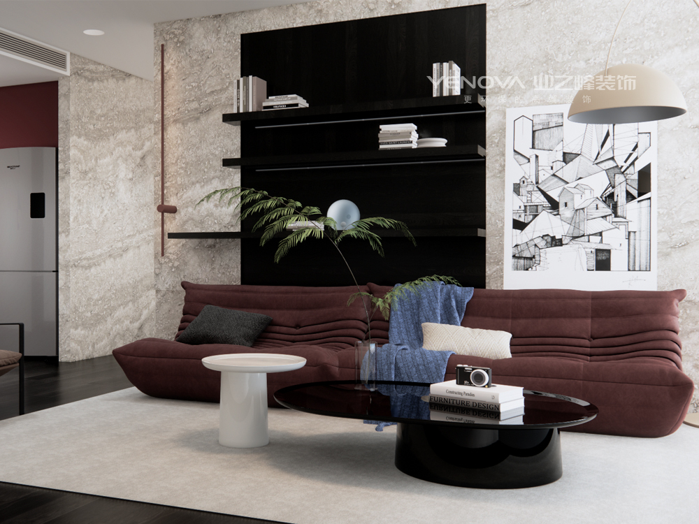 本案的设计风格为现代简约,营造优雅、高贵的气质,稳重活力是本案的主题。设计手法上从整体到局部、从空间到室内陈列塑造,都给人一种优雅印象。一方面保存了材质、色彩的大致感受,彩色家具和碳化木的黑色木质书架有助于凸起活力与反差,黑色地板凸显稳重、浅色石材墙面加黑色书架与地板相呼应、家具、空调毯等装饰织物为沉闷的空间增加色彩与活力。