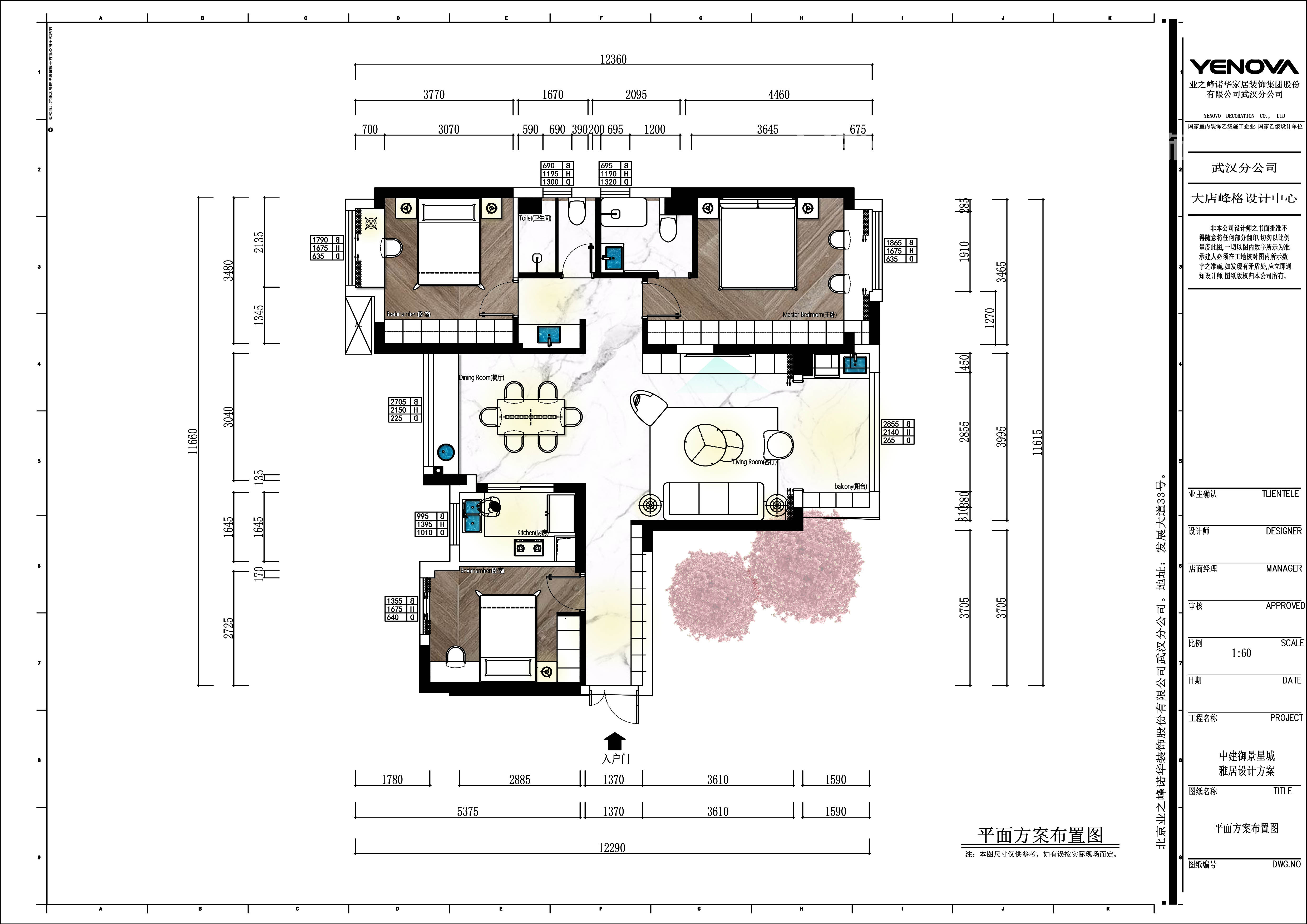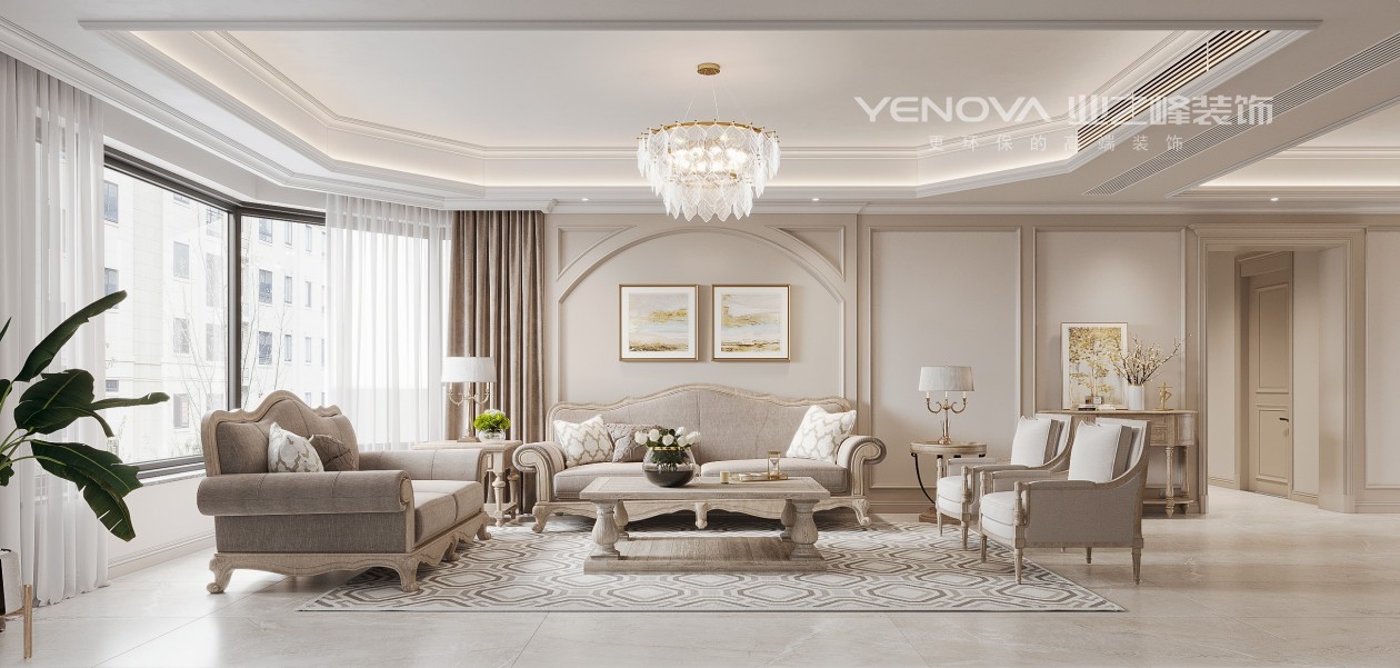 本案设计师以美式风格为主调,该方案为三室一厅二卫一厨的多工能住宅,室内使用面积约为115平方米。环境优美,以三口之家为依据进行设计。