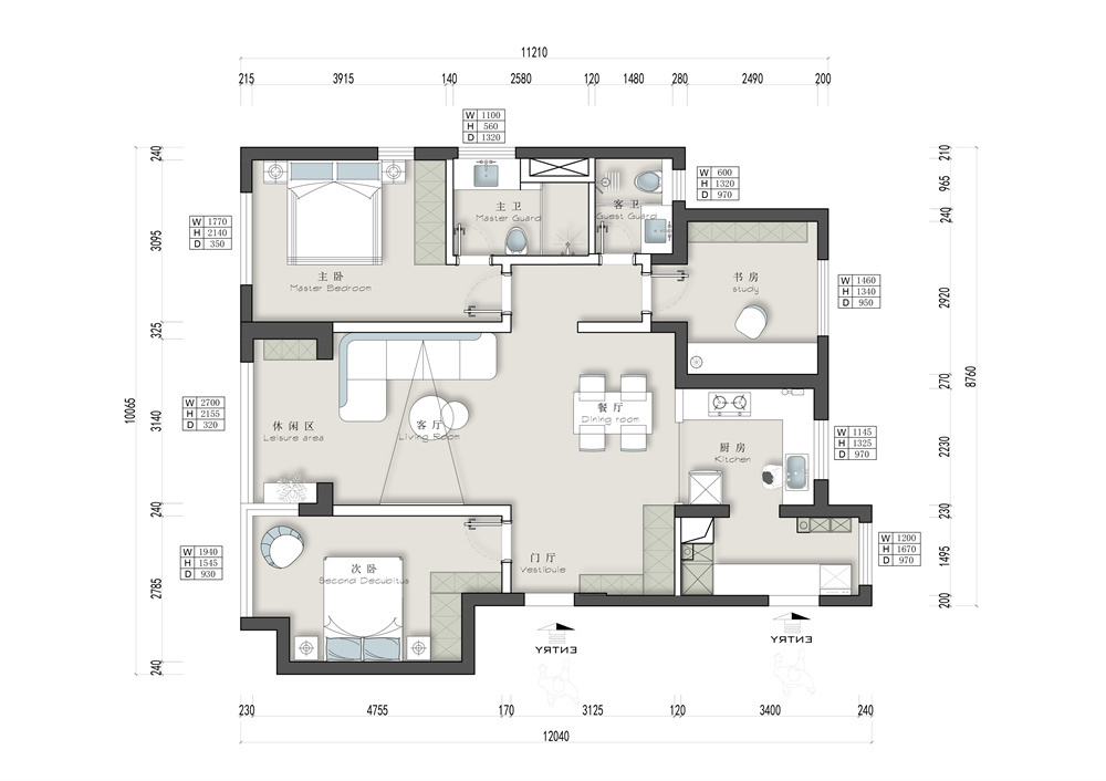 本案为三室两厅一厨两卫, 建筑面积大约:160 ㎡ 。本案围绕极致简洁的设计风格为主题,为业主居住设计一个简约、安静的生活氛围。在满足基本储物空间、操作空间的前提下,应业主中心思想,以浅色调为主调,抛弃花里胡哨的装饰物,延续黑白灰缀色的家具搭配使空间倍感时尚,让舒适与美观并存享受。将怀旧、前卫,简朴与精巧共熔一炉,打造具有都市气息的朝气与急促生活节奏相融合,有属于自己的一方天地。