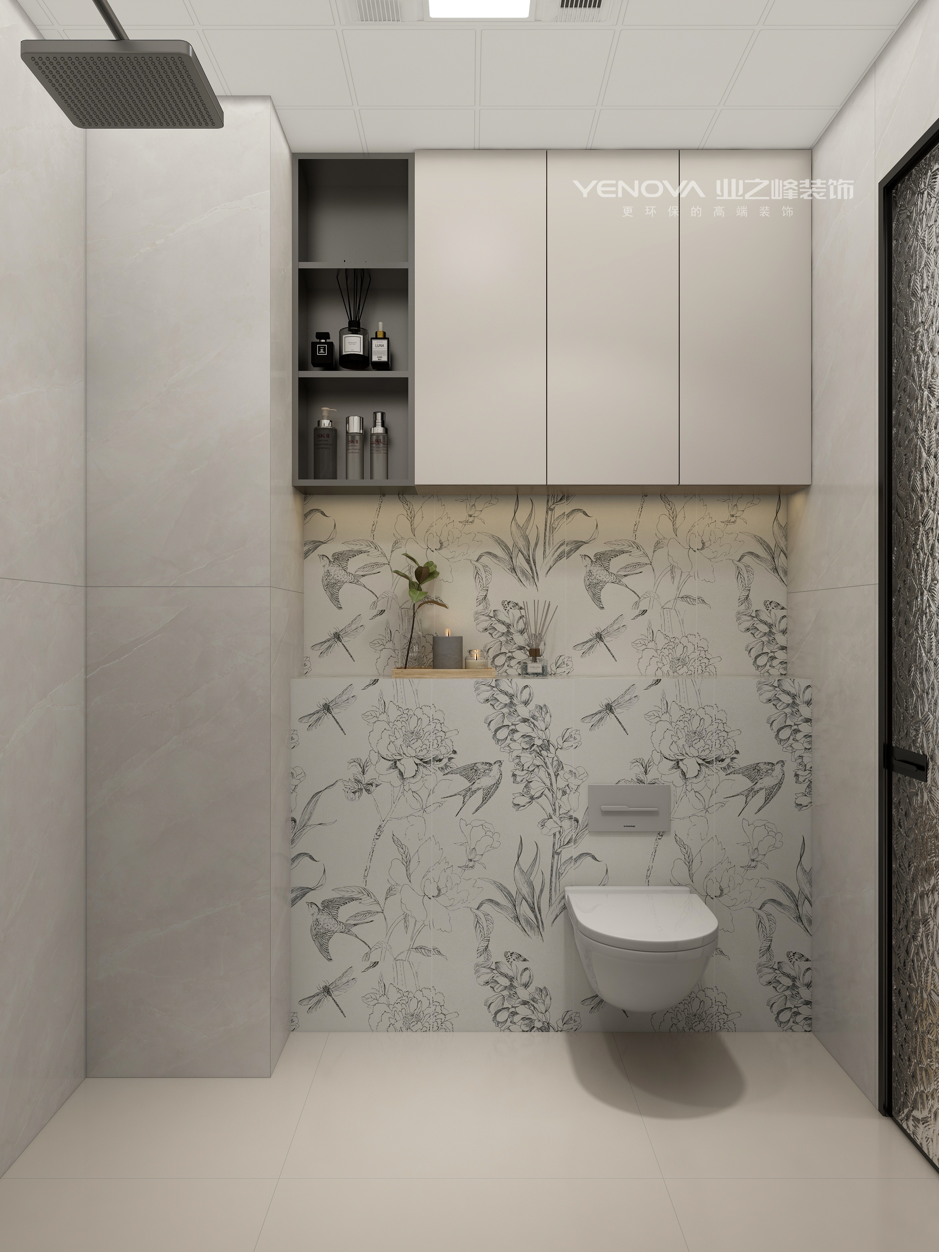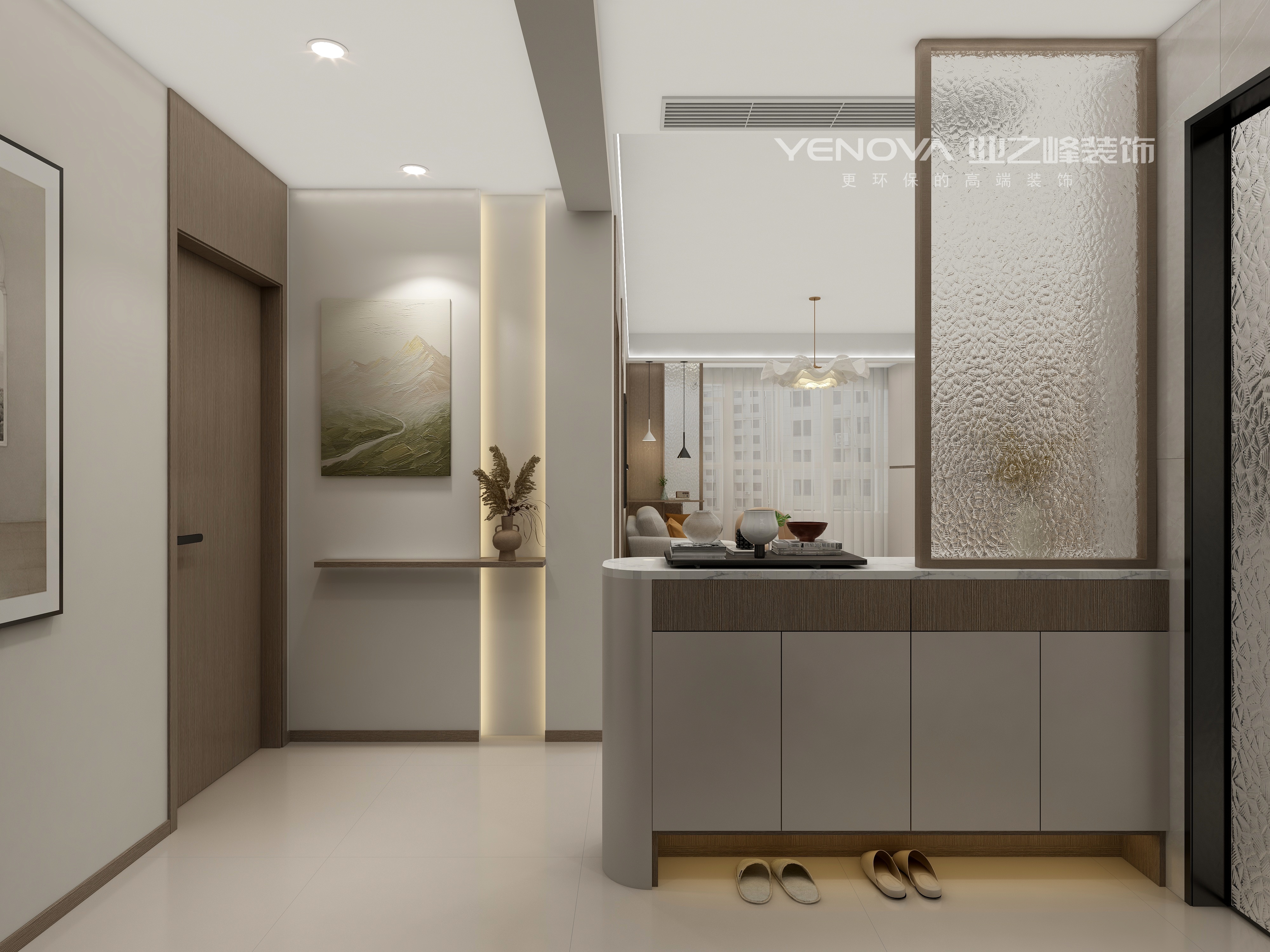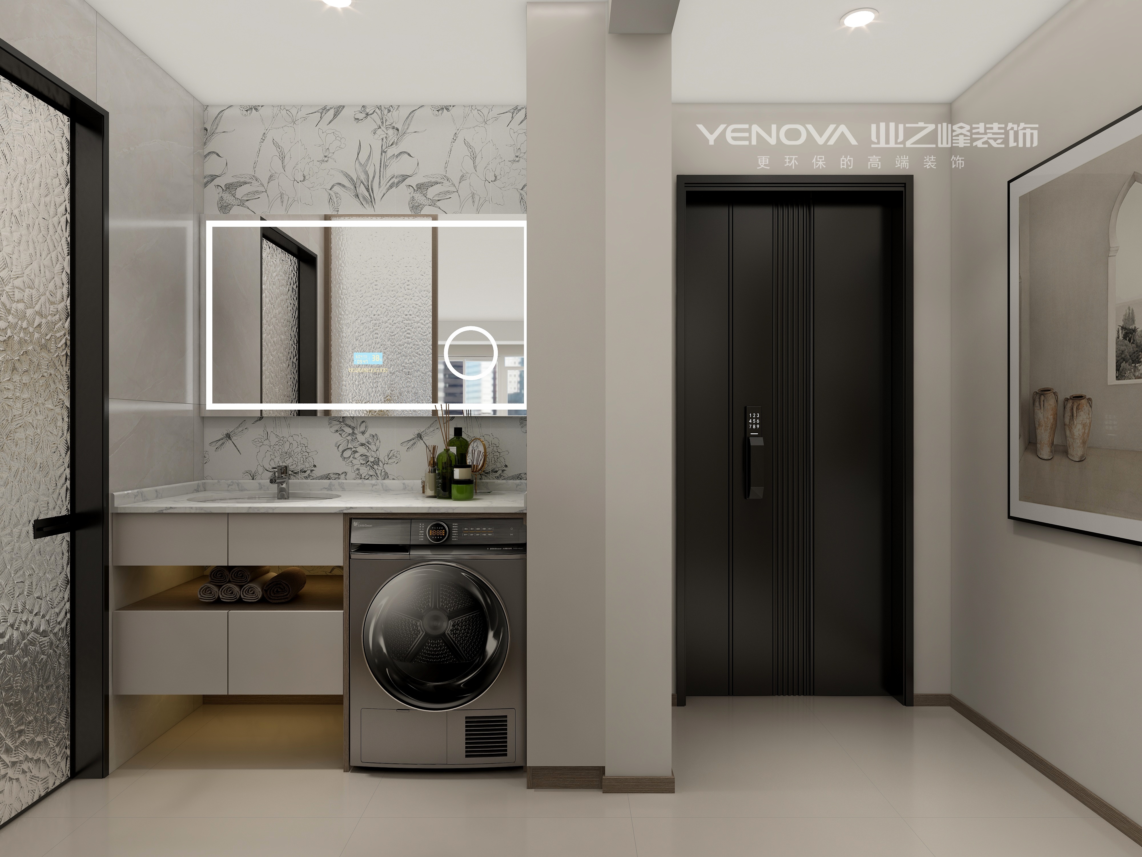 本案例属现代简约,入户处的墙面进行造型设计为点睛之笔,右手边的卫生间设计采用干湿分离,花色墙砖的搭配,使空间更加灵动,浴室柜右侧嵌入洗衣机,充分利用空间,浴室柜的对面,是入户的鞋柜,采用玻璃隔断进行视线上的舒适。