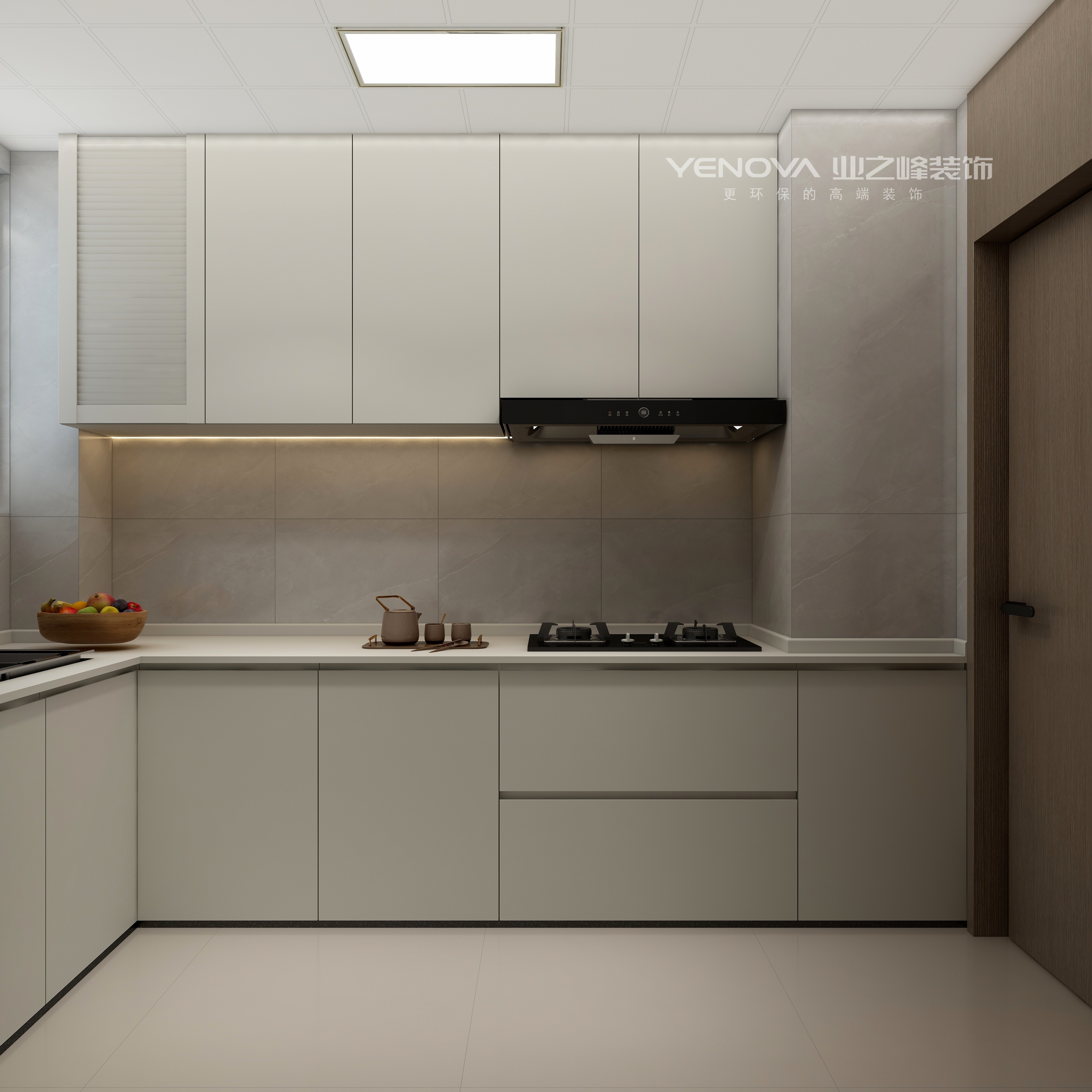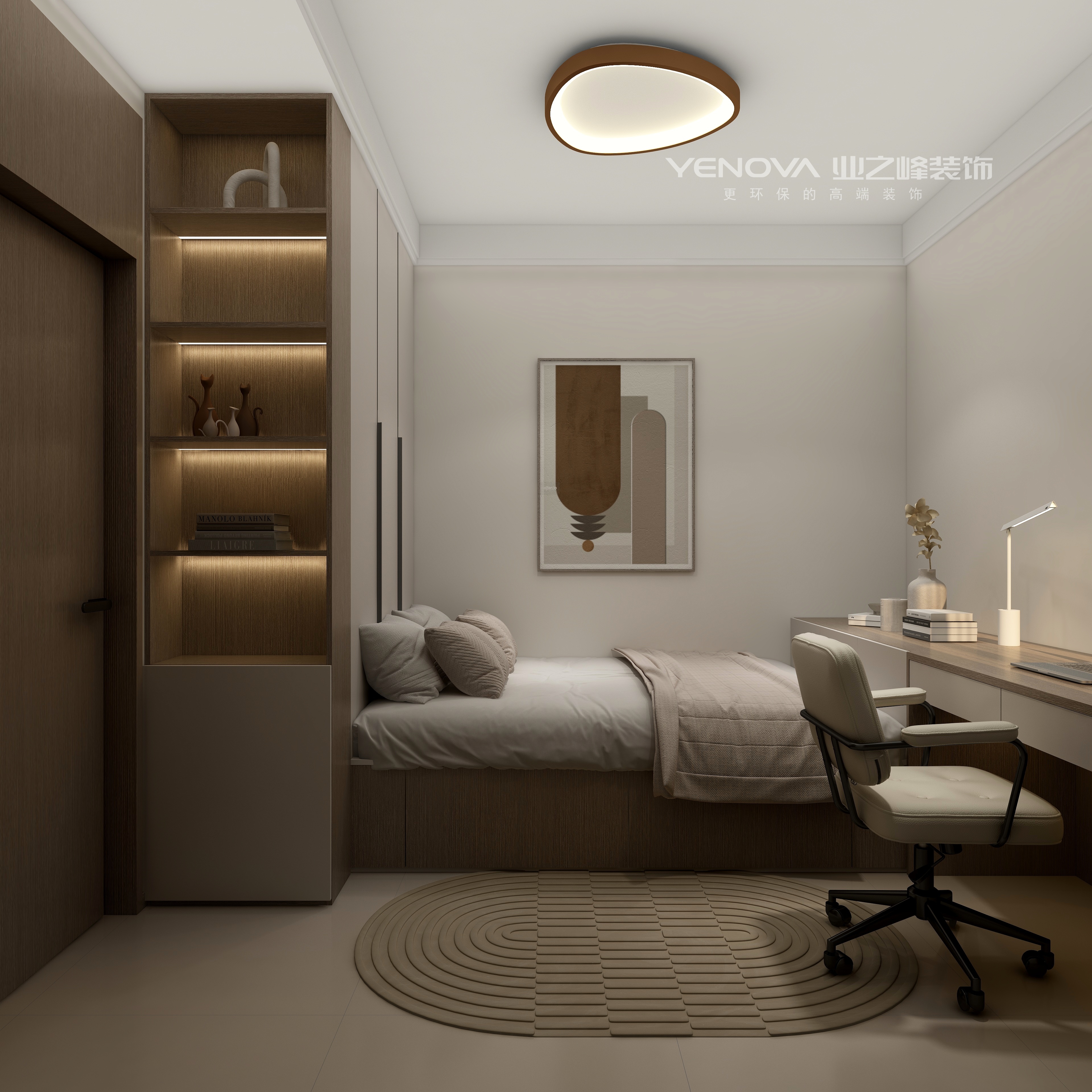厨房储物空间充分,吊柜和地柜色彩统一,整体感受舒适。卧室的设计也充分发挥储物和学习的功能,整体色彩搭配舒适。