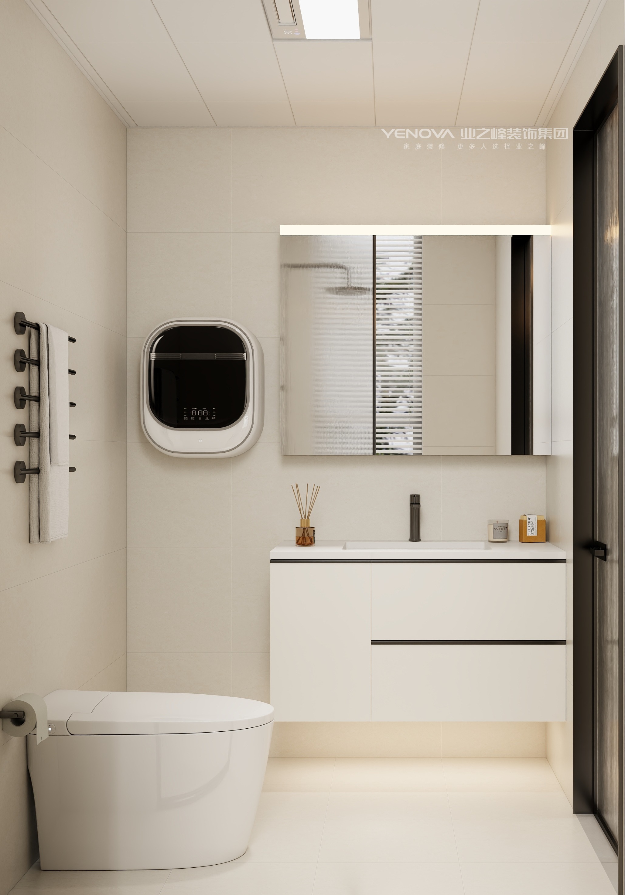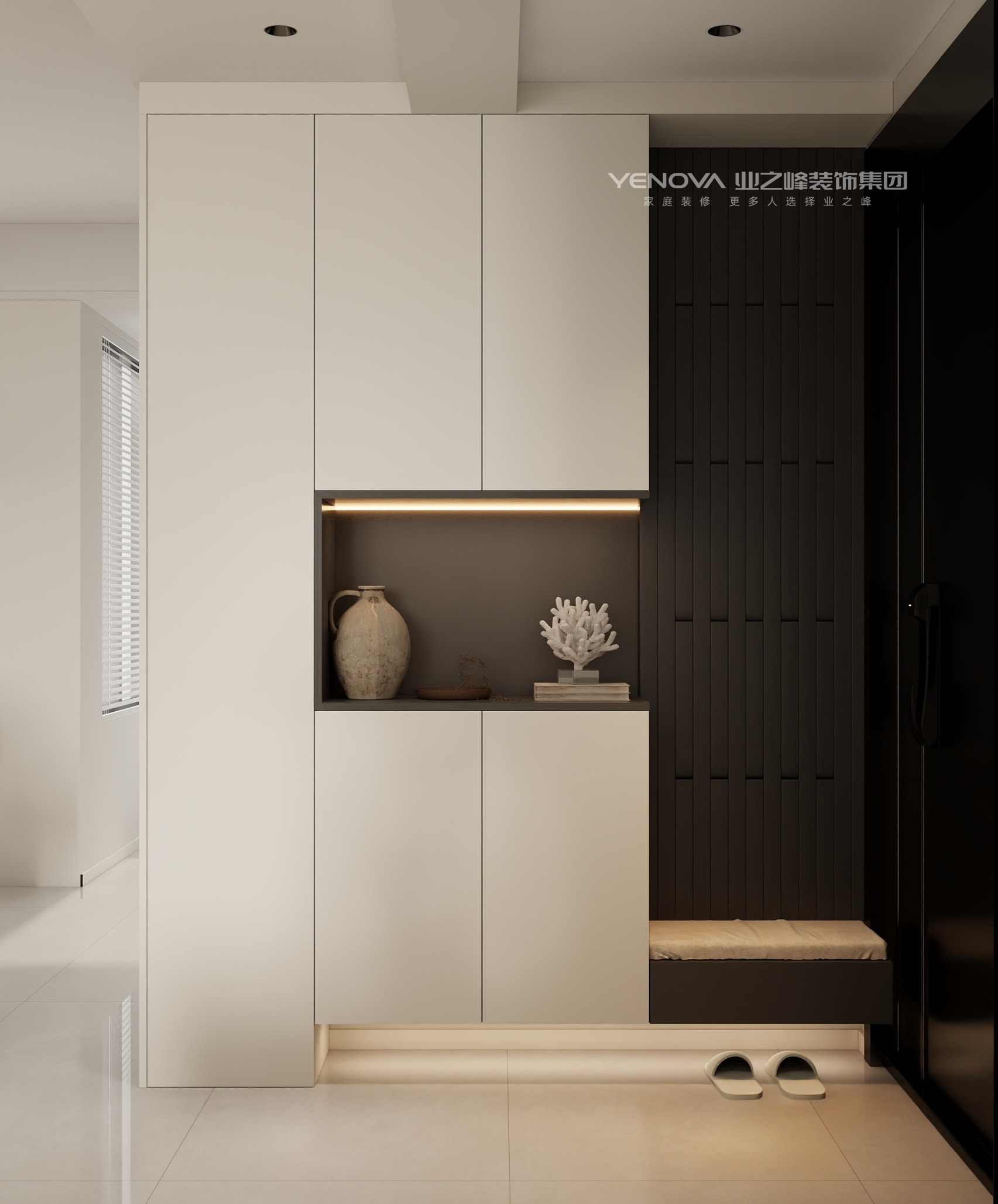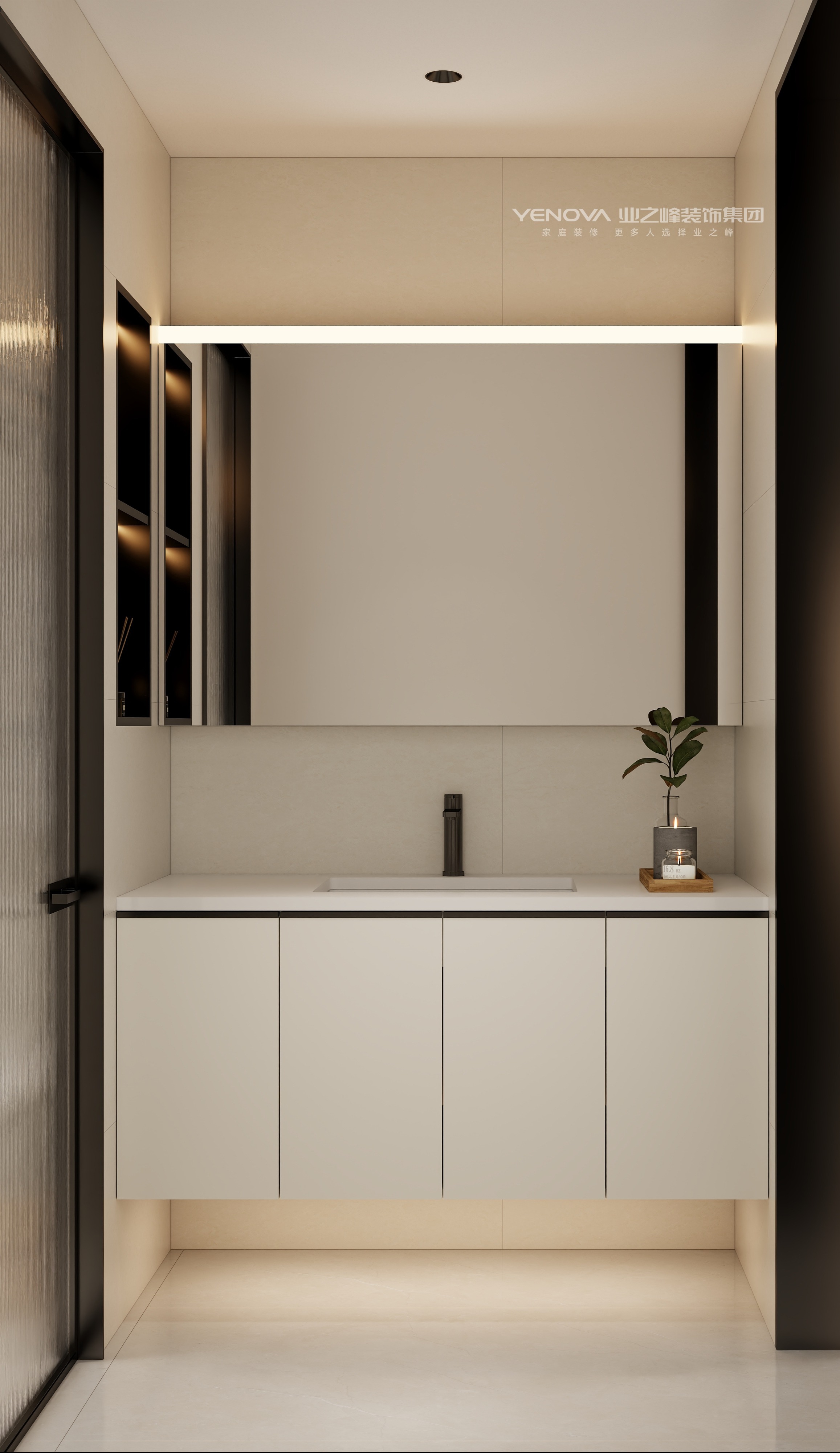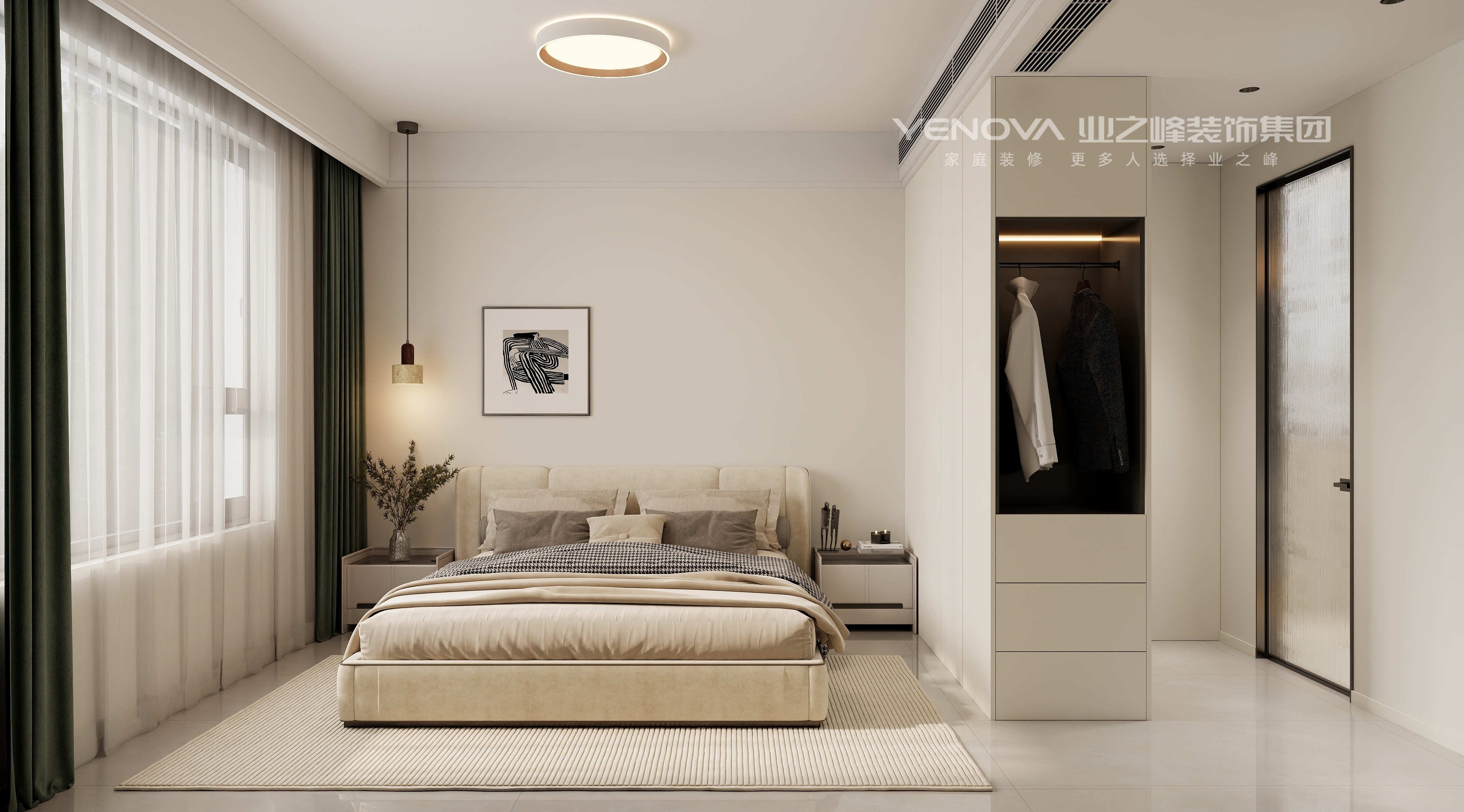 以简约现代风格为主。色彩上,大面积采用米白、浅灰等浅色调,营造出柔和、通透的氛围,局部搭配深棕、黑色,增添层次感与精致感。