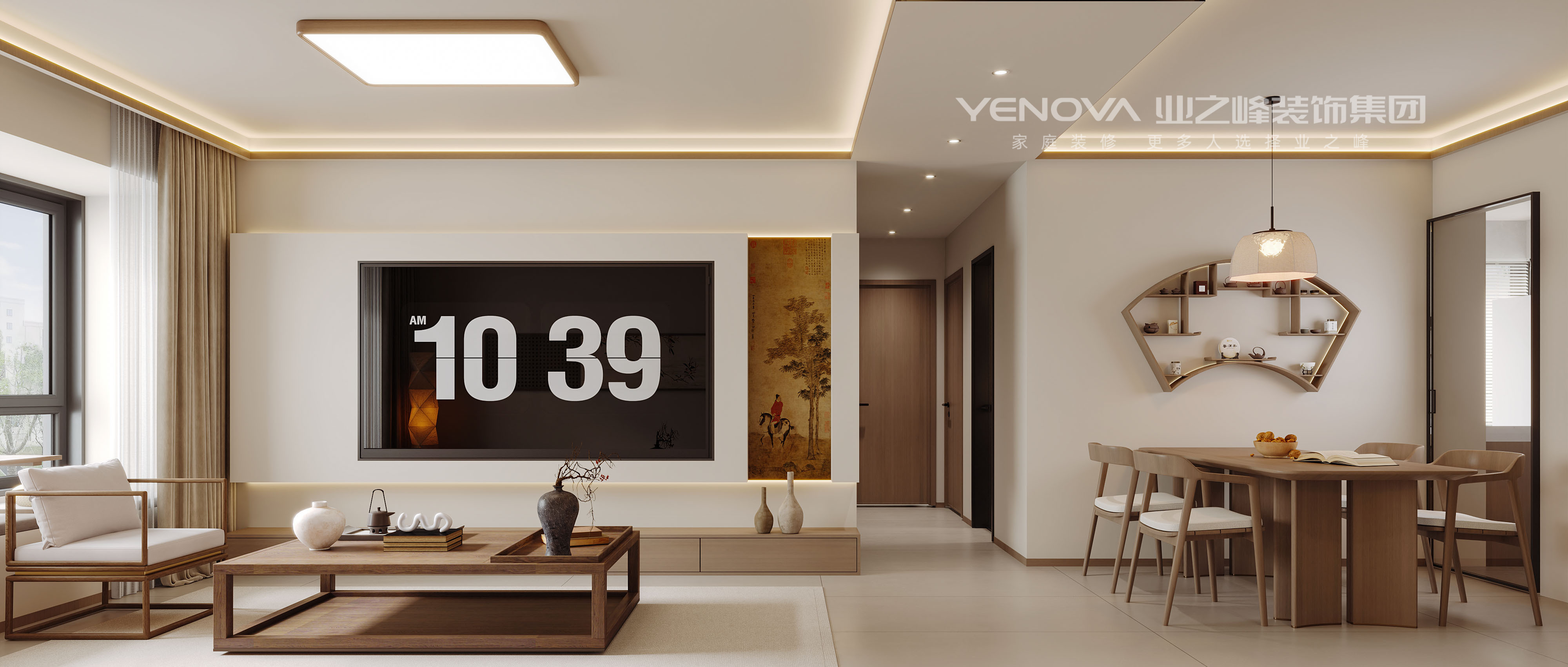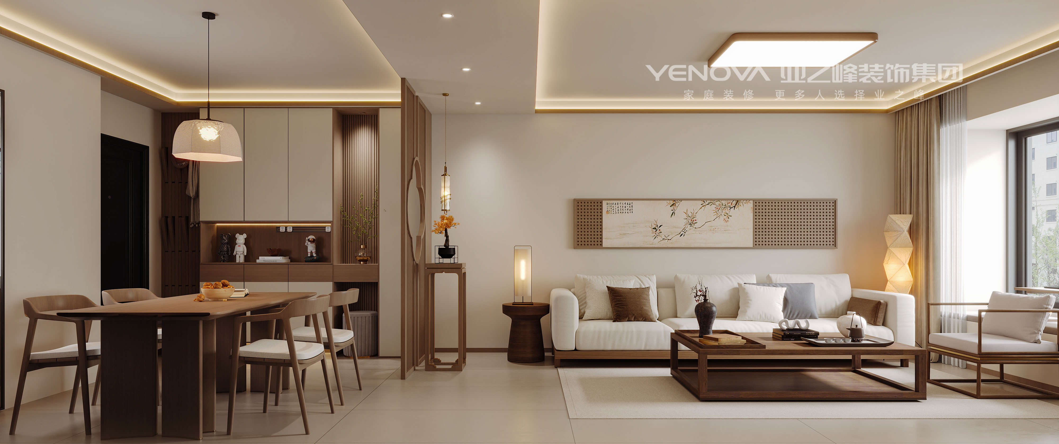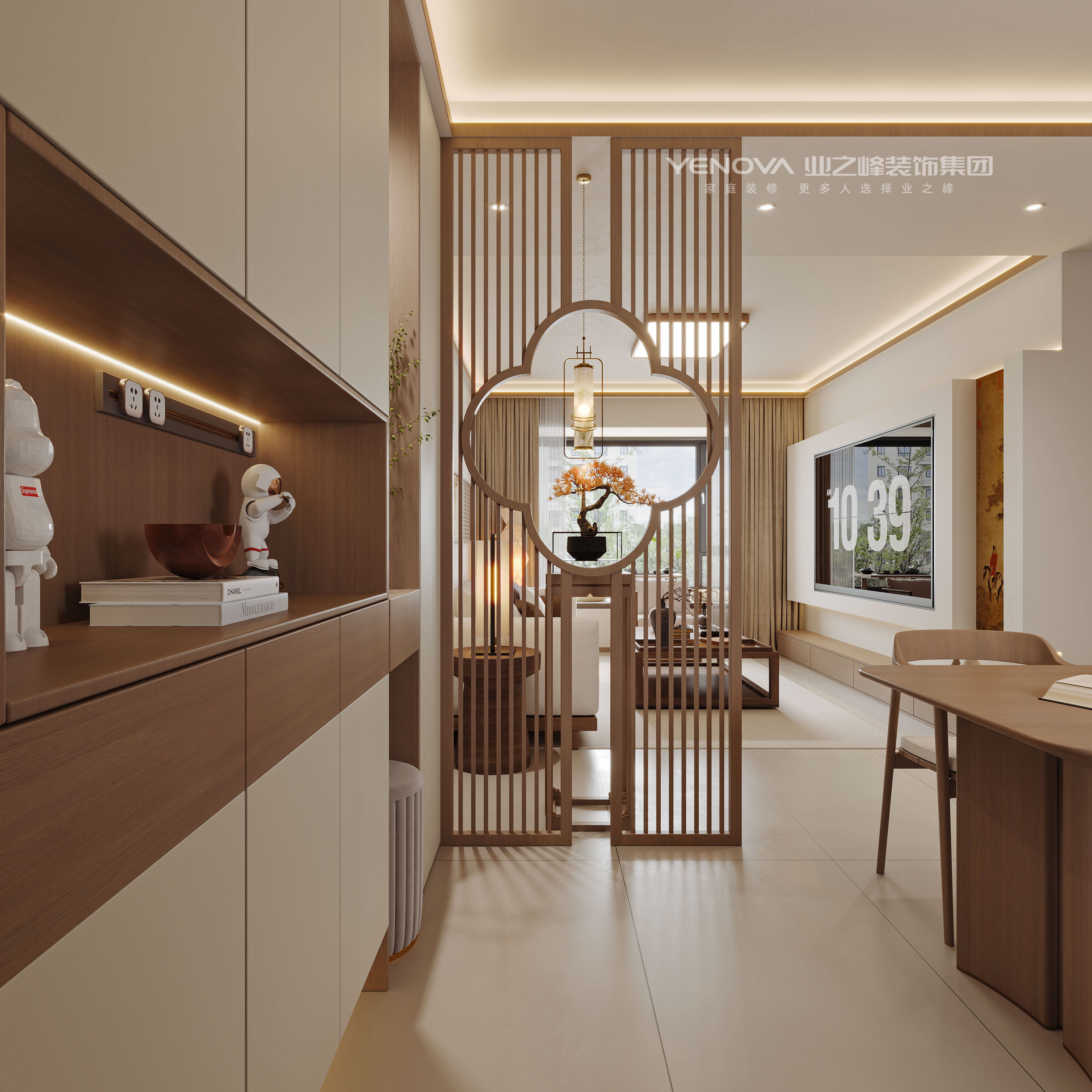 以新中式为核心,木色为底,融入屏风、扇形置物架等中式元素,借现代灯光与通透布局,勾勒典雅东方意境 。