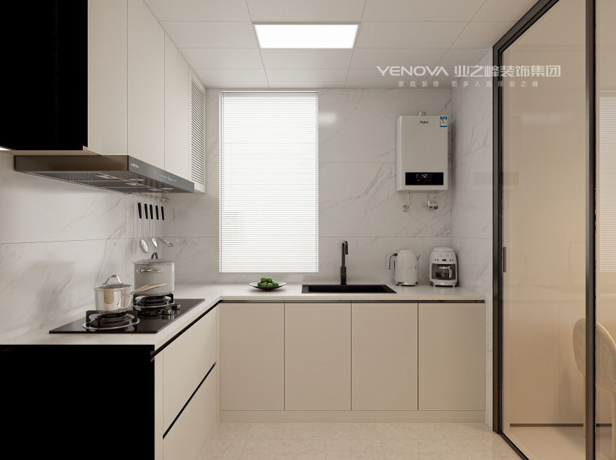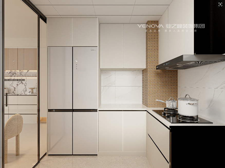 公共区域采用开阔的一体化布局,客餐厅以整墙定制柜体整合收纳与展示功能,线性灯光柔化空间边界;云朵沙发、艺术挂画与异形茶几传递出松弛的居家氛围,餐厅与西厨区的大理石纹墙面搭配木色柜体,让备餐与用餐动线自然流畅,同时成为空间质感的点睛之笔。厨房以白色柜体为基调,木色洞洞板为烹饪工具提供互动式收纳,大窗引入充沛光线,使操作场景既整洁又充满活力。