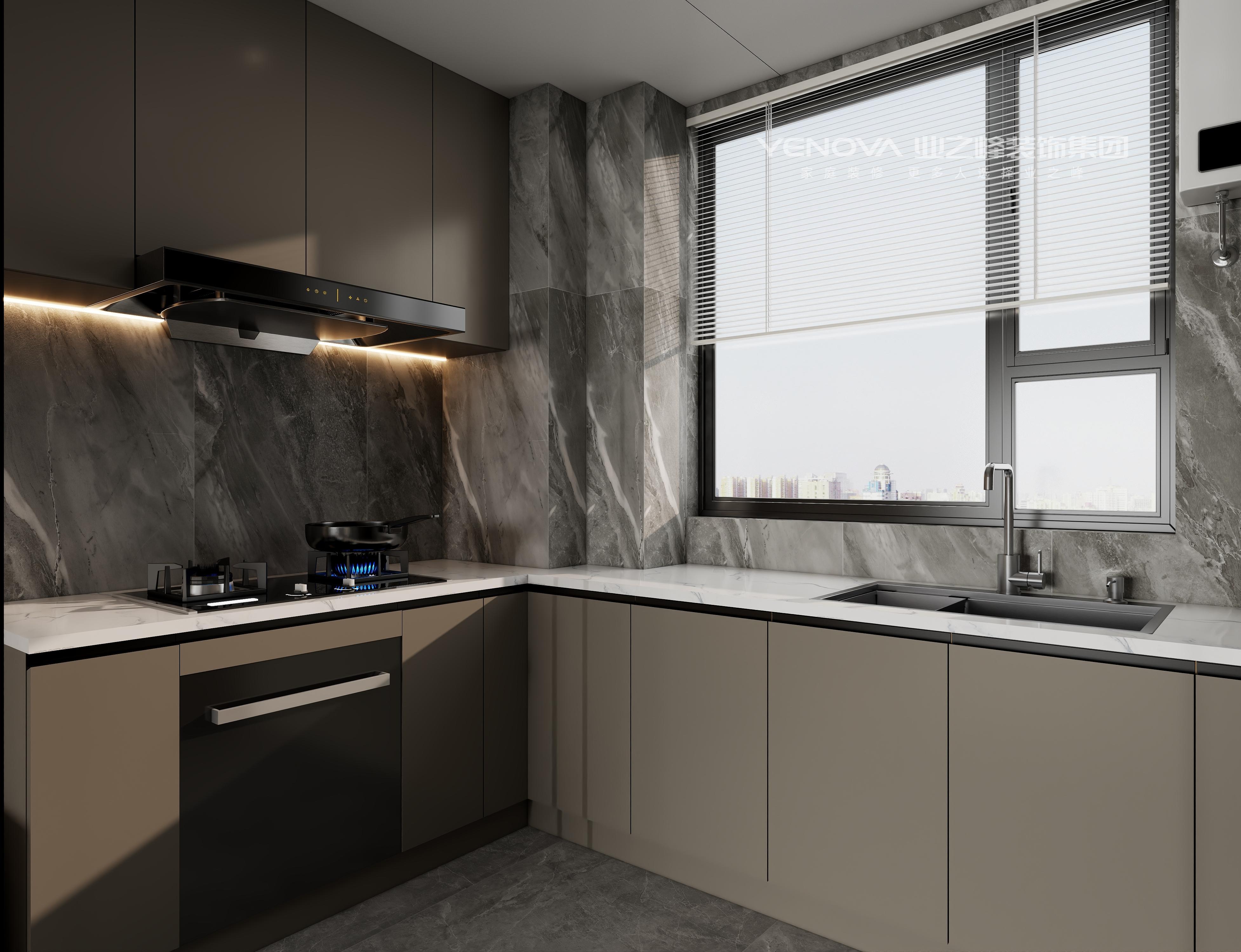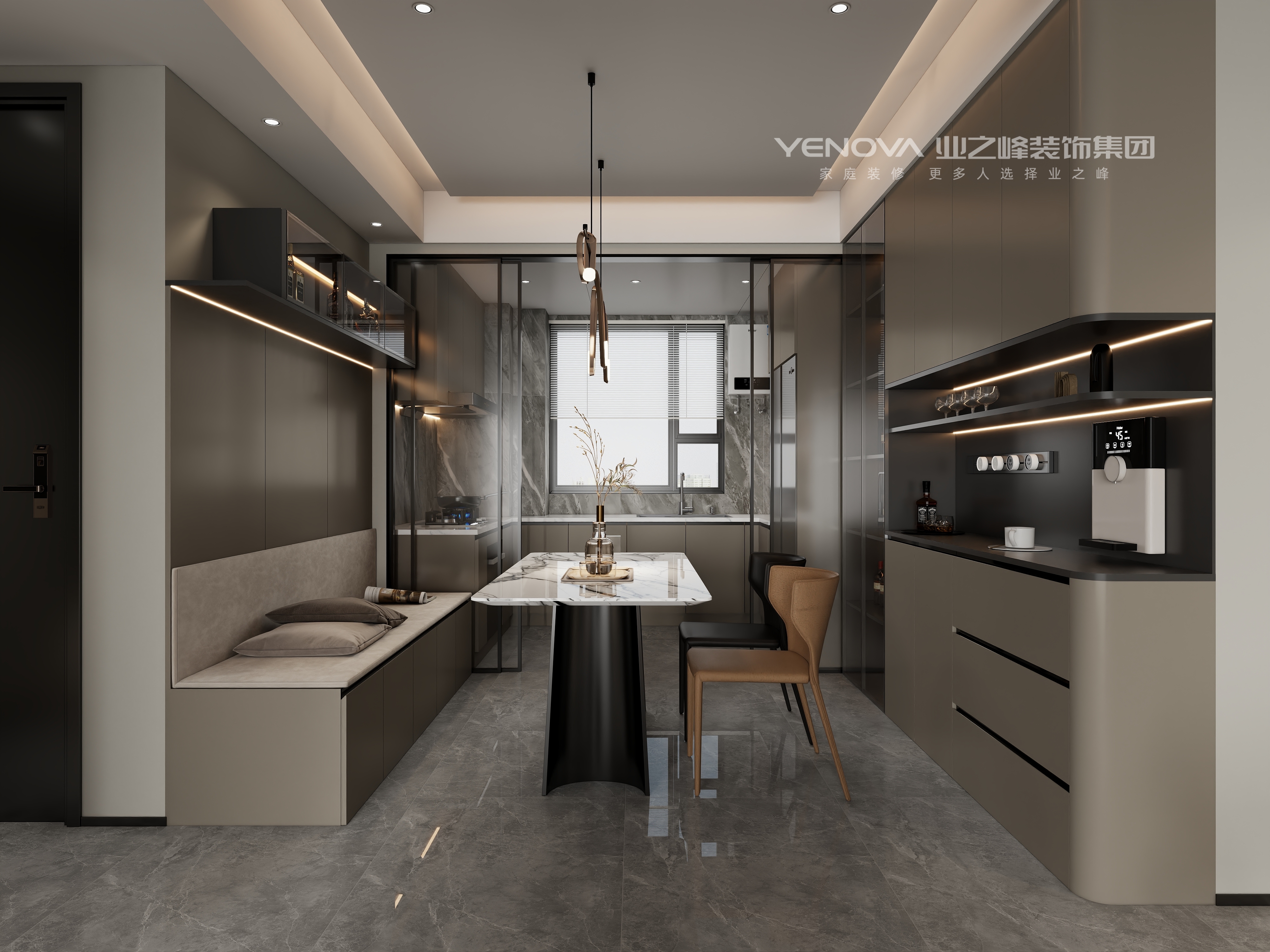 餐厨区域采用一体化设计,餐厅卡座与岩板餐桌优化小空间利用效率,玻璃隔断使厨房与餐厅 “隔而不断”,既保证烹饪区的独立,又让空间通透感得以延续;厨房以深灰石材墙面搭配哑光柜体,智能厨电与暗藏灯带的结合,让烹饪场景既精致又便捷。卫浴间则以灰色大理石纹瓷砖奠定高级基调,智能镜柜、嵌入式收纳与黑框玻璃淋浴房的组合,将科技感与整洁感融为一体,金属元素的点缀更添轻奢气质。