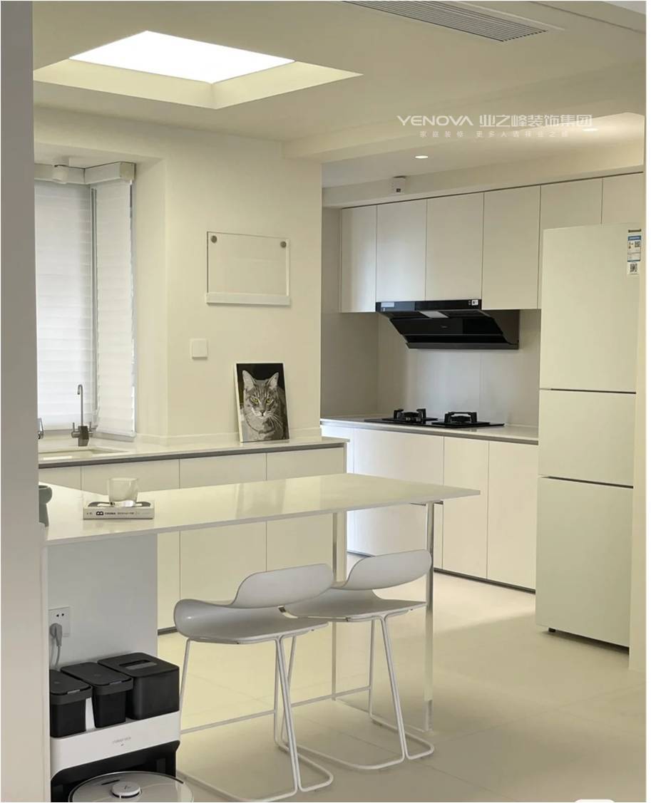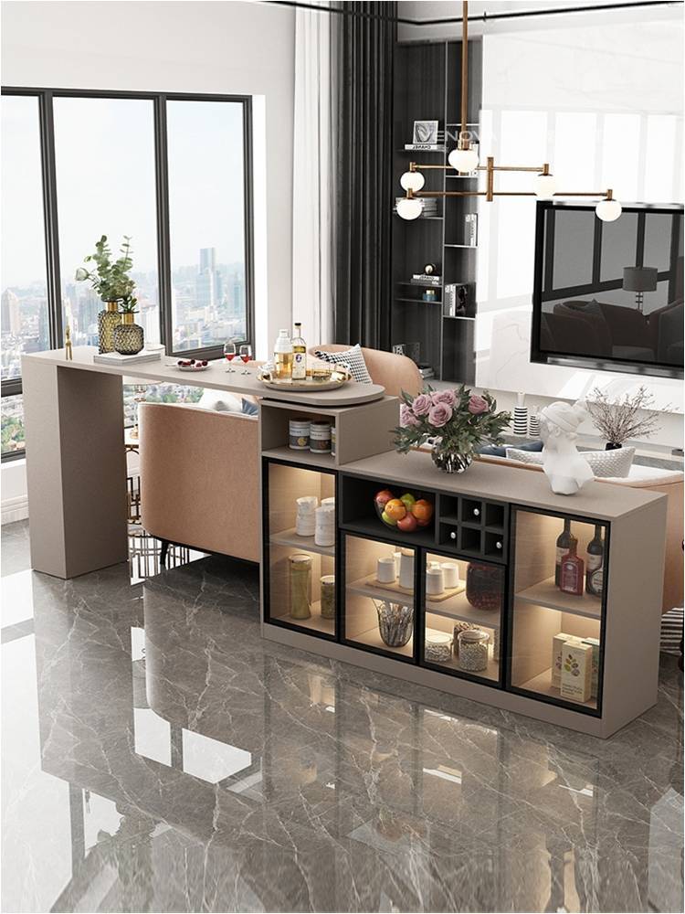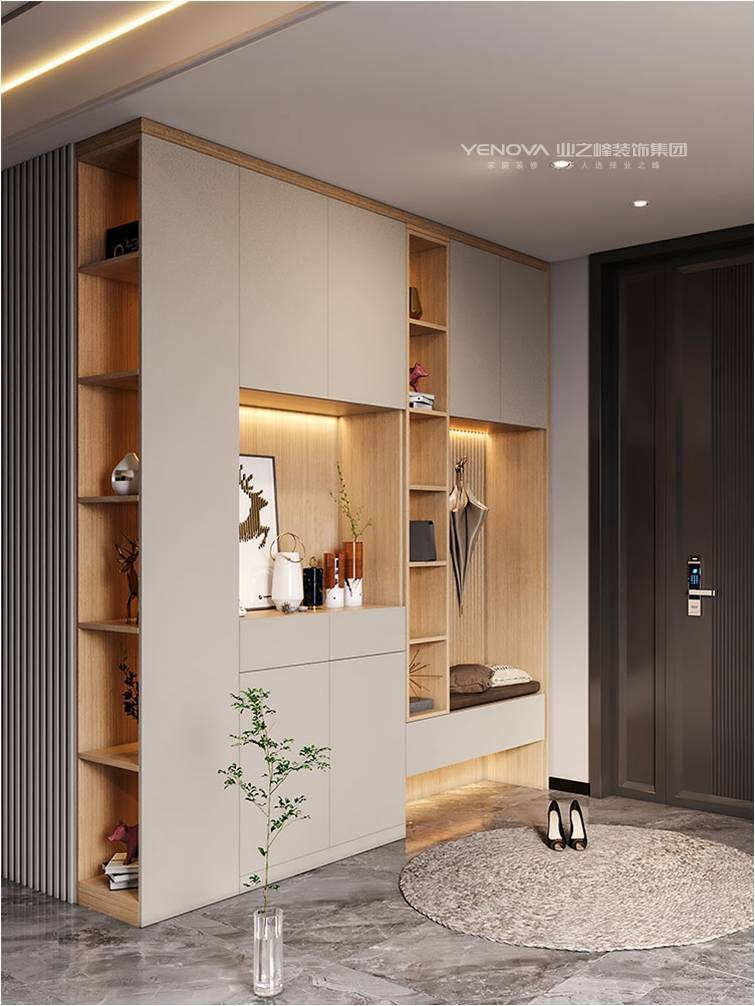 玄关以木色与浅灰柜体构建一体化收纳系统,暗藏灯带烘托出温馨的入户氛围,开放格与封闭柜的组合,既满足鞋帽杂物收纳,又能展示装饰摆件,成为空间的 “质感序章”。餐厨区域中,厨房采用纯净白色调营造明亮感,中岛吧台的加入为备餐、休闲提供互动场景;独立吧台则以黑框玻璃酒柜、暖调吊灯打造小资氛围,是品酒、办公的灵活空间。