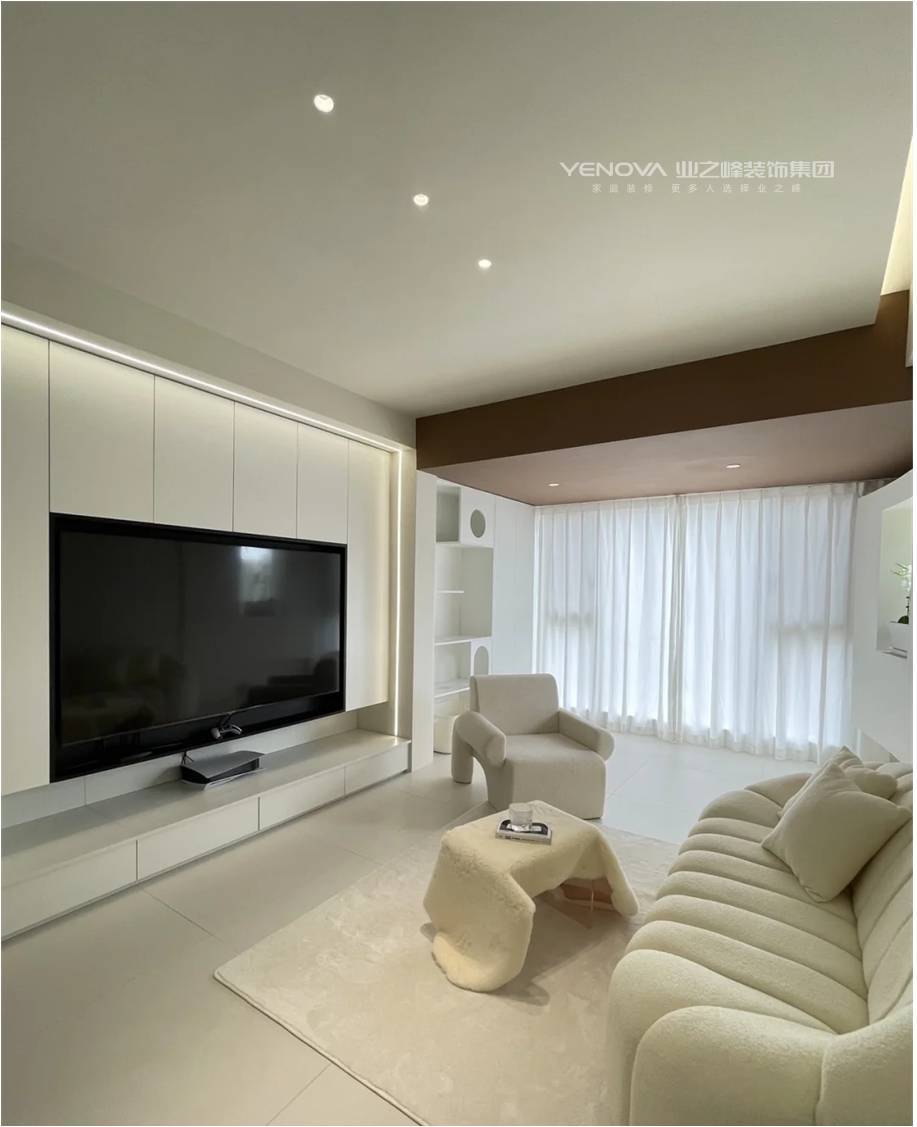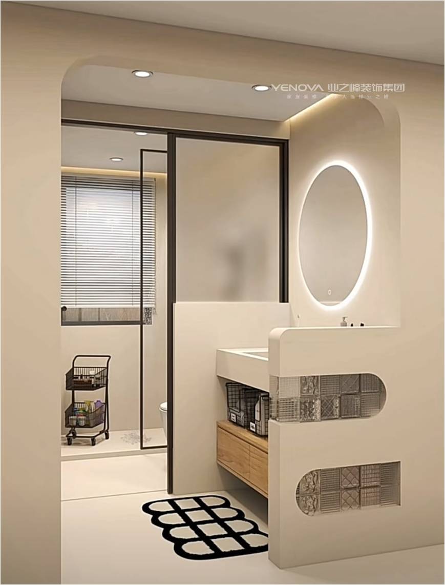 客厅延续简洁的白色基底,定制柜体整合电视墙与收纳功能,线性灯带与点光源交织出层次,柔质沙发与艺术感小几传递出松弛的居家氛围。卫浴间运用弧形门洞、玻璃砖与发光镜等元素,弱化空间硬朗感,移动收纳推车与分层柜体让洗漱场景更有序,细节处尽显巧思。