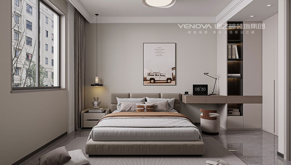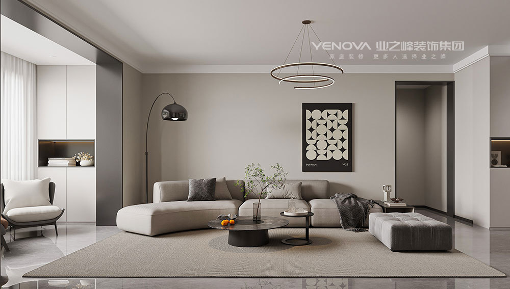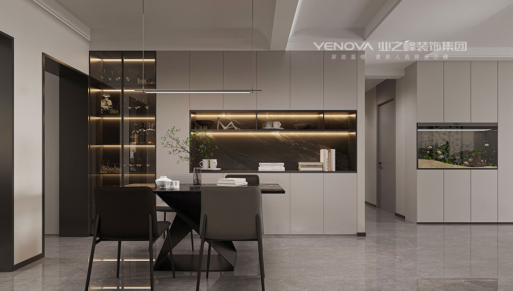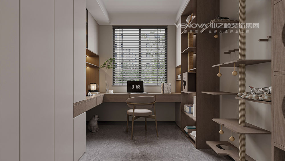 本案以实用主义为核心,电视墙摒弃传统造型,采用整体储物柜设计,并巧妙嵌入生态鱼缸,赋予空间生机与灵动感。上方吊顶隐藏电动投影幕布,实现影音功能的无痕切换。餐厅区域,玻璃柜门餐边柜提升展示效果,中央横梁通过圆弧吊顶柔化处理,消弭结构压迫感。书房特别设置猫爬架,将宠物需求融入生活空间。全屋通过功能性设计语言,在满足储物与生活需求的同时,营造出简约而富有温度的家居氛围。