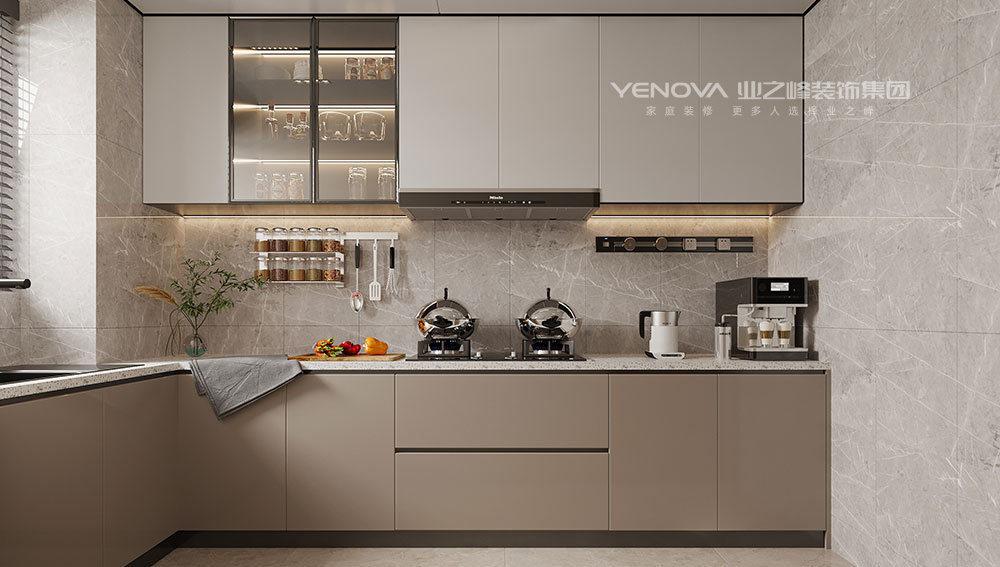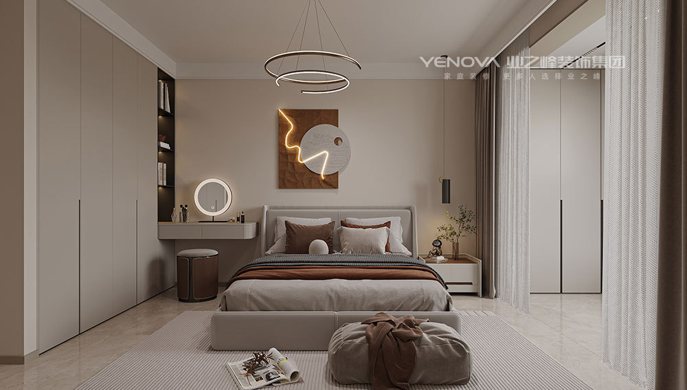 本案以暖咖色为主基调,搭配温润木纹墙板,营造温馨舒适的居家氛围。客餐厅通过吊灯与射灯组合,打造柔和的光环境。电视墙以简约墙板造型呈现,结合隐形门设计,保持视觉整体性。