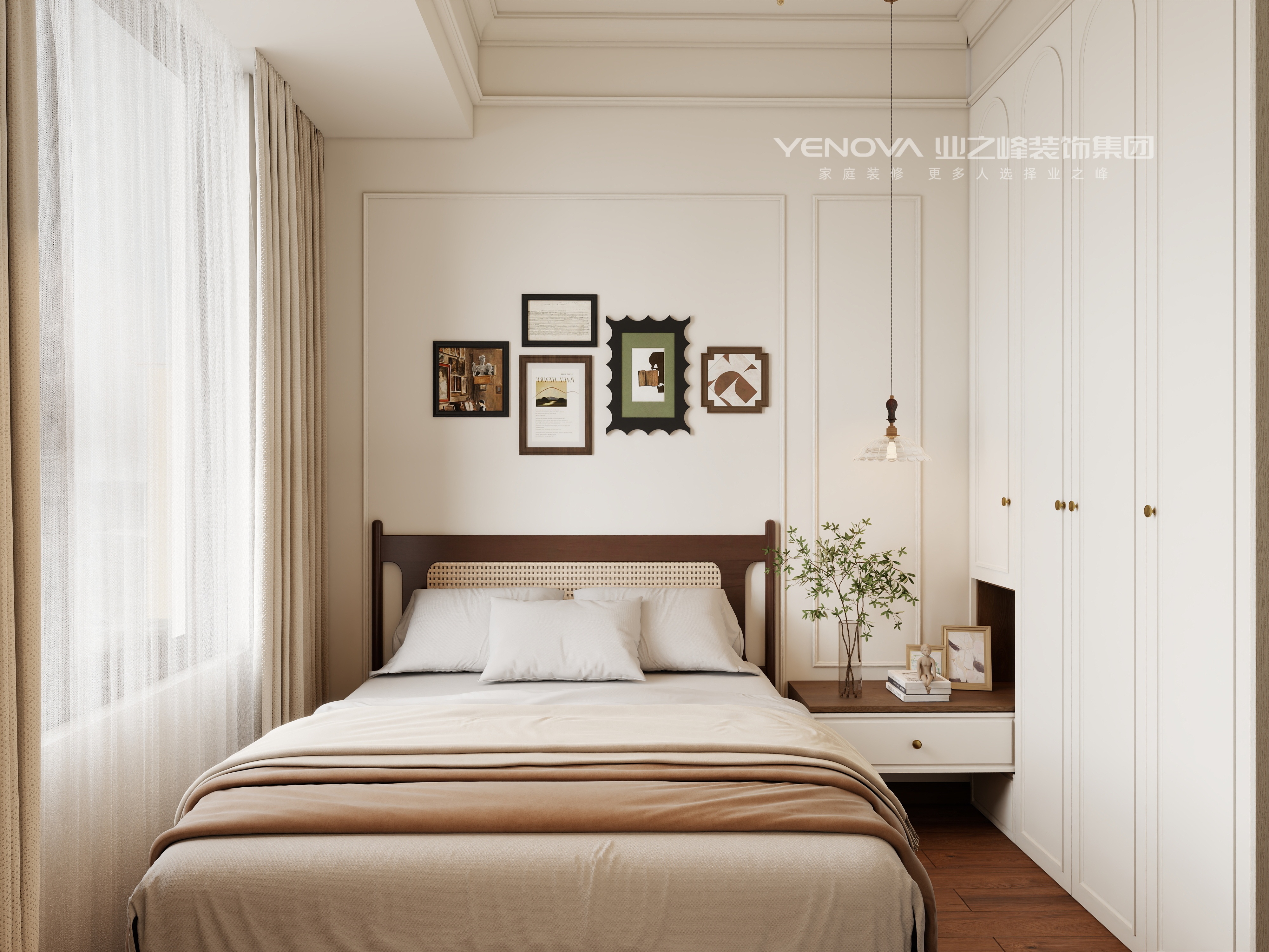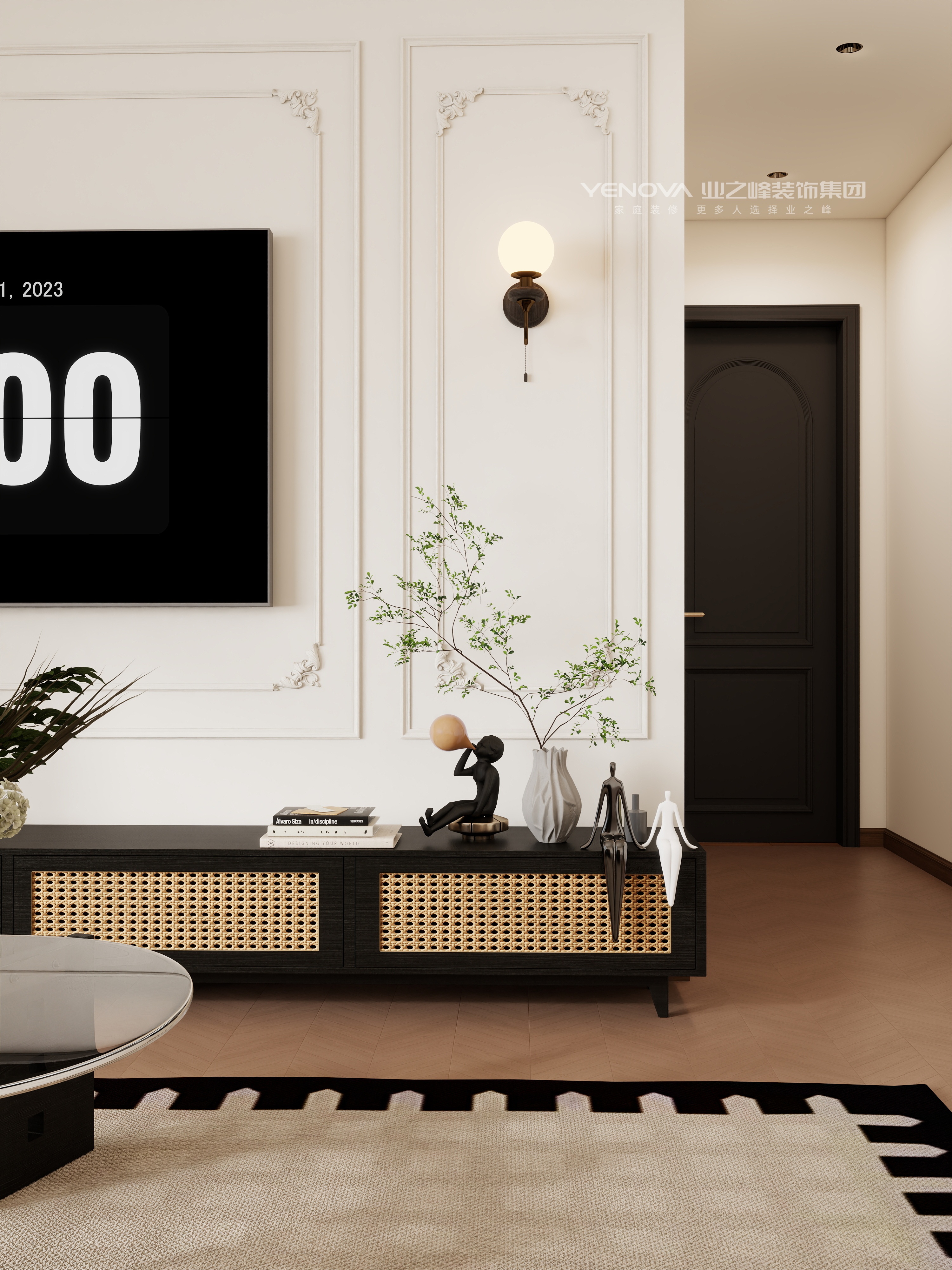 在色彩运用上,以柔和的白色为主色调,营造出明亮、通透的氛围,搭配深色的家具与门饰,形成鲜明对比,增添了空间的层次感与视觉焦点。