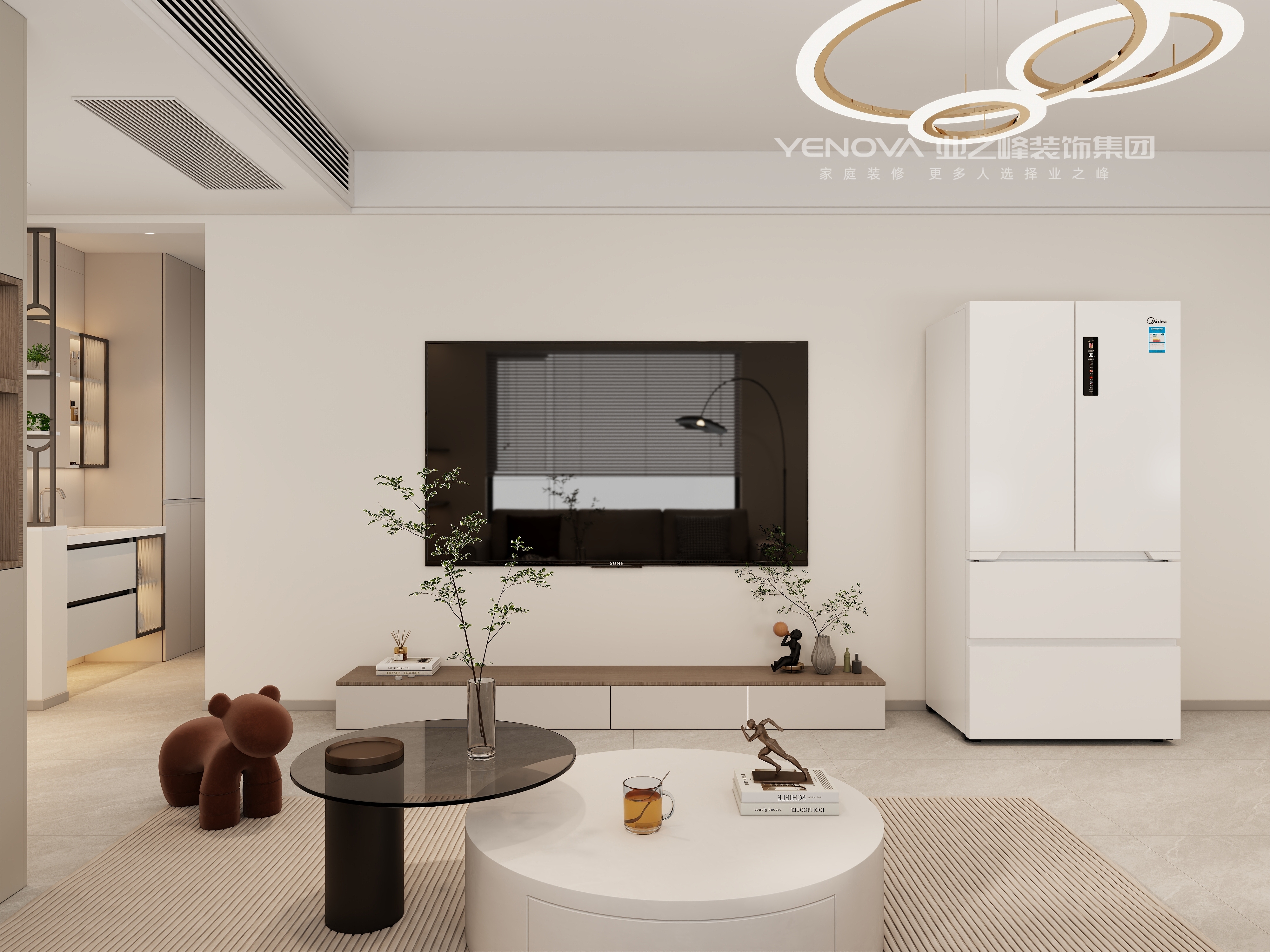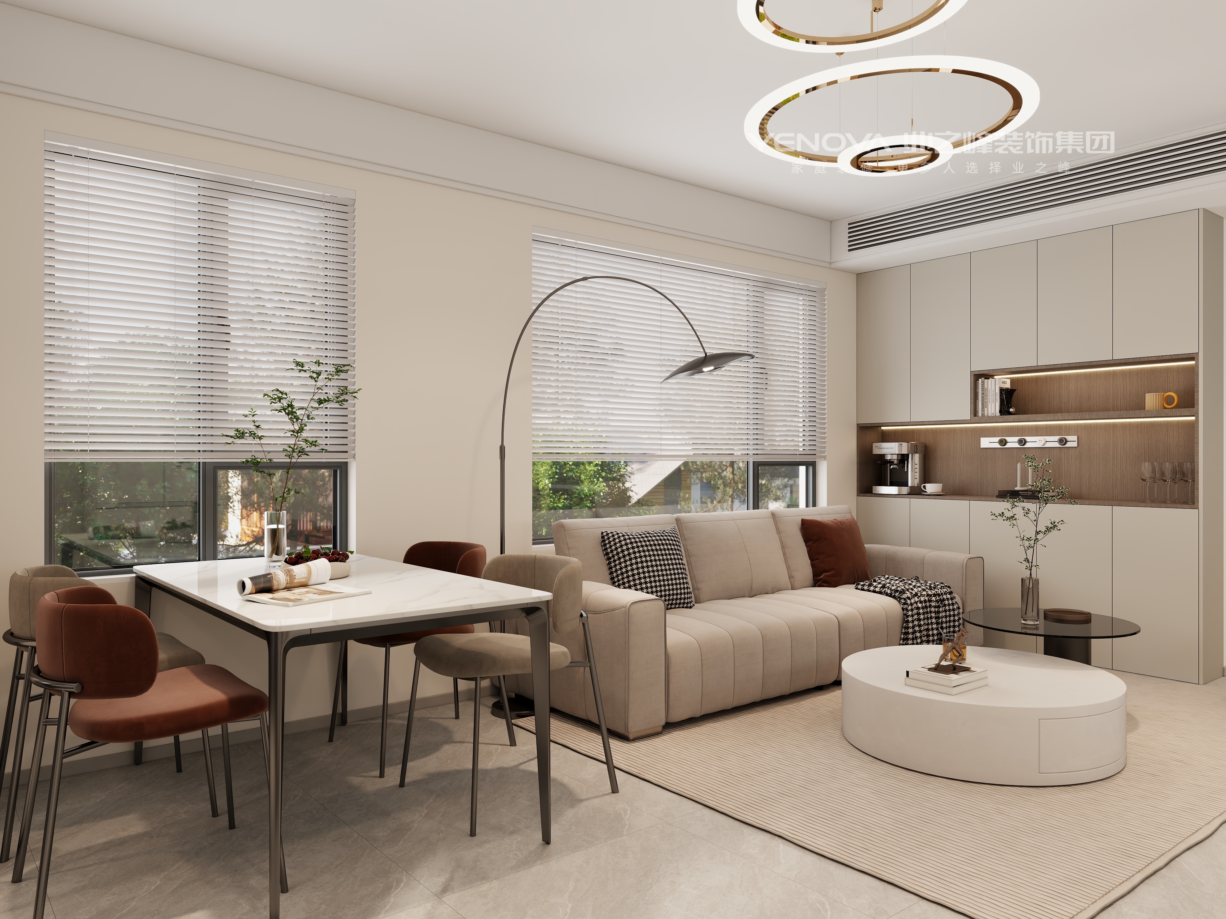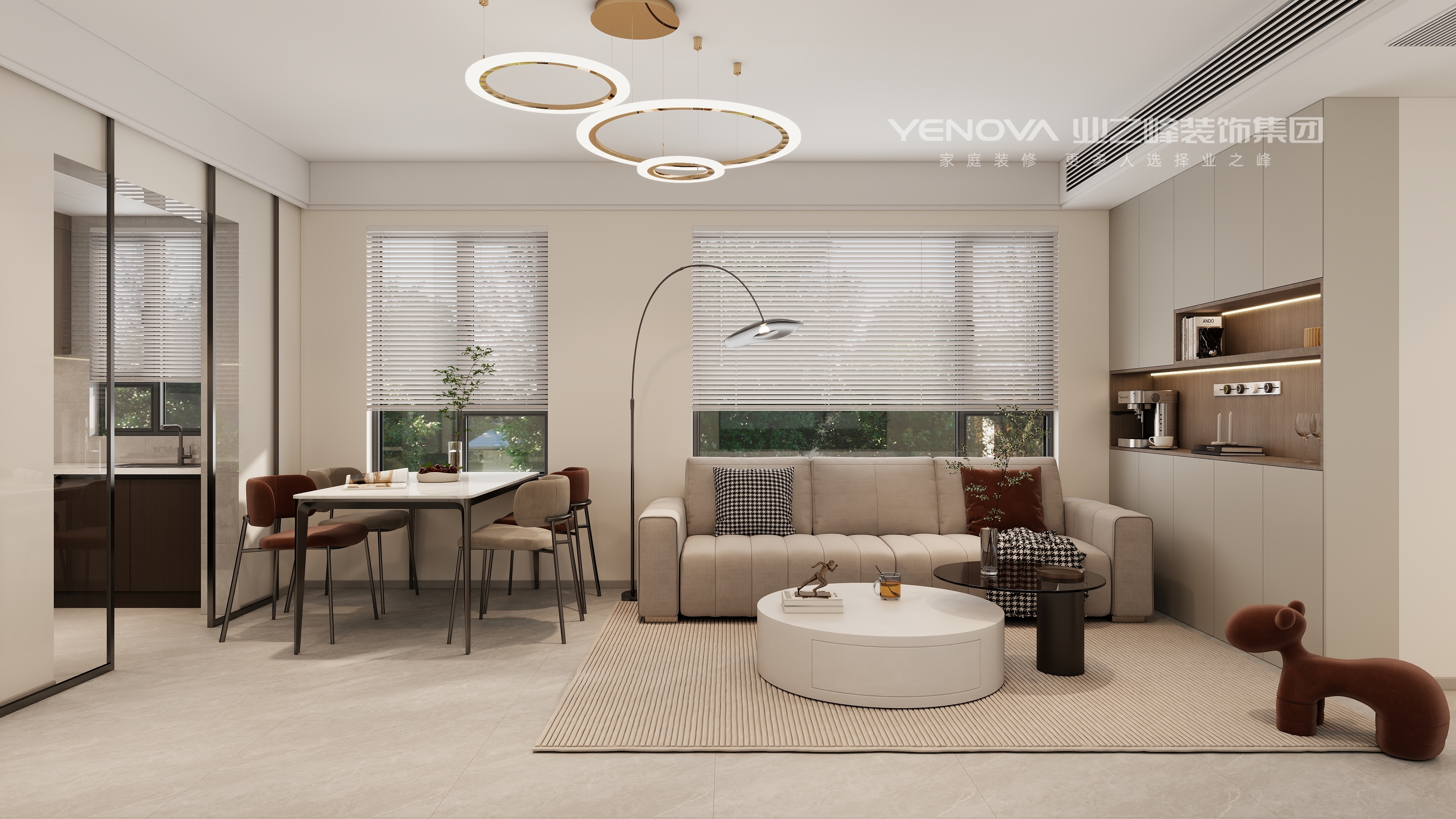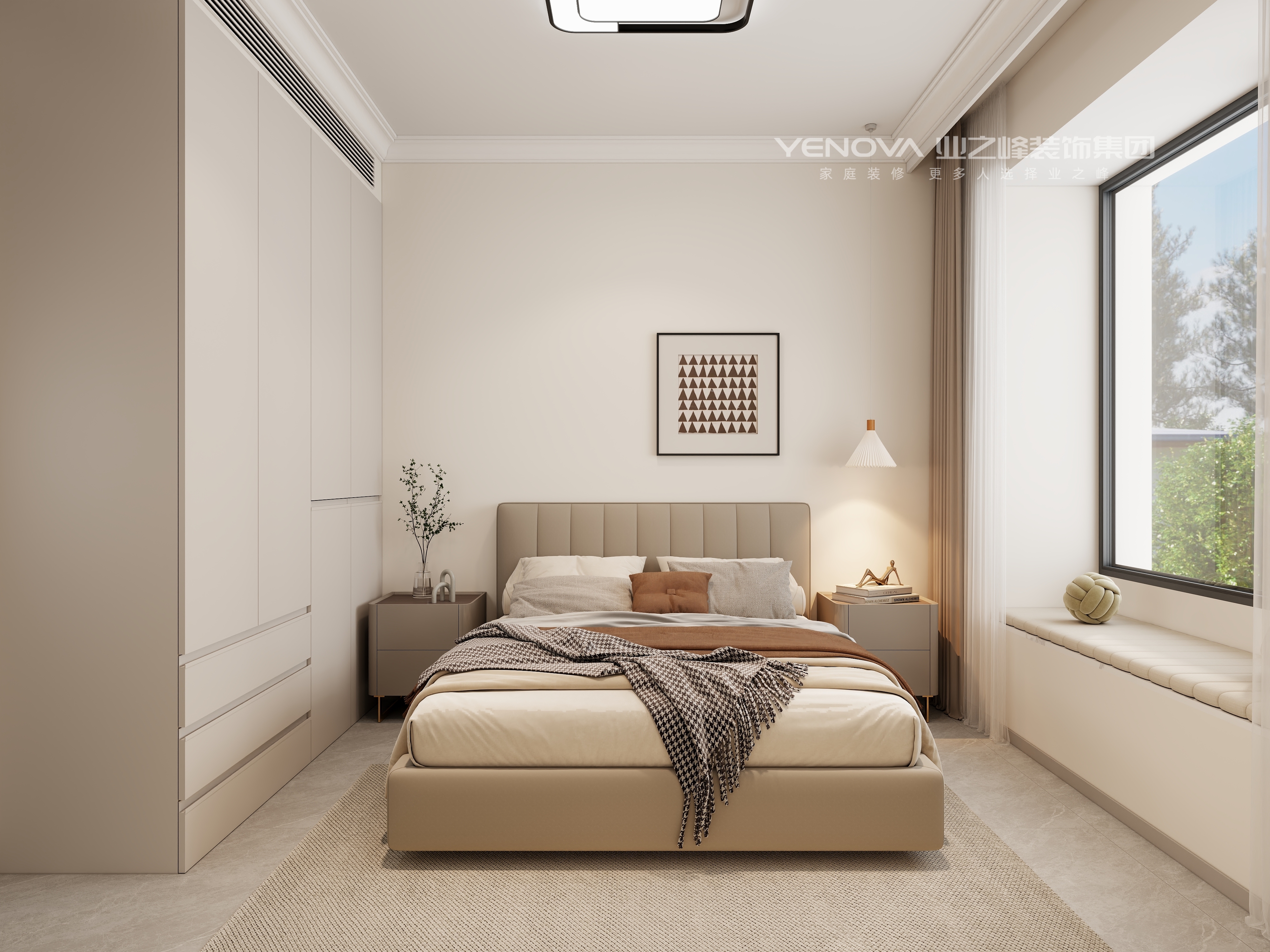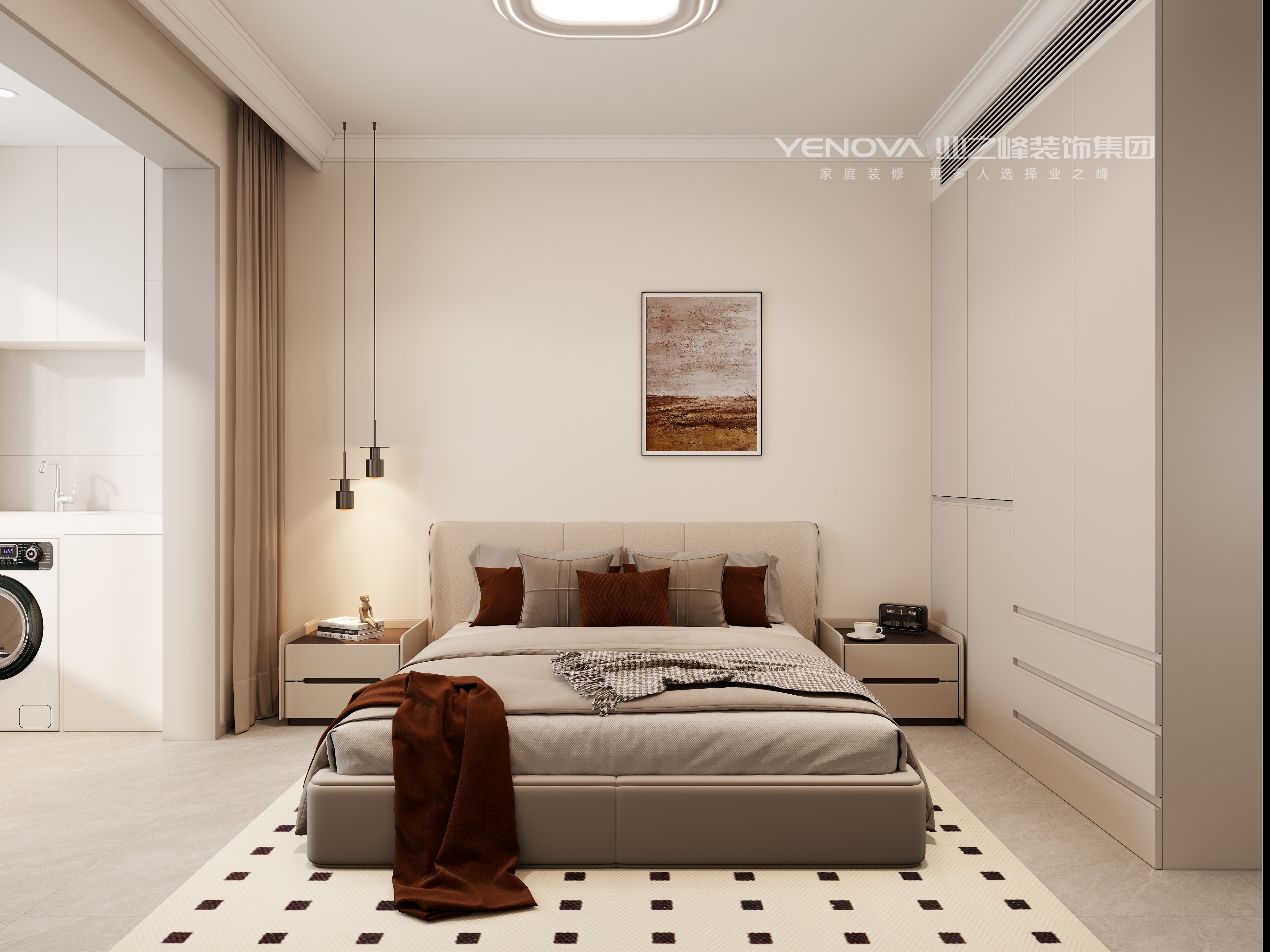 客厅以简洁电视墙为核心,木质电视柜与空间色调呼应,搭配绿植、香薰等软装传递生活温度;创意小熊坐凳与圆形茶几为空间注入活泼感。餐厅区域透过玻璃门与厨房相连,采光极佳,现代感十足的圆环吊灯为用餐区增添韵律;客餐厅动线流畅、开阔通透,共同构建出温馨宜人的家庭核心活动区。厨房深棕与浅米色调碰撞,打造沉稳实用的烹饪场域。充足的吊柜与地柜满足储物需求,不锈钢烟机现代感十足,墙面浅色系瓷砖易清洁,操作台上方灯带增强操作照明,让烹饪过程便捷舒适;整体布局紧凑且功能完备,是烟火气与设计感的融合卧室以柔和的米白与暖棕为主色调,营造静谧休憩氛围。浅棕色软包床头简约大气,米色床品、棕色靠枕与格纹毛毯层次交织,既丰富触觉质感,又让视觉更具层次。一侧定制大衣柜满足收纳需求,另一侧飘窗引入充足自然光线,窗台装饰球为空间注入生活意趣;墙面几何装饰画、床头柜的简约台灯与绿植相衬,让休憩空间兼具美学质感与温馨感。卫生间聚焦 “实用与美学平衡”。白色台盆柜搭配抽屉式收纳,方便日常物品整理;镜柜结合灯带与开放格,既满足梳妆照明,又能随手拿取洗漱用品。侧边玻璃纹理隔断柜 “透光不透视”,可收纳毛巾等物品,兼具私密性与展示性;墙面绿植点缀更让卫浴空间充满生机,纯净统一的色调尽显整洁雅致。卧室以柔和的米白与暖棕为主色调,营造静谧休憩氛围。浅棕色软包床头简约大气,米色床品、棕色靠枕与格纹毛毯层次交织,既丰富触觉质感,又让视觉更具层次。一侧定制大衣柜满足收纳需求,另一侧飘窗引入充足自然光线,窗台装饰球为空间注入生活意趣;墙面几何装饰画、床头柜的简约台灯与绿植相衬,让休憩空间兼具美学质感与温馨感。