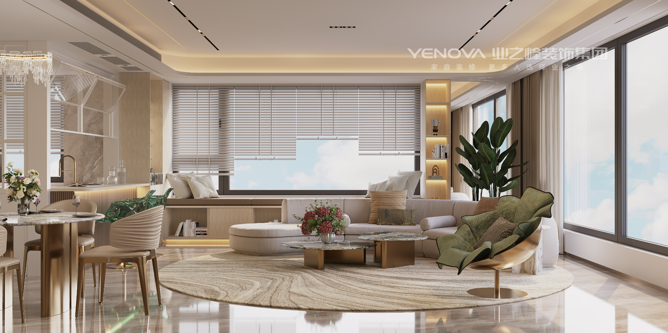 主色调:以米白、浅灰、奶茶色等低饱和度“柔和色”为主,奠定空间的温馨与高级感,适配大空间的通透需求。