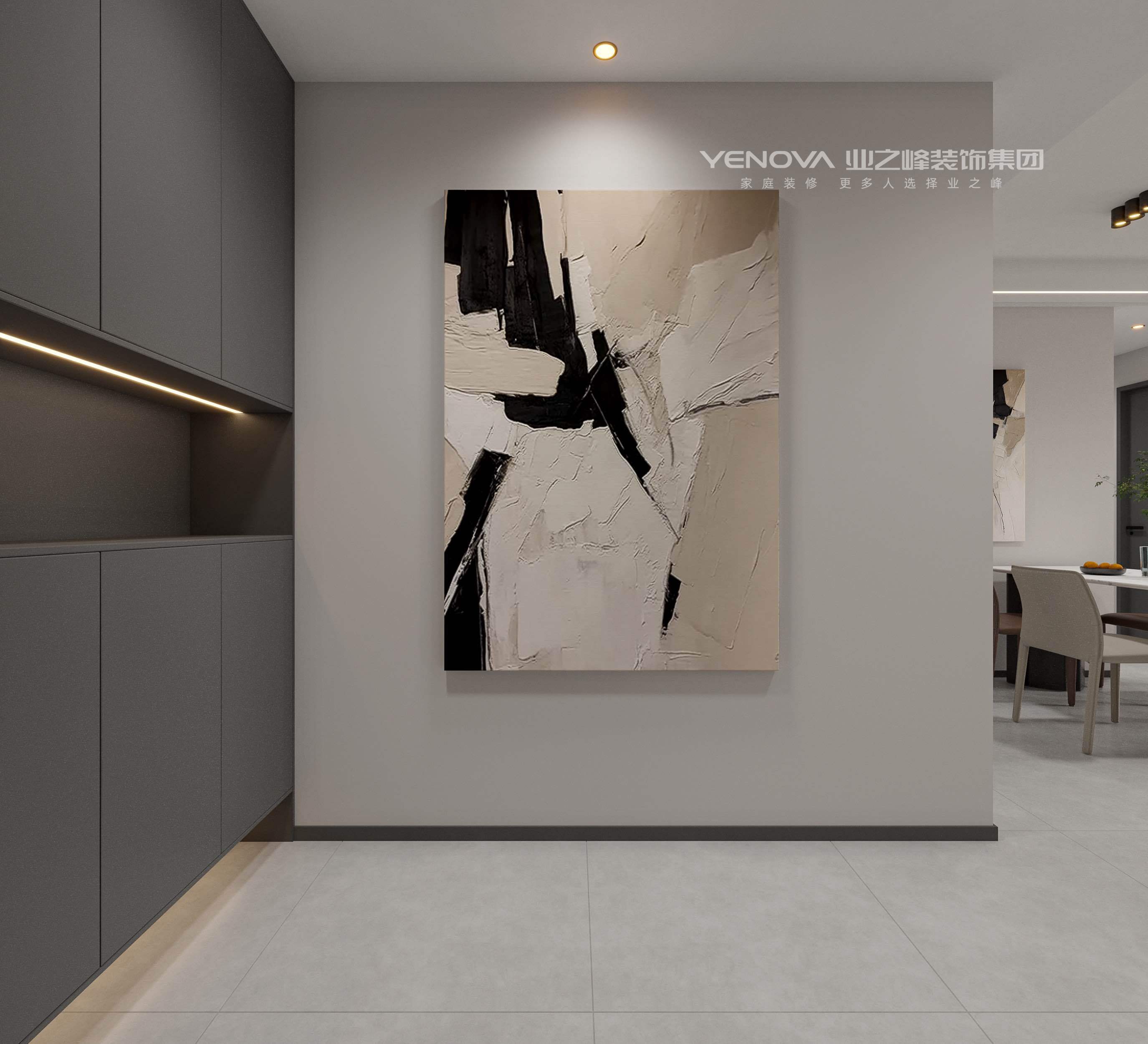 公共区域采用客餐厨一体化设计,强化空间通透感。客厅以灰白为主调,电视背景墙整合收纳与展示功能,深灰柜体与浅色墙面形成视觉层次;线性灯与点光源交织,让灯光兼具实用性与精致感。餐厅延续整体色调,简洁餐桌搭配质感餐椅,旁侧柜体兼顾收纳与 “咖啡角” 功能,为日常休闲增添便利与仪式感。过渡区域的抽象艺术挂画,以黑白灰肌理丰富视觉,与暗藏灯光的柜体相衬,让走廊成为艺术延伸的载体。