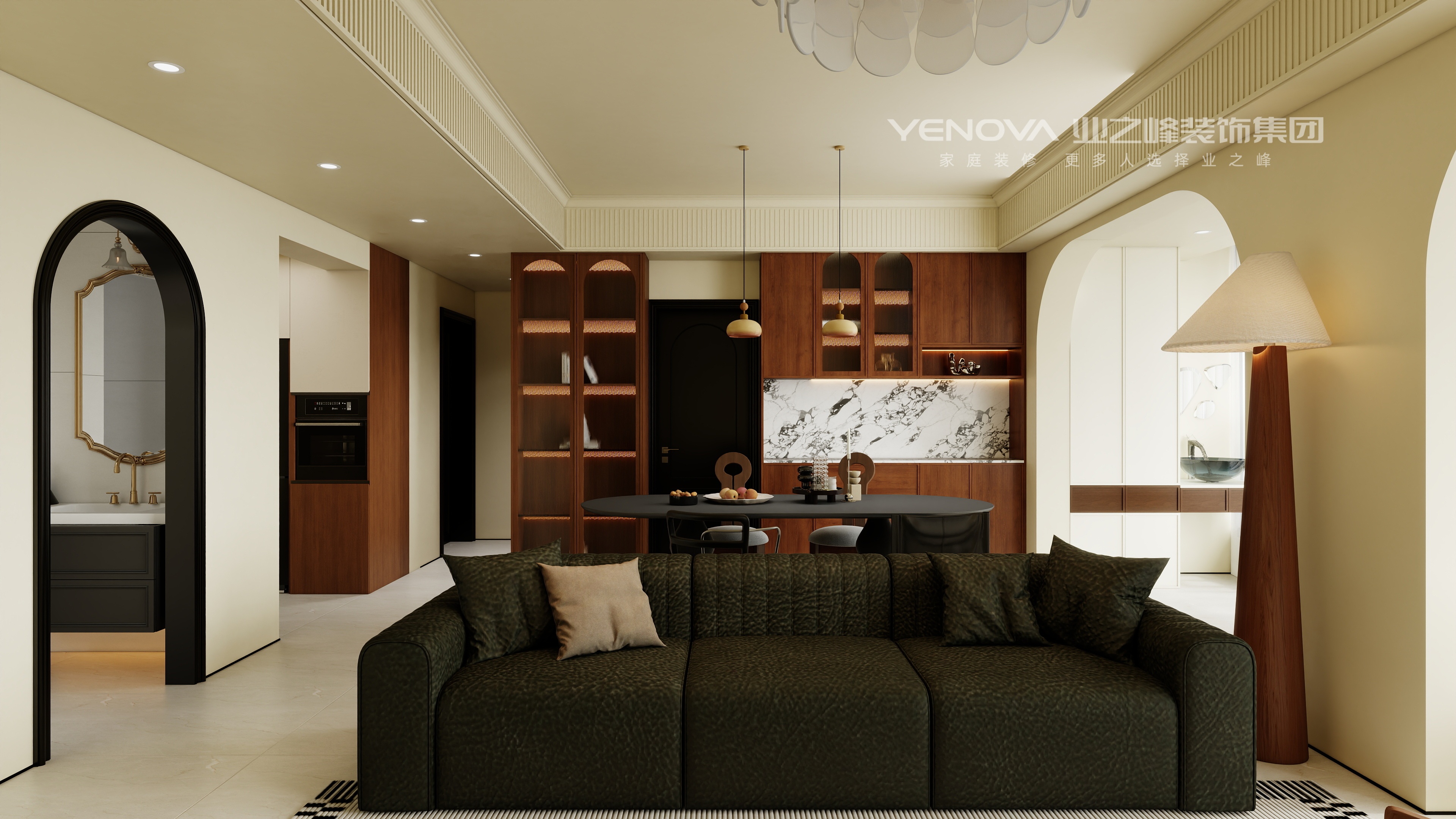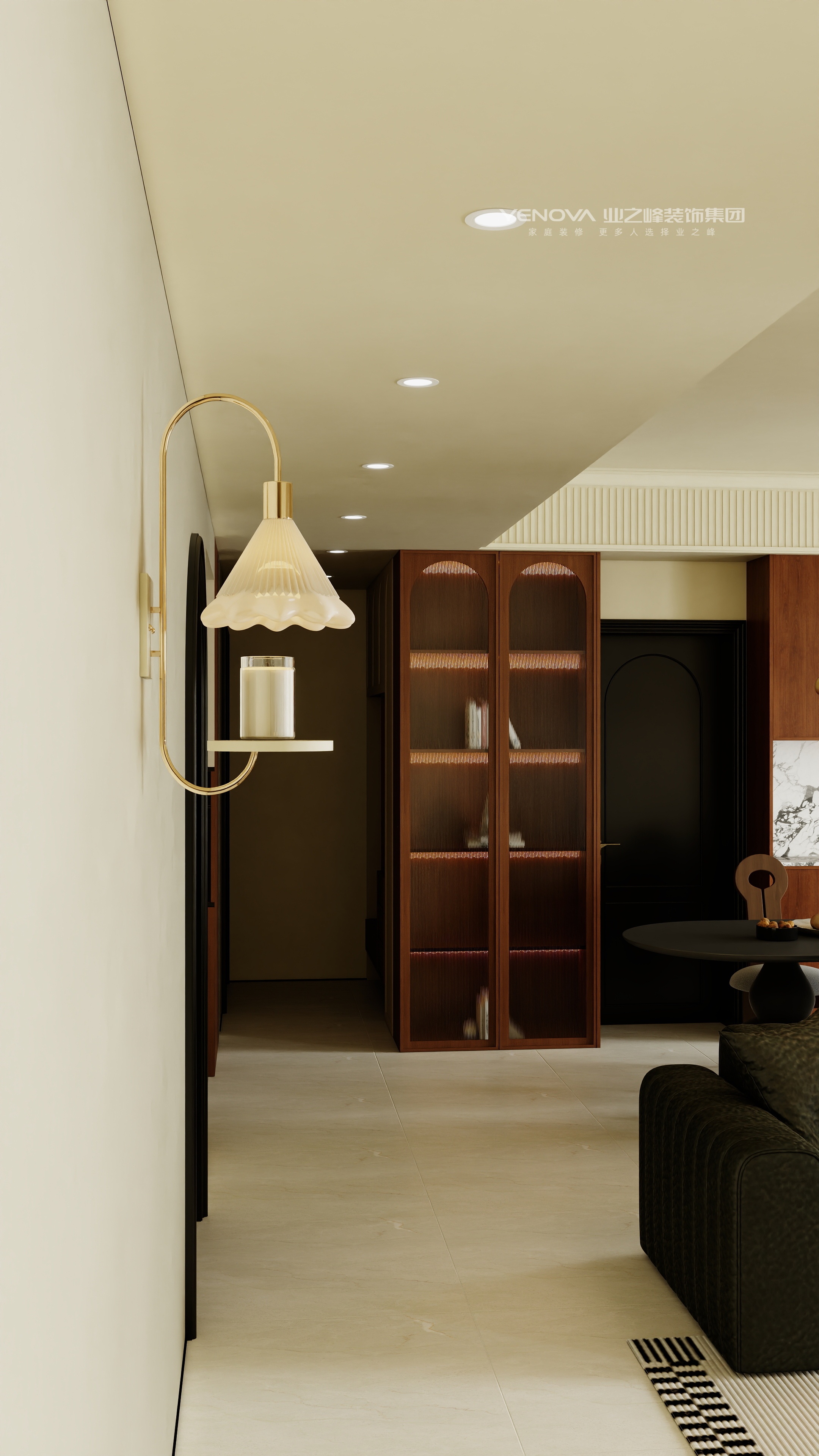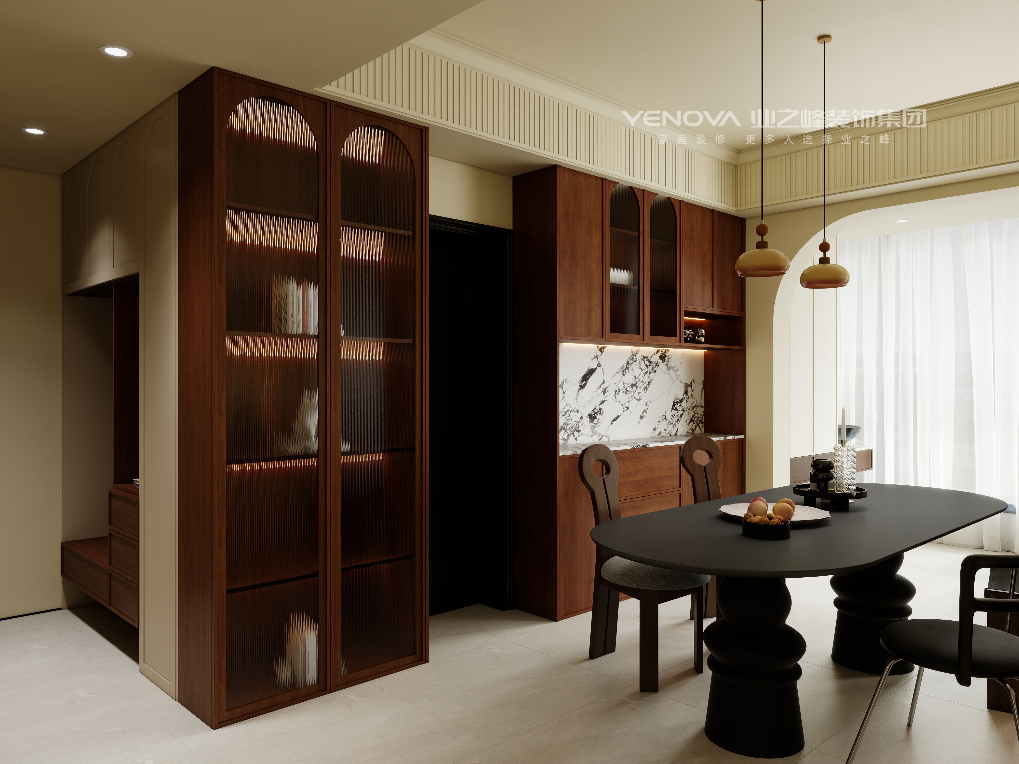 整体采用现代混搭风格,以暖棕与米白为主色调,营造温馨氛围。厨房简洁实用,充足收纳与合理布局提升操作便利性;玄关柜体兼具收纳与展示功能,灯光烘托归家仪式感;餐厅木质家具搭配精致吊灯,营造雅致用餐氛围;客厅运用复古元素与现代家具结合,弧形设计柔化空间,打造舒适且富有格调的休闲区域,各空间过渡自然,功能与美观兼具。
