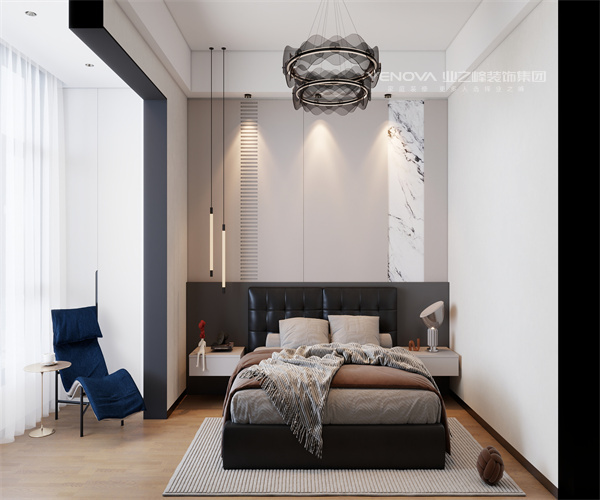 客厅主要以黑白灰色调为主,电视背景墙简洁大方和客厅形成一体,软装搭配墙布,和一些坚硬的硬装中和,让房间严肃中透露出一些温柔,低调中透露一种奢华。这大概就是意式极简风格的精髓所在。
