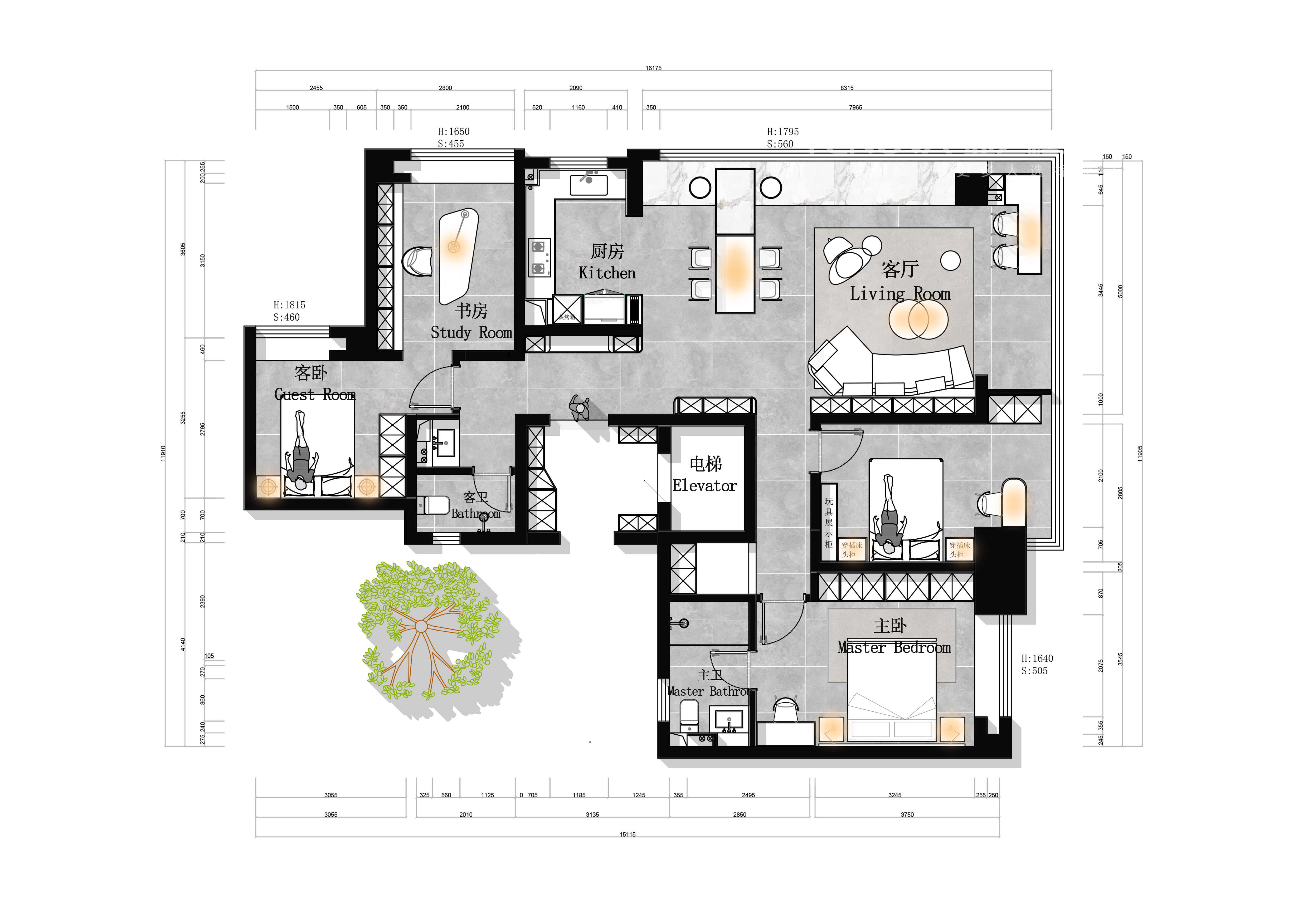 小区:外滩壹号 面积:160㎡ 户型:三居 风格:新中式风格