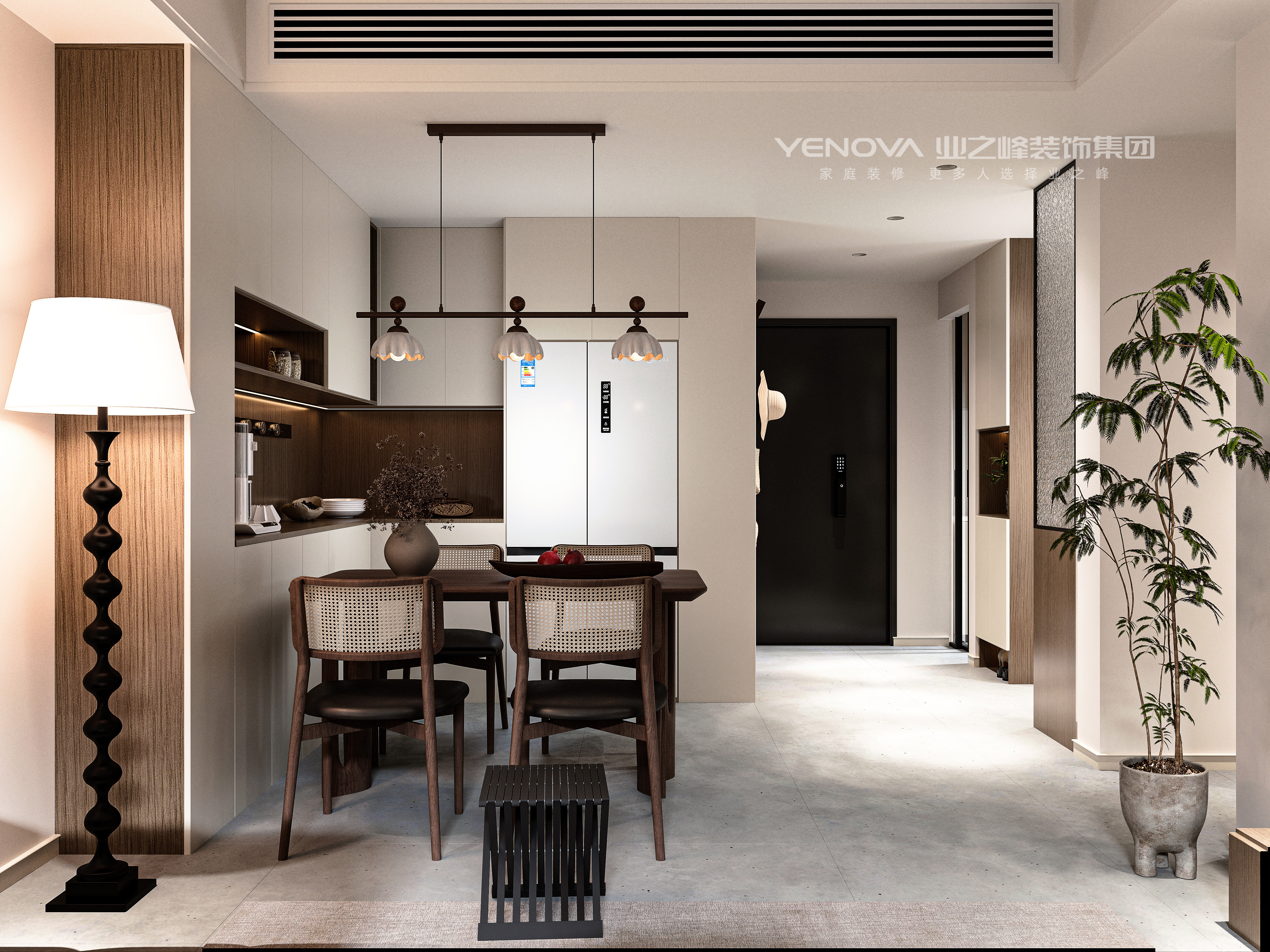 采用原木与哑光白调的柜体组合,藤编餐椅的自然肌理、手作感吊灯的柔和光晕,呼应诧寂“不完美之美”的哲思;