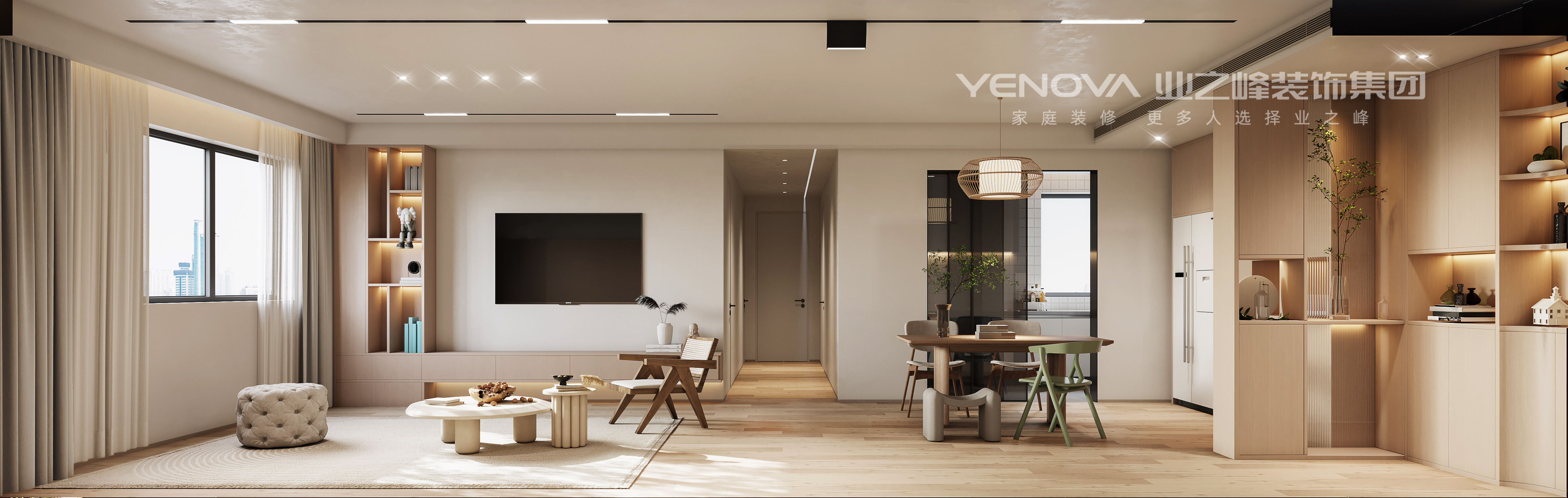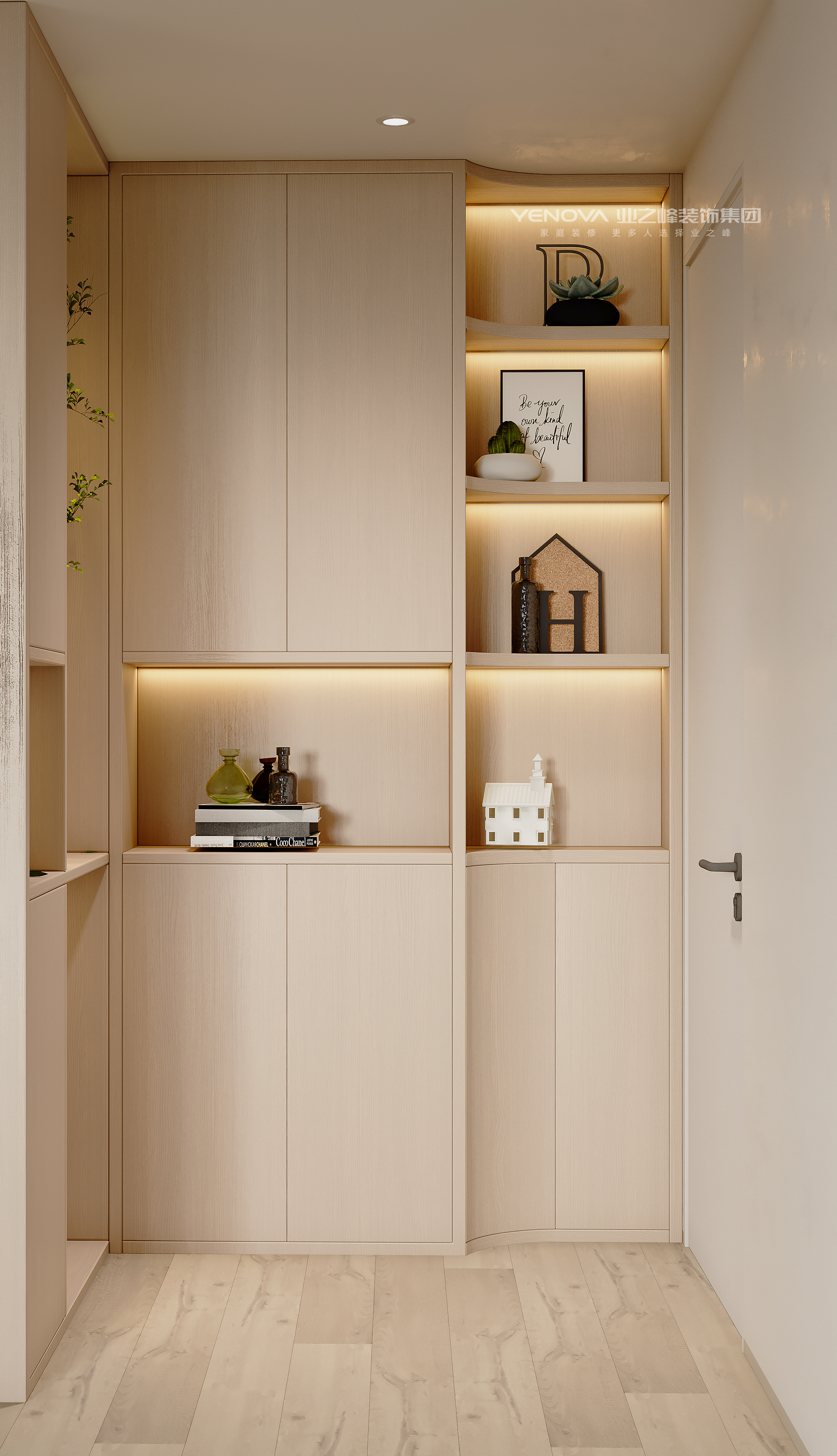 细节处,定制木质收纳系统(玄关展示柜、客厅嵌入柜等)结合内嵌灯光,既实现实用储物,又成陈列生活美学的 “展陈角”;线性灯、点光源与自然光影互动,让空间在不同时段都保有温润质感。整体通过木的自然肌理、柔和色彩与松弛软装,诠释出都市人 “归家即归心” 的居住向往。