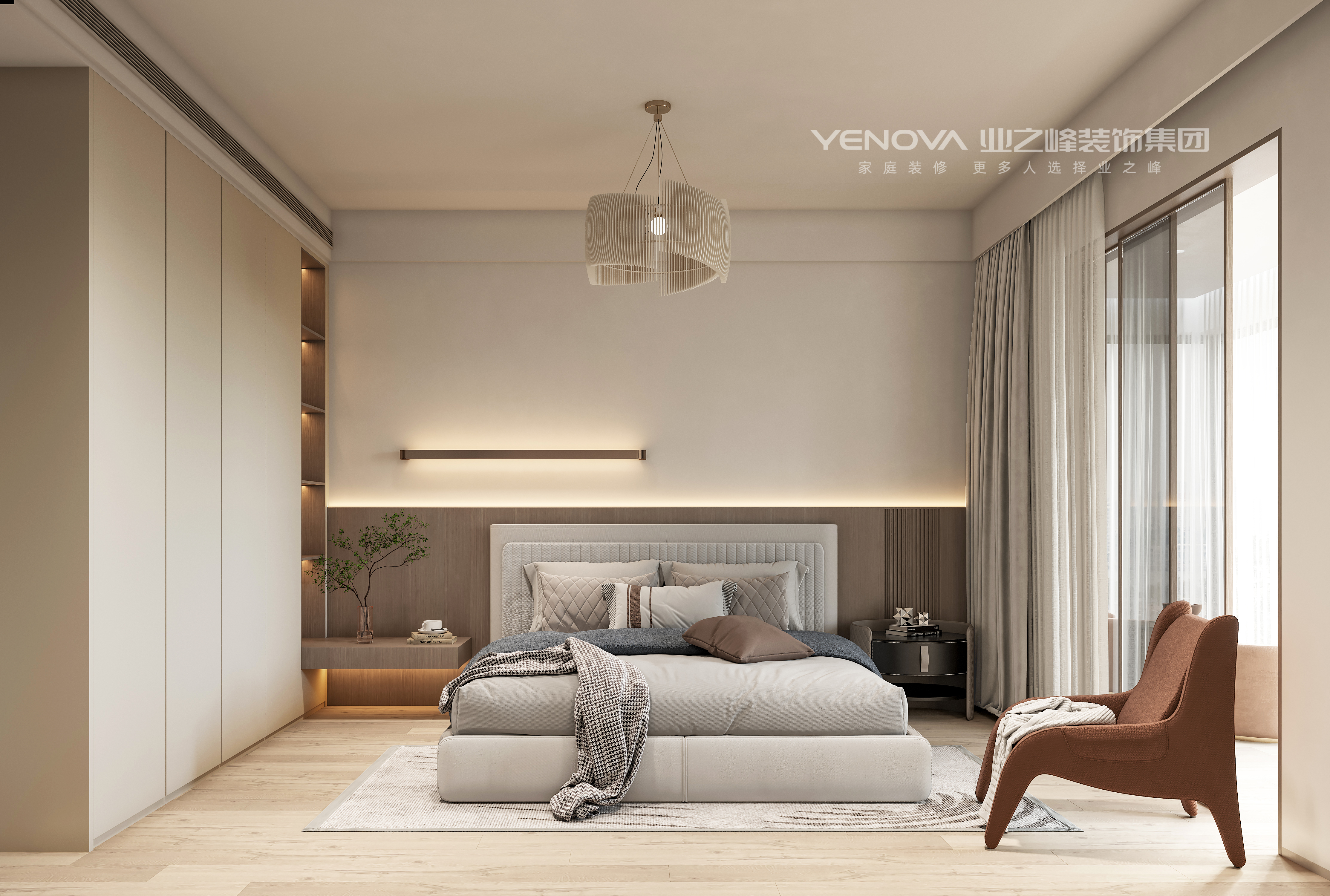 卧室延续温馨基调,浅木色墙面、地板构建柔和基底,定制柜体隐于空间满足收纳,床头线性灯与吊灯的暖光交织,为休憩营造静谧感;焦糖色休闲单椅则注入温暖跳色。