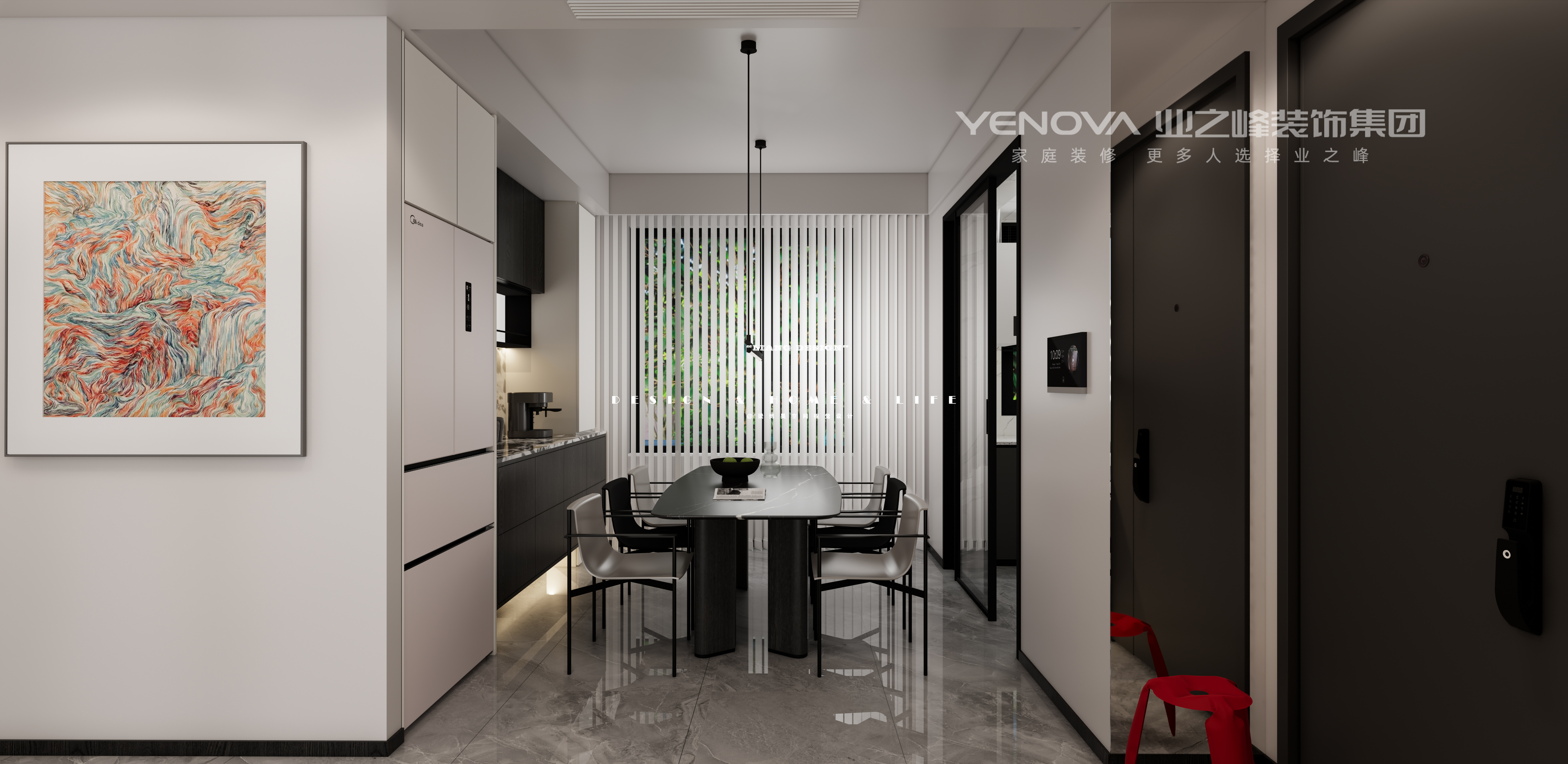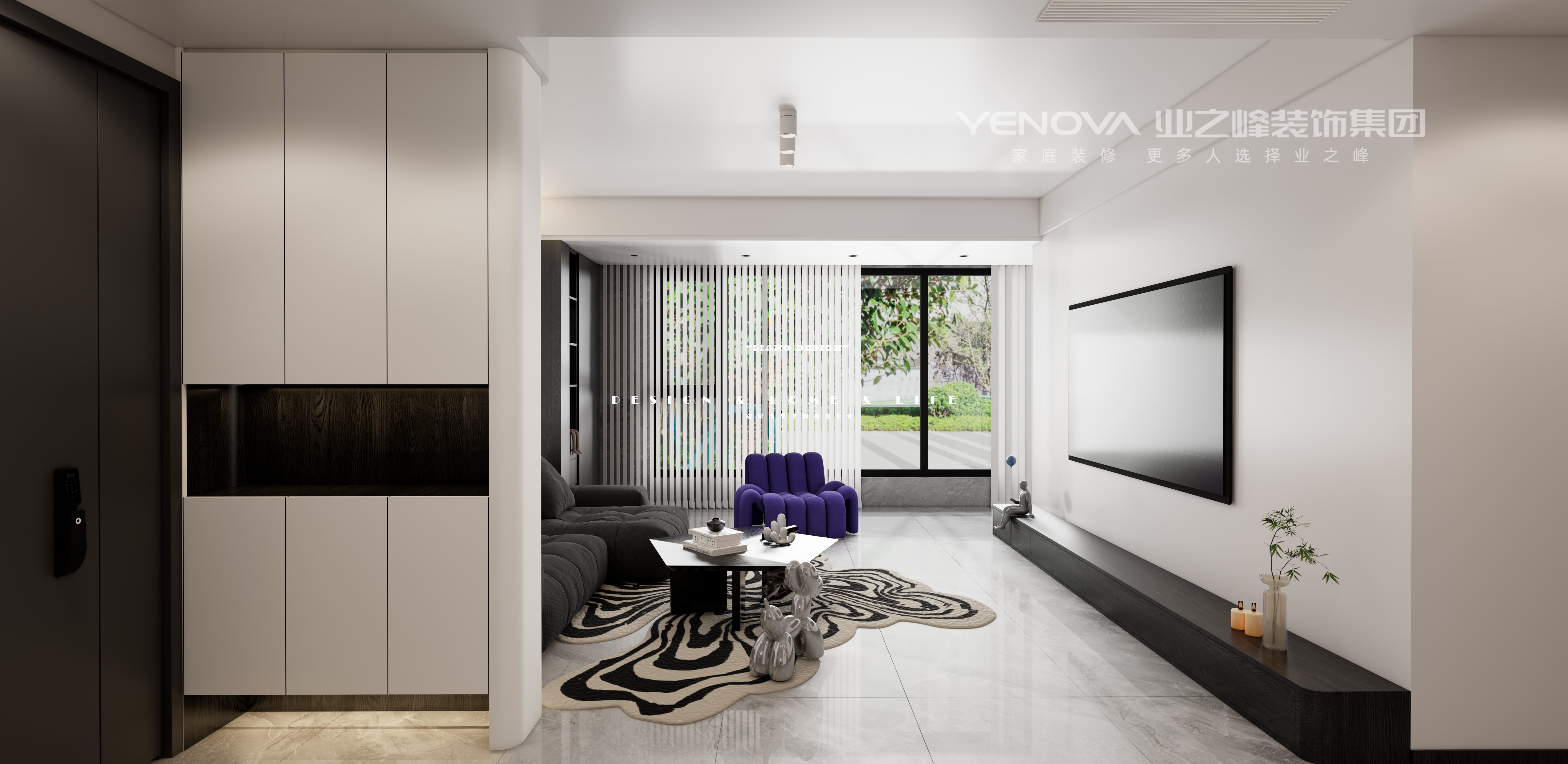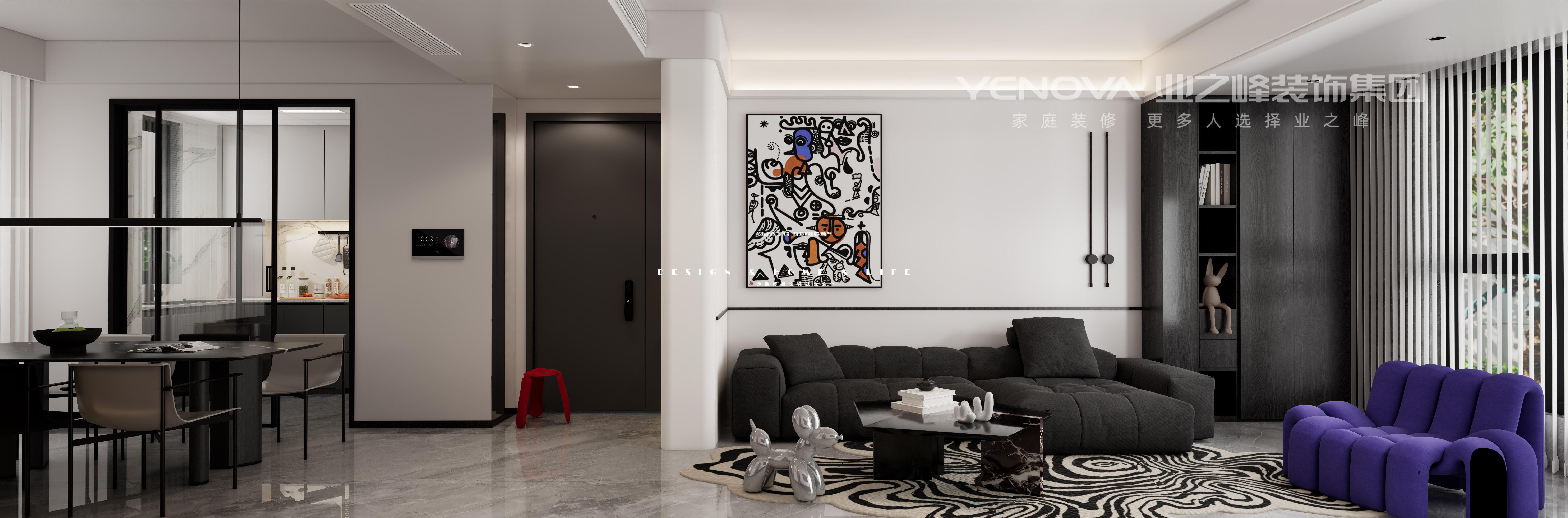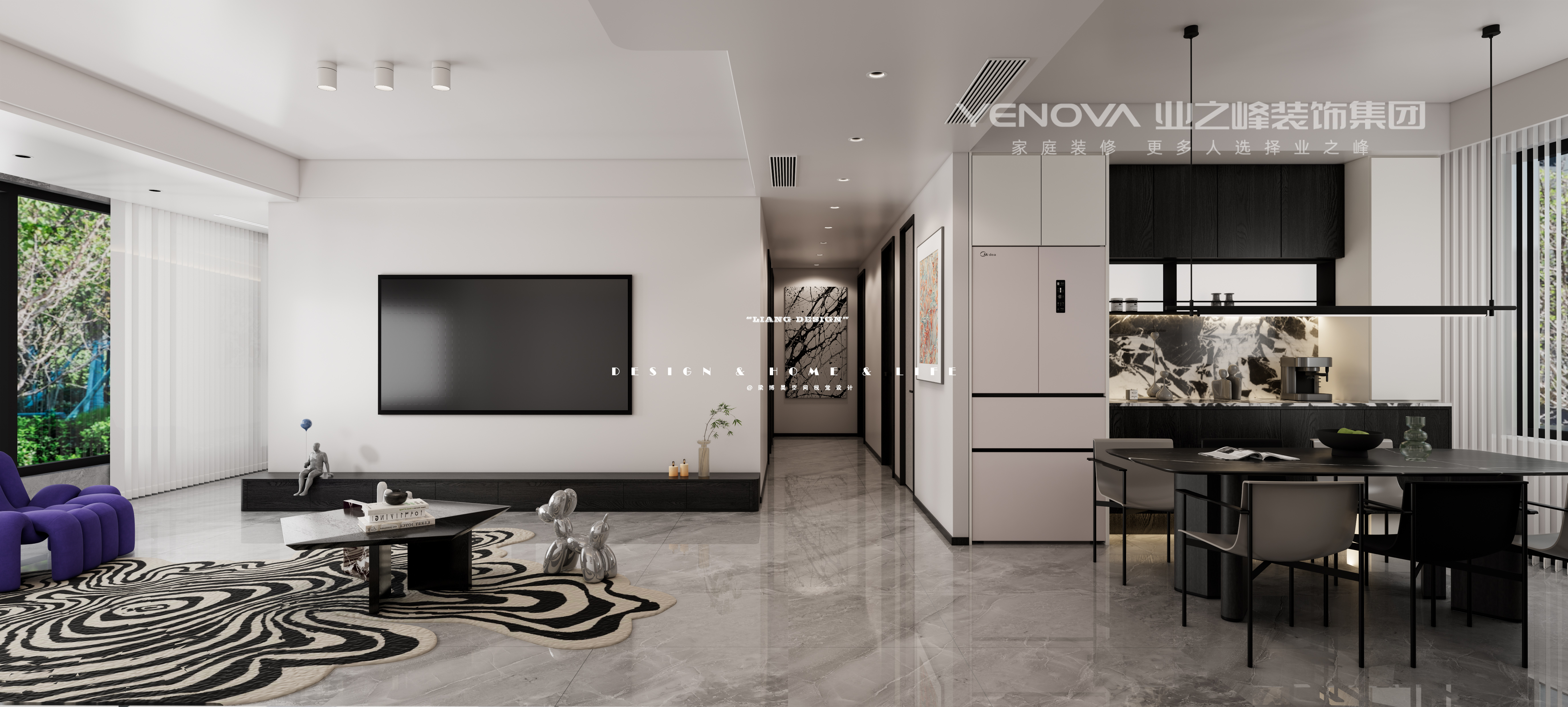 空间以黑白灰为基调营造冷静大气的氛围,同时借局部色彩、艺术元素打破单调:客厅紫色单椅、餐厅抽象挂画,为空间注入活力。公区采用开放式布局,客厅与餐厅连通,大理石地面延伸视觉、增强通透感;客厅电视墙极简利落,搭配创意摆件与艺术地毯,平衡理性与温度;餐厅吊灯线条感十足,与简约餐桌椅呼应,相邻厨房以黑白橱柜强化风格,收纳与采光兼顾。