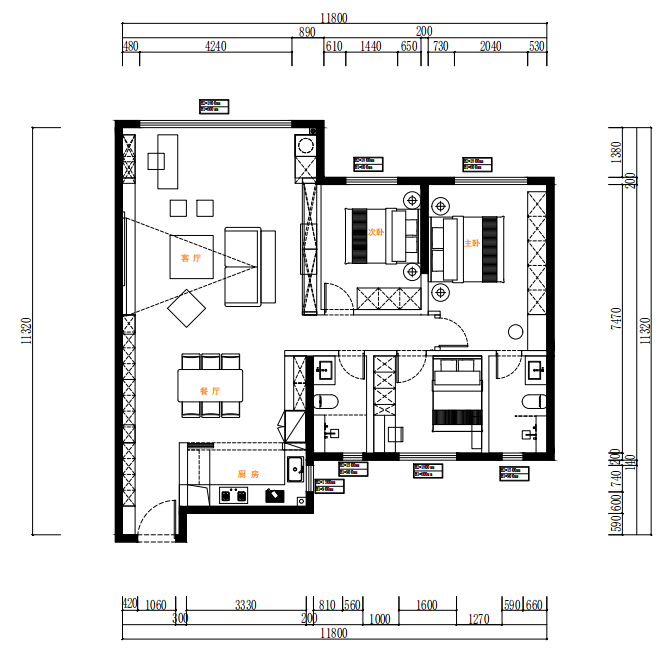 户型的缺点:卫生间距离客餐厅区域较远,狭长走廊浪费过多空间。