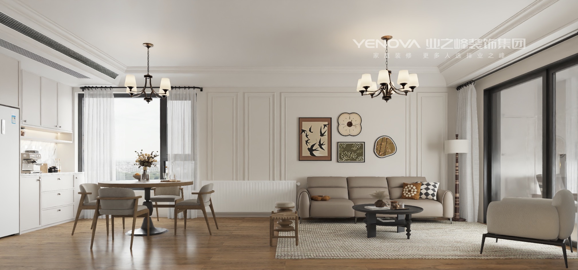 设计说明:本案为新交付小区,小区地段好,环境优美,本案设计为三口之家居住,进门原始户型打开,做开放式厨房,倒台设计,空间更大气,餐厅增加到台设计,更有生活气息,整体设计,简洁大气,复古色调又不失优雅。