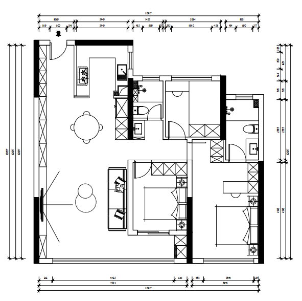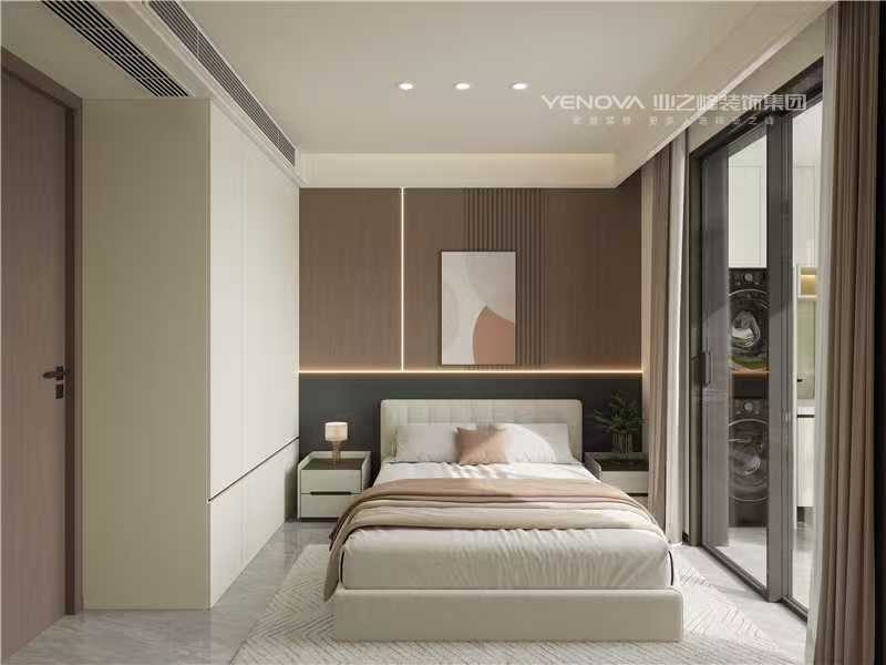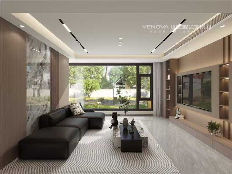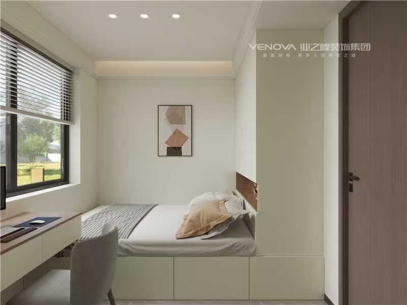公区中,客厅借大面玻璃窗引入充足自然光线,深色沙发搭配几何造型茶几,营造松弛感;背景墙采用木质与石材拼接,嵌入式收纳柜既优化储物,又成空间美学延伸。卧室强调静谧休憩感,主卧室以分层木饰面结合线性灯光烘托氛围,定制柜体满足收纳需求;小卧室采用床与书桌一体化设计,最大化利用空间,适配休憩与工作双重场景。