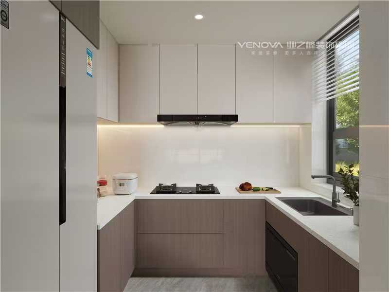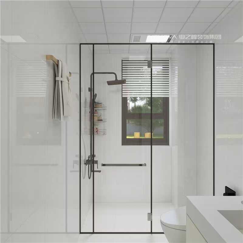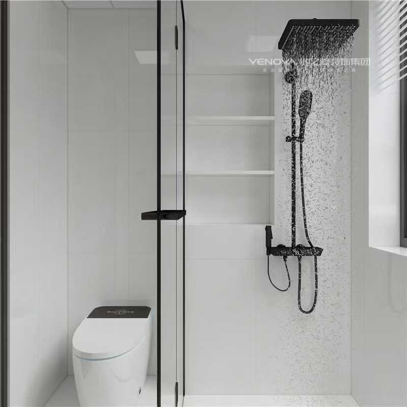 厨房以浅白与木色橱柜营造清爽氛围,L 型台面拓展操作空间,吊柜与地柜组合实现充足收纳,窗边采光让烹饪更显从容。卫生间采用黑白极简搭配,玻璃隔断利落划分干湿区;智能马桶、黑色金属质感的淋浴套件,既提升使用便捷性,又为空间注入精致感。
