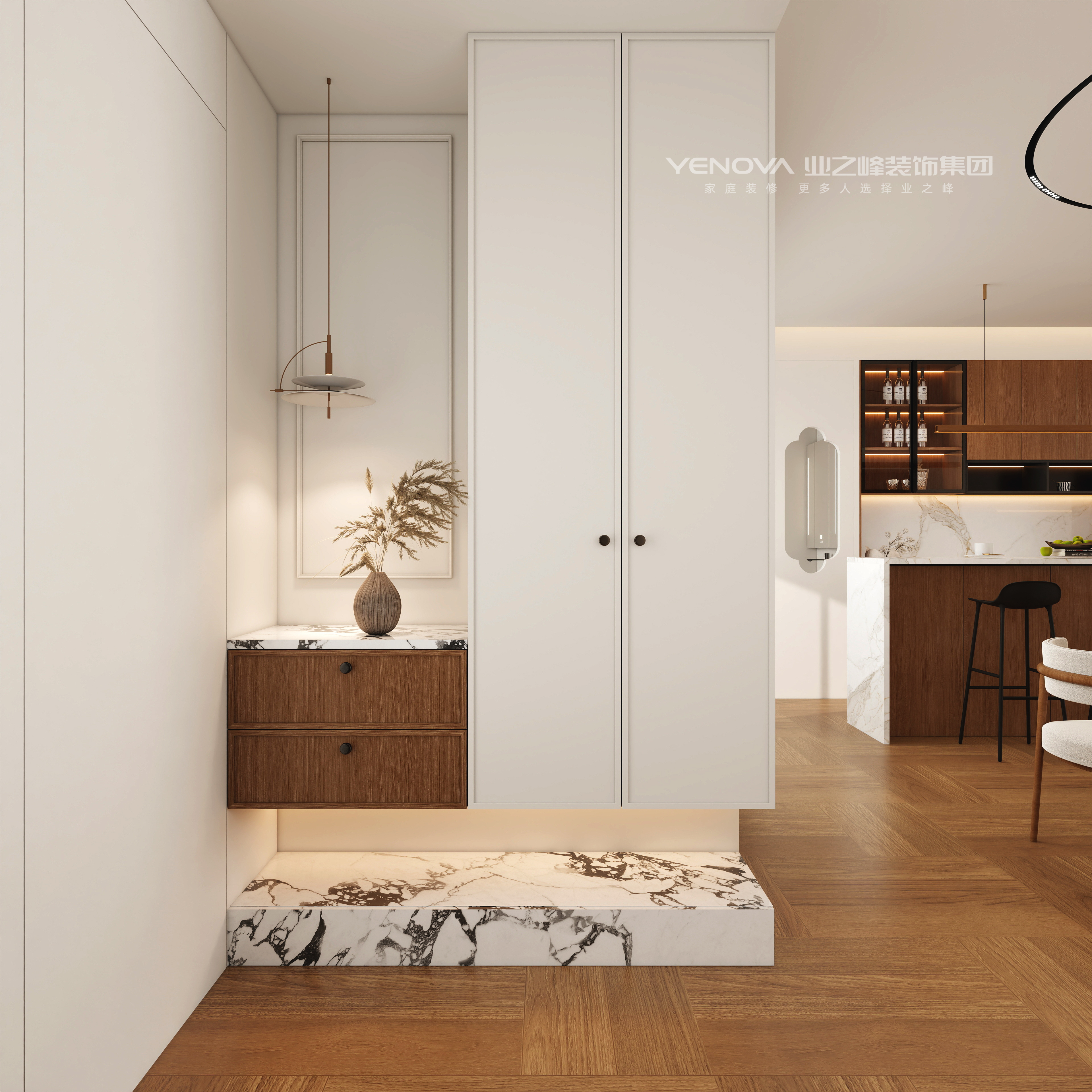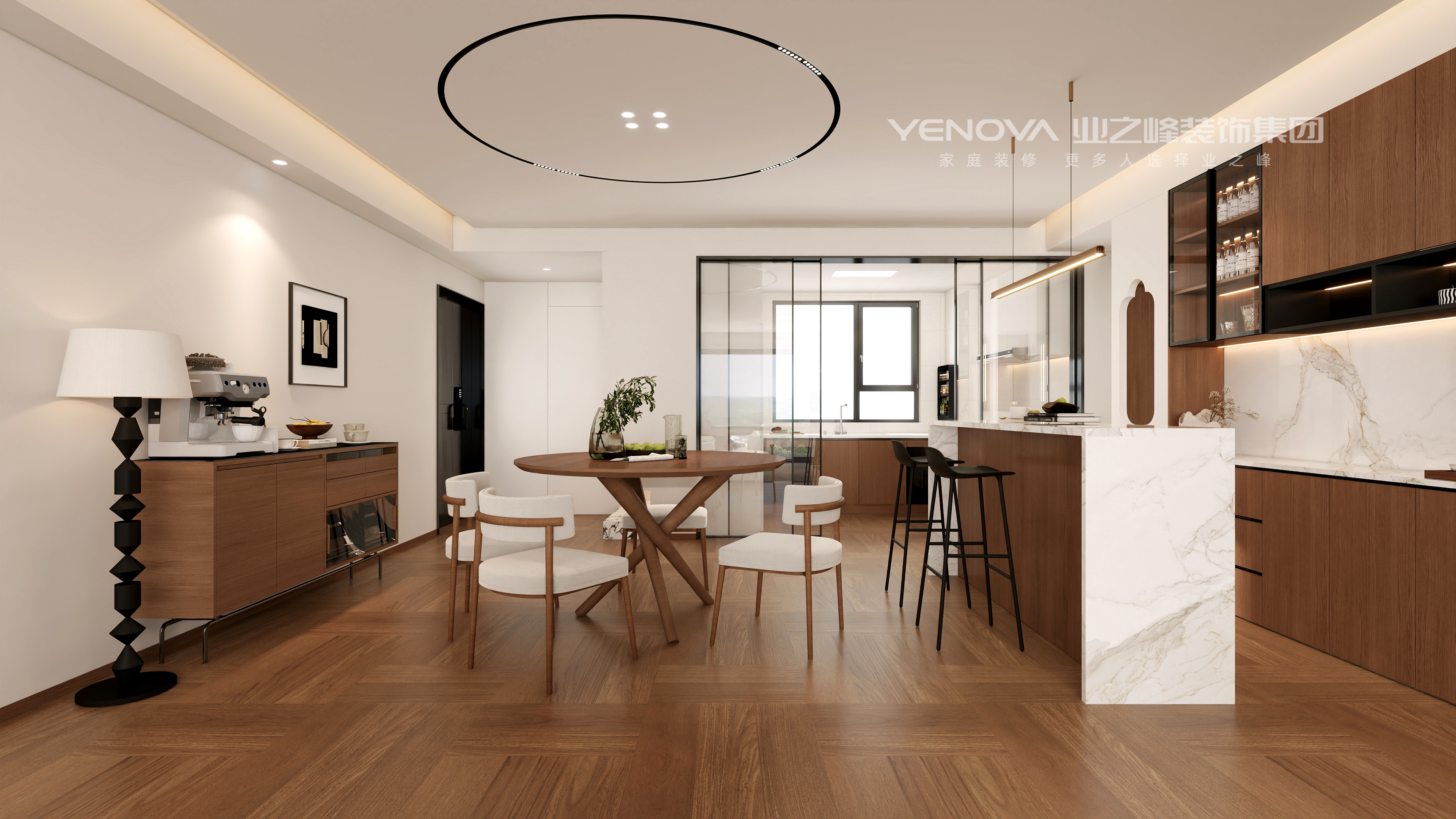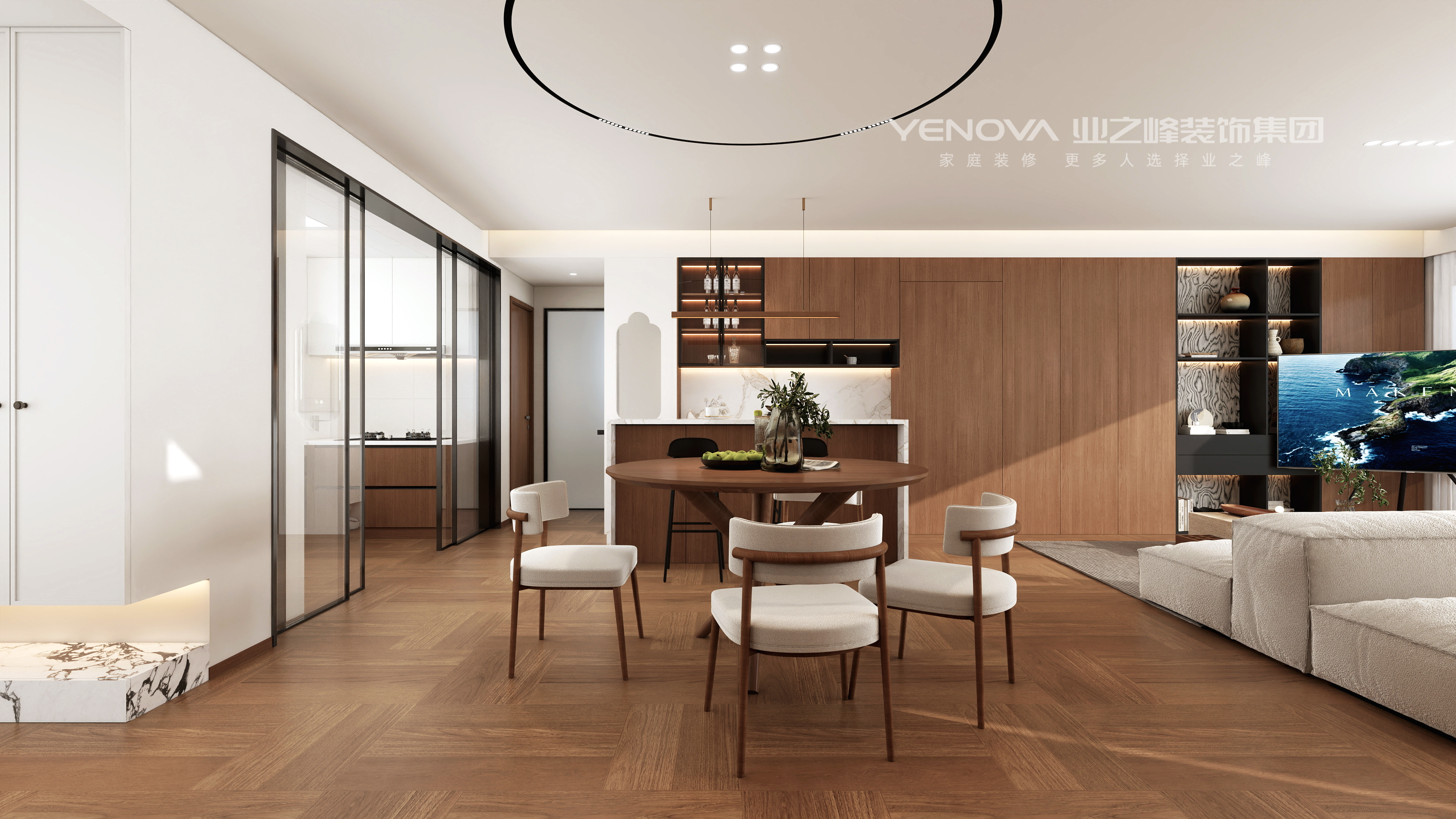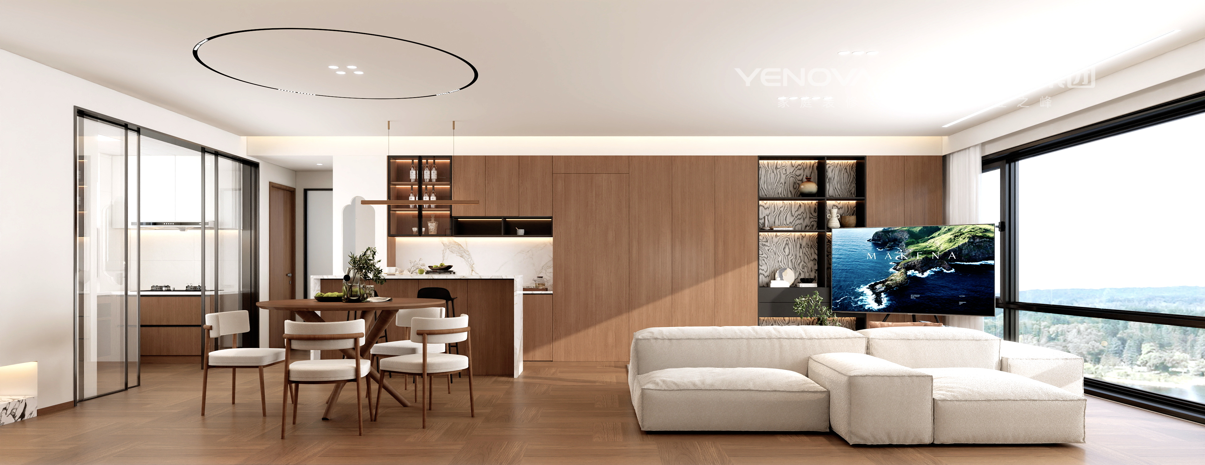 居住需求:本案是一对新婚小夫妻的爱居,男主是大学教授,经常在外地参加学习,女主近期刚怀孕在家休息,客户委托我想要舒适安逸放松的居家环境,毕竟每天忙于工作,就想着回家进门一瞬间可以感受到松弛,客餐厅是个通厅,我把餐厅,西厨岛台,客厅,咖啡角4个功能融合在了一起,让普通的通厅功能丰富化,一家人在客厅的互动性围合性瞬间拉满,客厅采用了无主灯设计手法,让顶面极简化,灯光氛围层次感凸显,地面采用了800*800的仿木地板瓷木砖,让温馨舒适度更高,公区收纳采用了混油胡桃木纹色来凸显原木风的质感,电视墙运用去客厅化,用了可移动支架电视让客厅氛围再次松弛感慢慢,休闲,随意,沙发采用多面沙发,下午微风拂过,来杯咖啡再每不过,本户型属于第四代住宅,带一个5平方的露台,跟客厅连贯,让室内室外更好切换,主卧卫生间结构的改造,玻璃砖堆砌的采光窗口,让主卧的自然风体现的淋漓尽致~~~