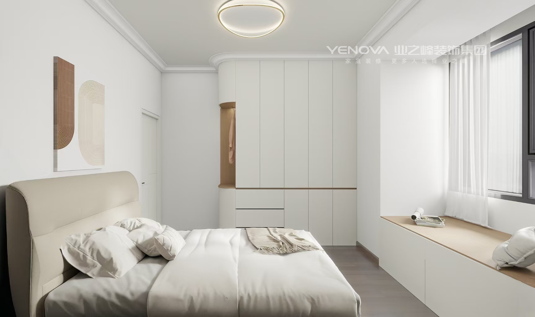 打开主卧的门,映入眼帘的是一组圆角净衣柜,重新定义了主卧入口的边界与功能,让日常收纳成为空间造型的一部风,飘窗处放置了一组矮柜,增加收纳还便于观察窗外风景。