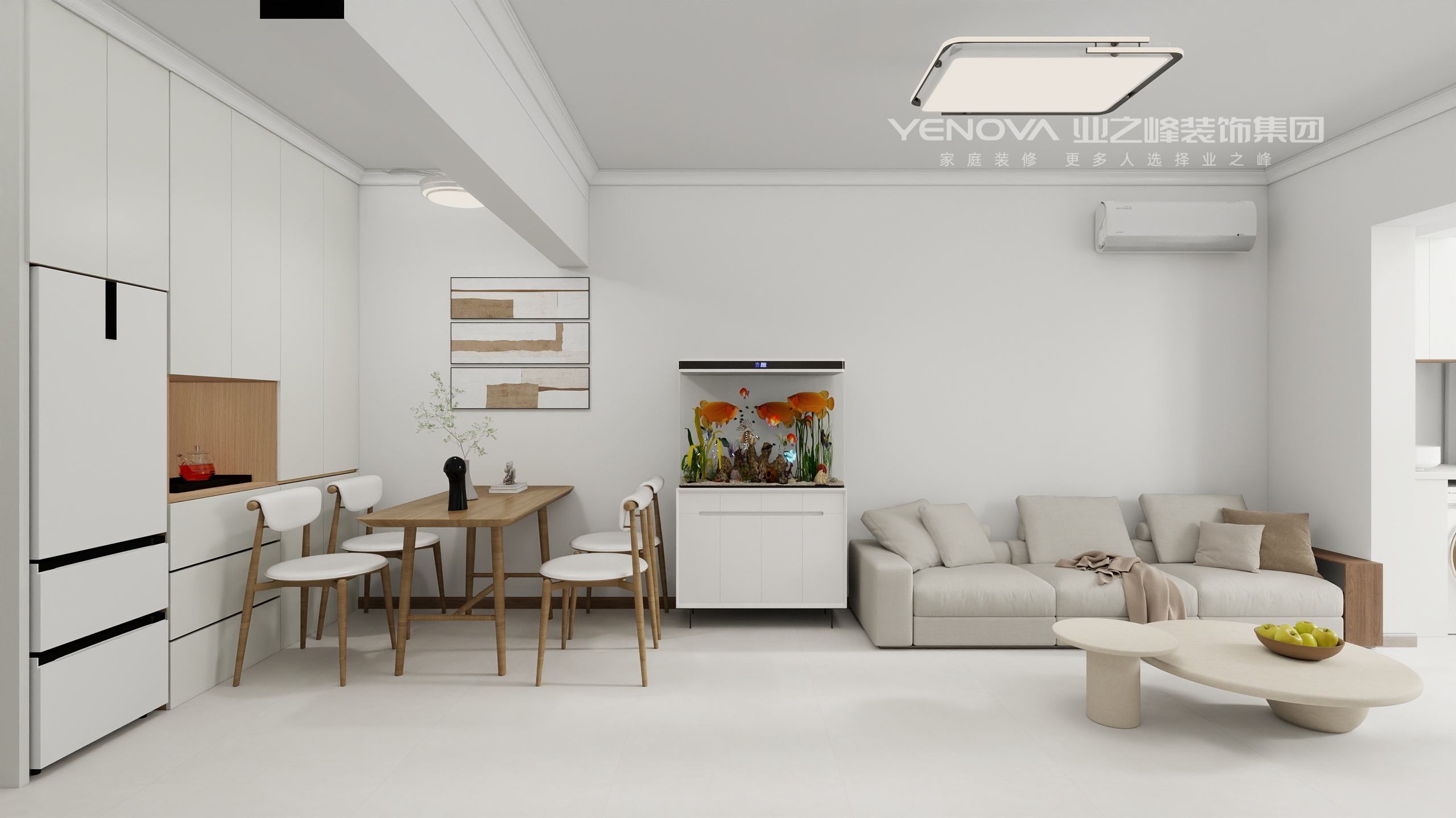 客餐厅一体化设计,让空间更显大气。业主要求的鱼缸,放置与餐厅和客厅的沙发之间,既在功能上形成柔性隔断,又在视觉上增添生机。电视背景墙旁立有一组展示柜,增加收纳的同时,也让电视背景墙不显得那么单调。