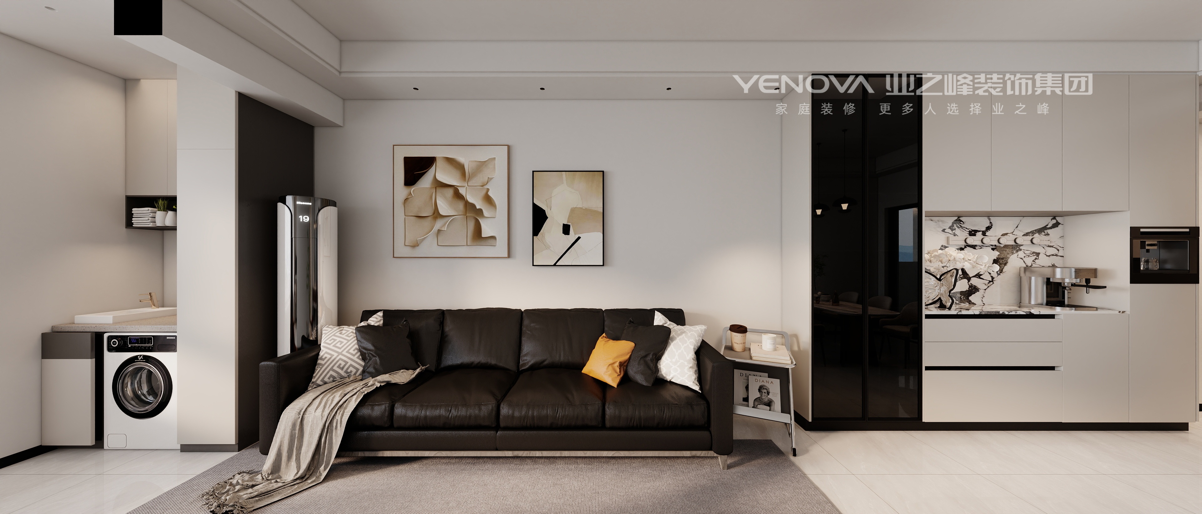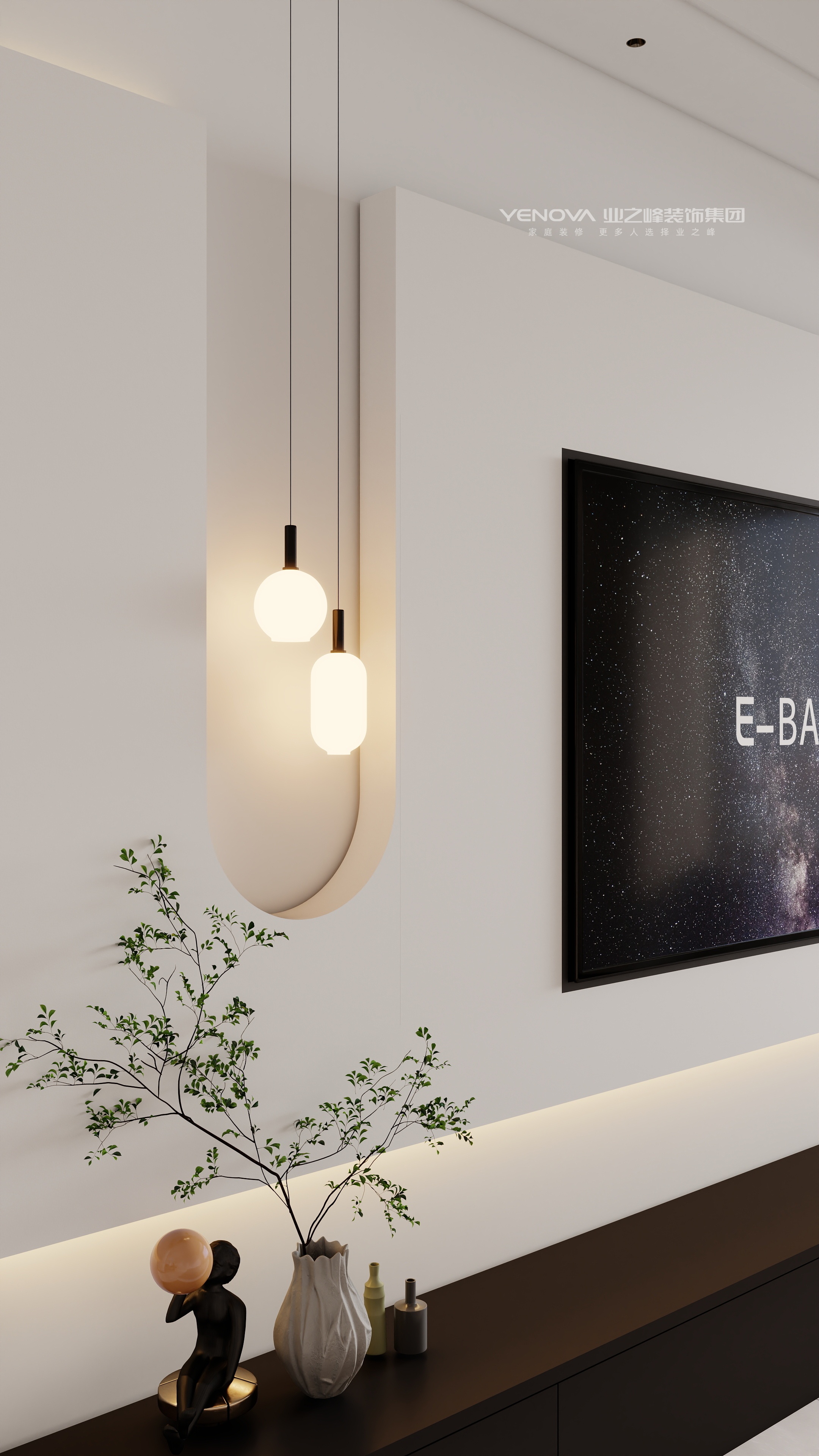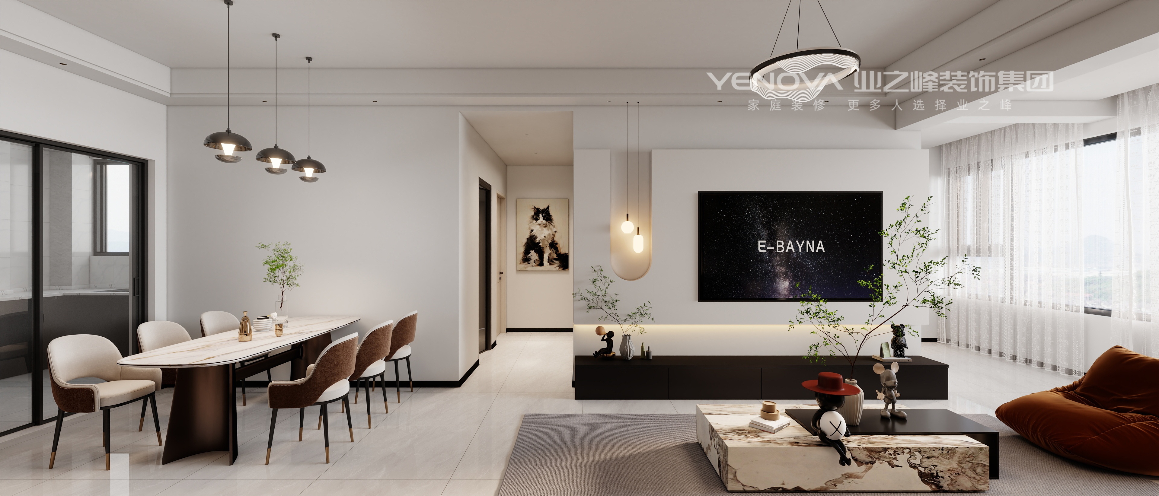 本设计为艺境天下 98㎡现代简约风格住宅,以简洁大气、舒适实用为核心。客厅采用黑白灰为主色调,搭配造型简约的灯具与富有设计感的家具,营造出时尚通透的空间氛围。餐厅区域的餐桌椅设计简洁,吊灯造型别致,与客厅风格相呼应,增强空间整体感。