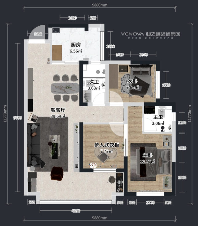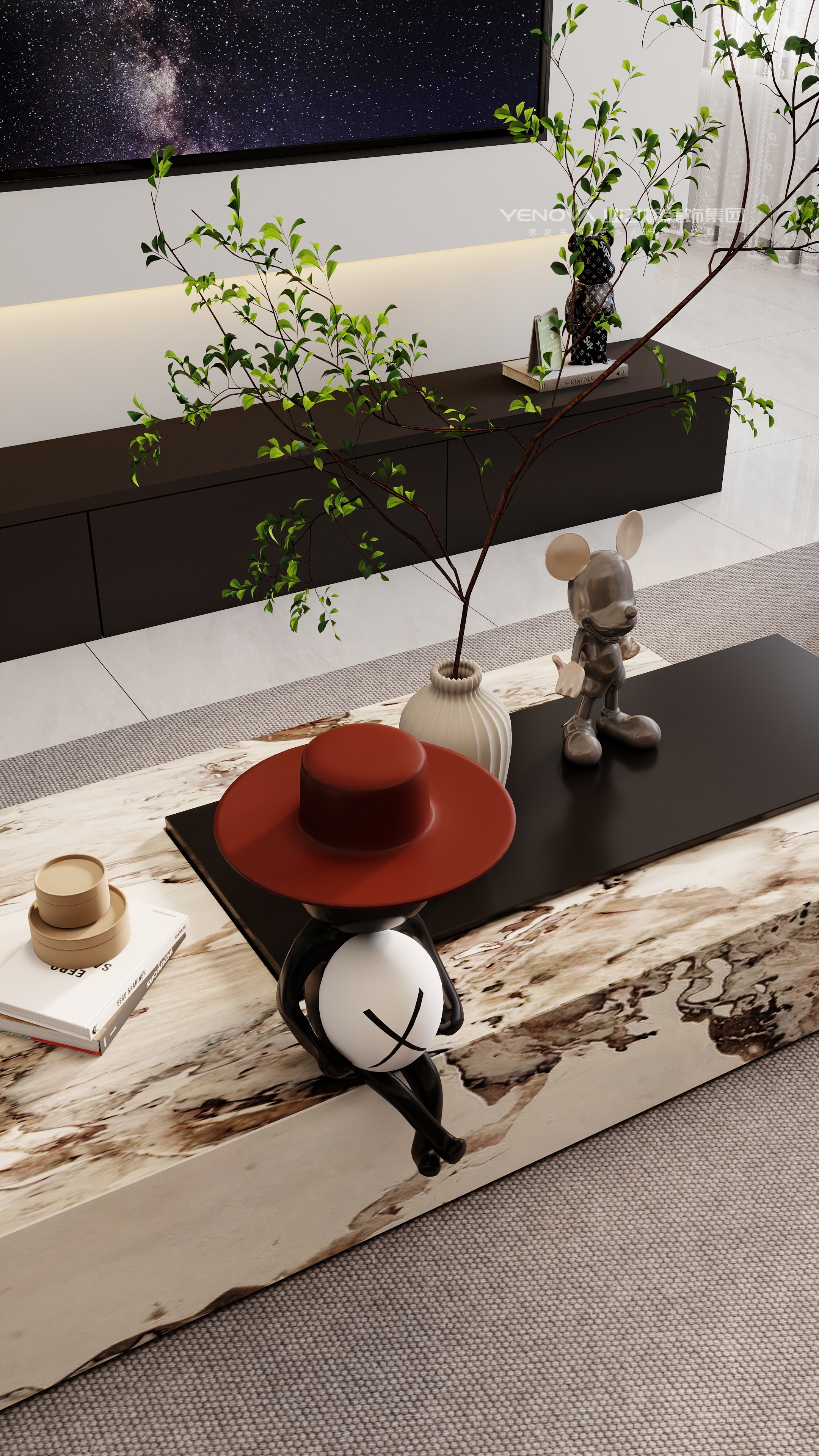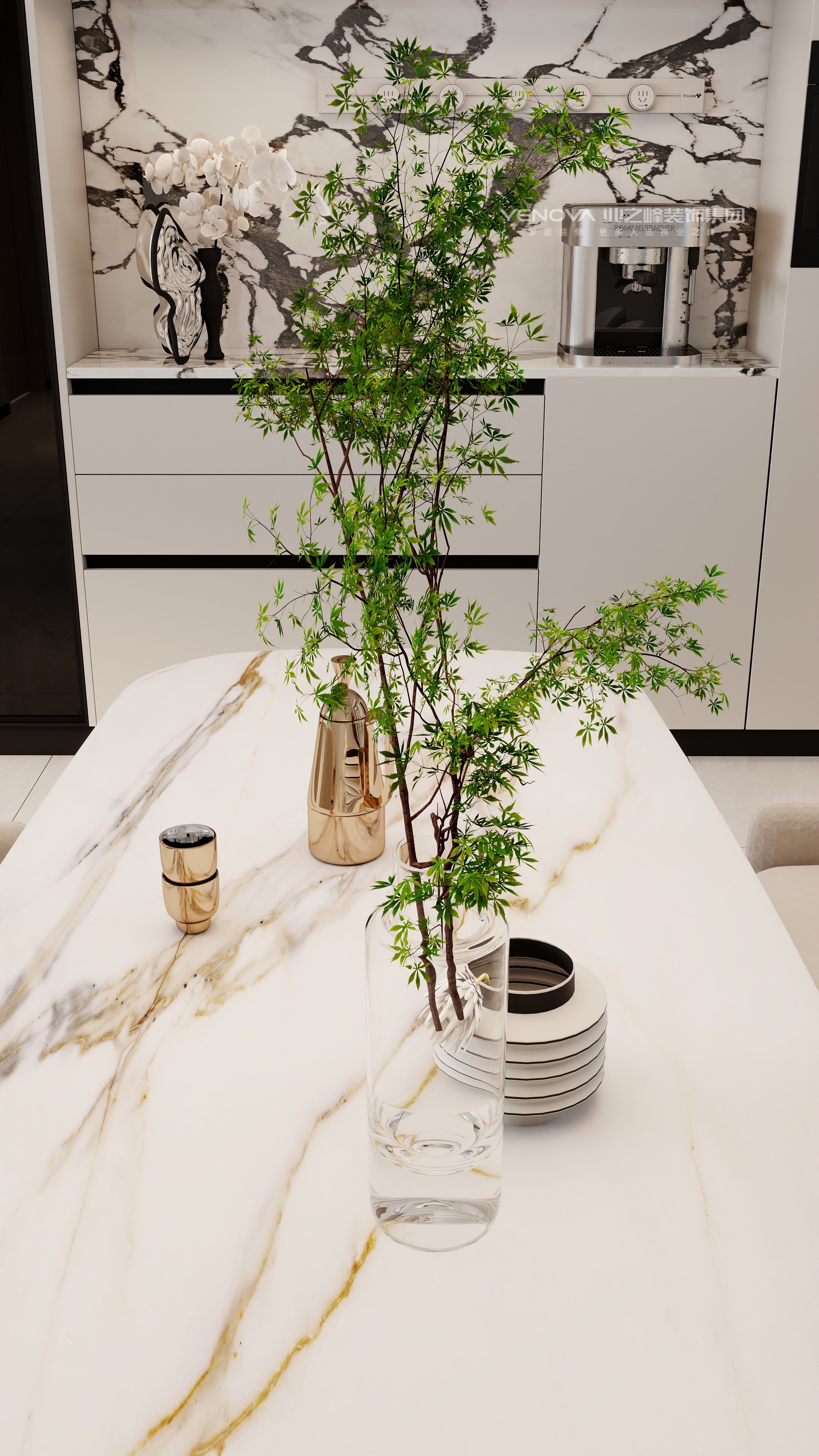本设计为艺境天下 98㎡现代简约风格住宅,以简洁大气、舒适实用为核心。客厅采用黑白灰为主色调,搭配造型简约的灯具与富有设计感的家具,营造出时尚通透的空间氛围。餐厅区域的餐桌椅设计简洁,吊灯造型别致,与客厅风格相呼应,增强空间整体感。