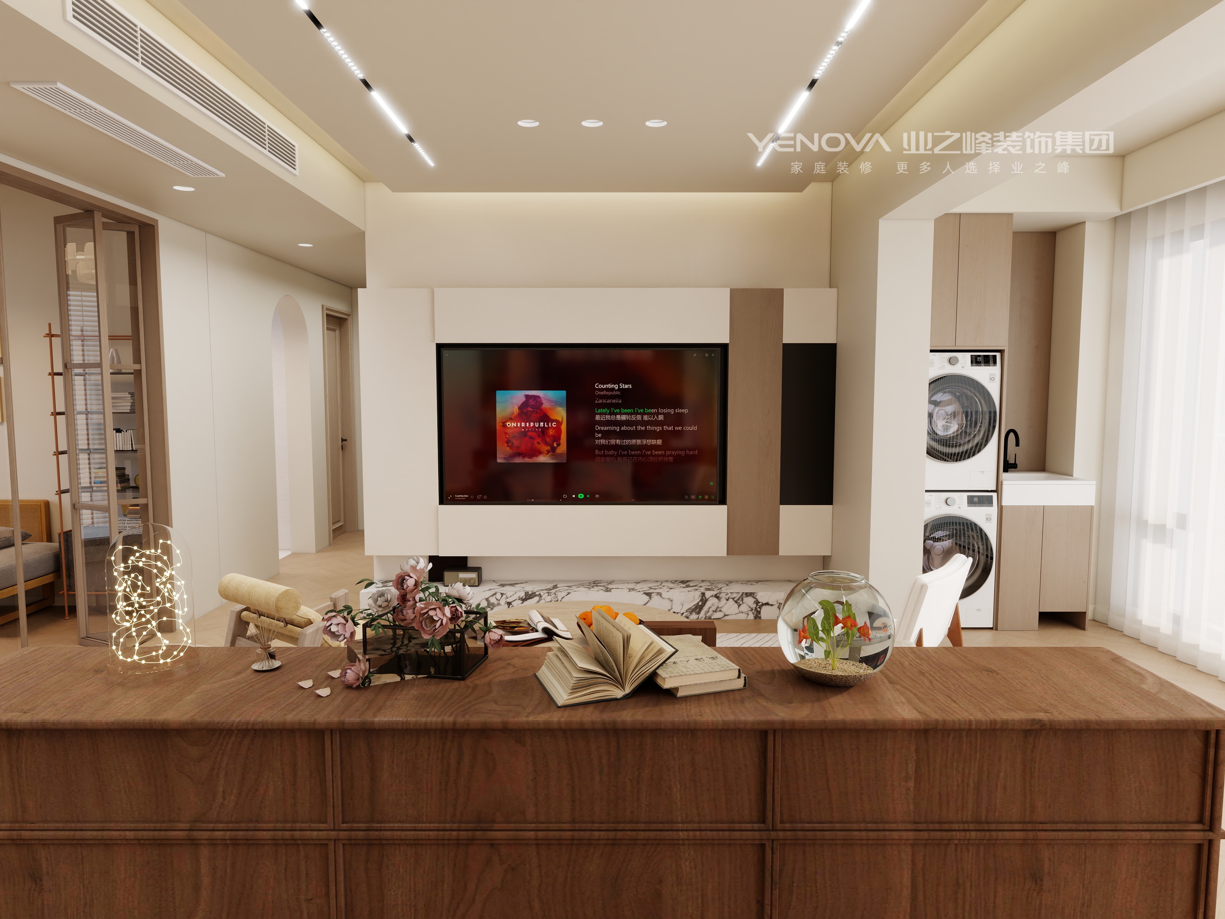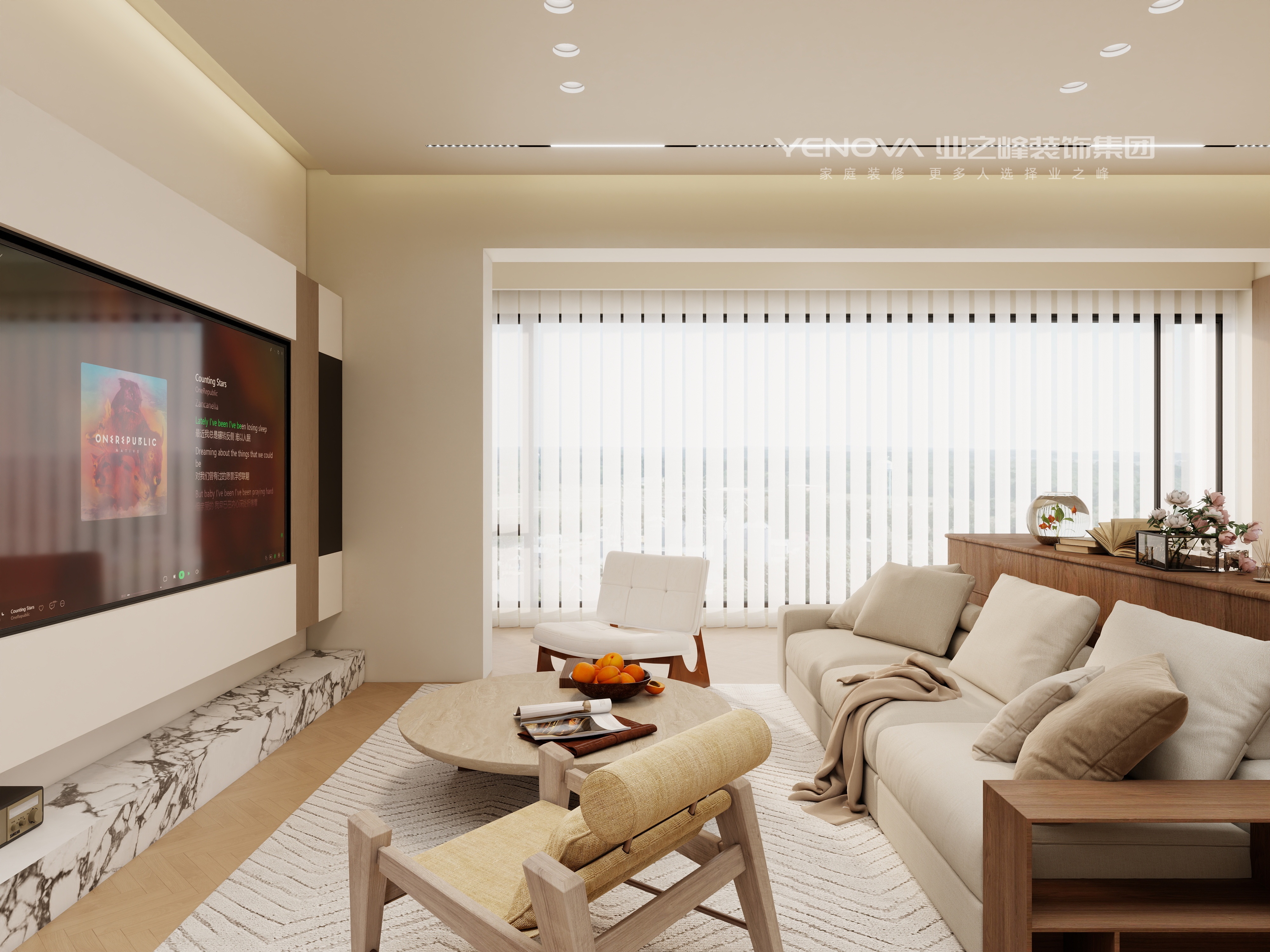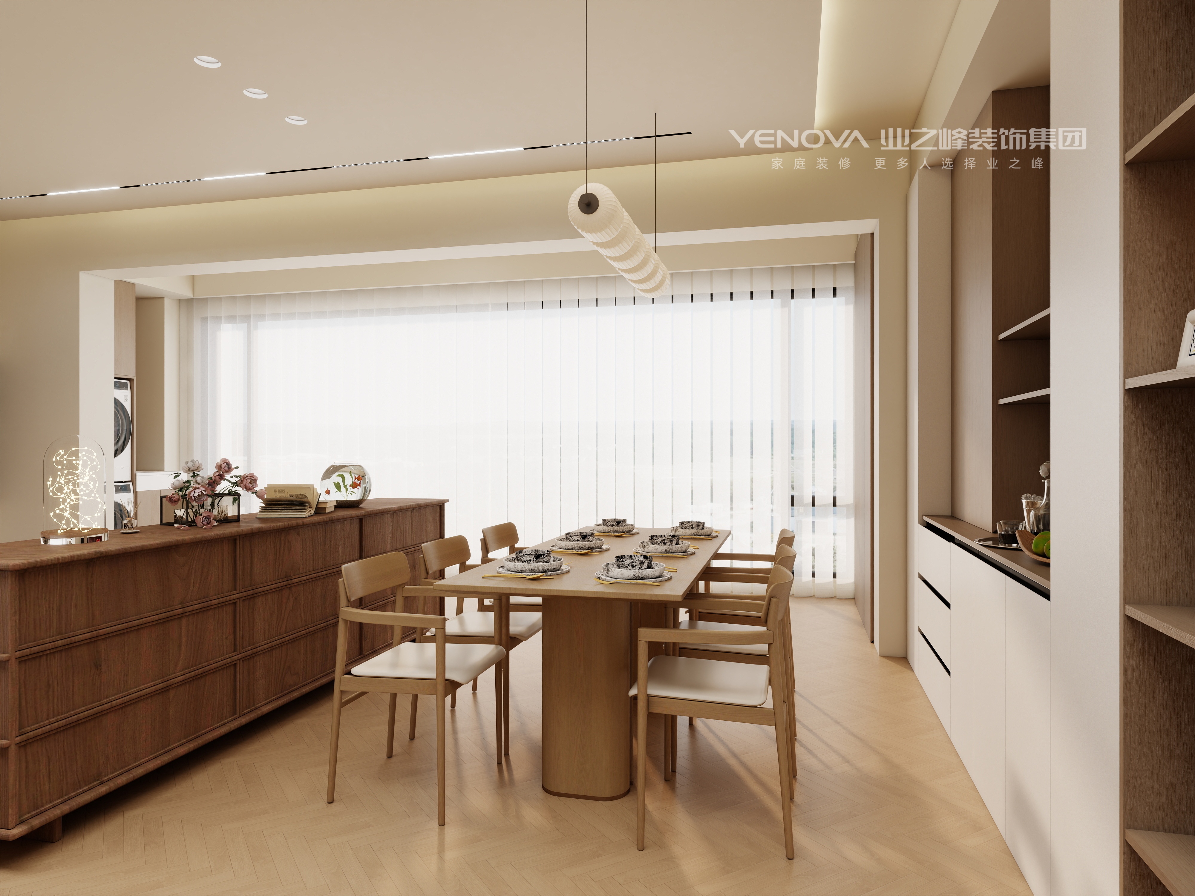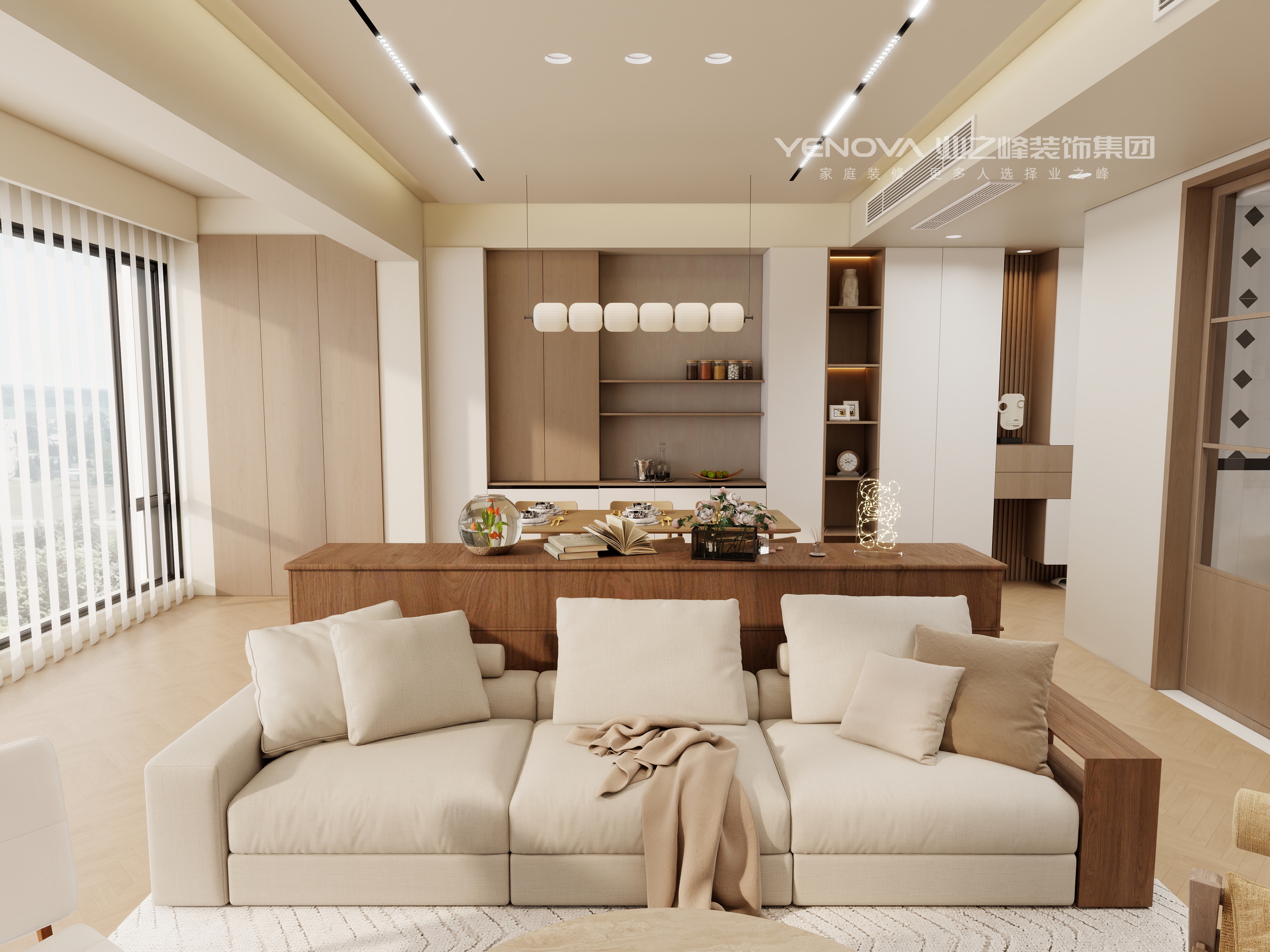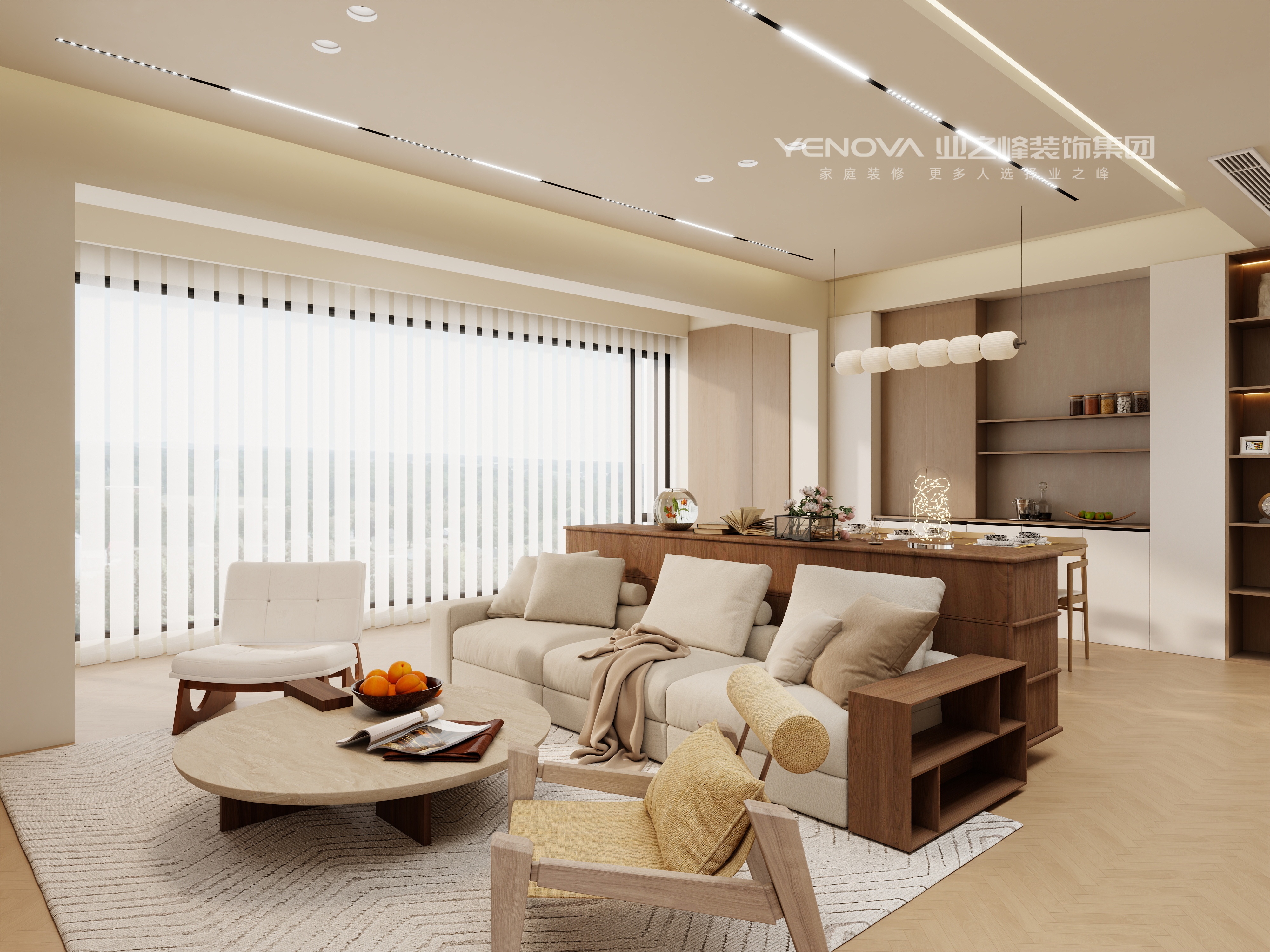 本设计以暖色调为主,营造出温馨舒适的居住空间。客厅采用浅米色沙发搭配木质家具,搭配圆形茶几与简约地毯,空间显得柔和且有质感。电视背景墙设计简洁,与整体风格协调统一。餐厅区域的木质餐桌椅与独特造型的吊灯相得益彰,营造出温馨的用餐氛围。整个空间布局通透,通过柔和的色彩与自然的材质,打造出一个充满暖意、舒适宜居的现代家居环境。