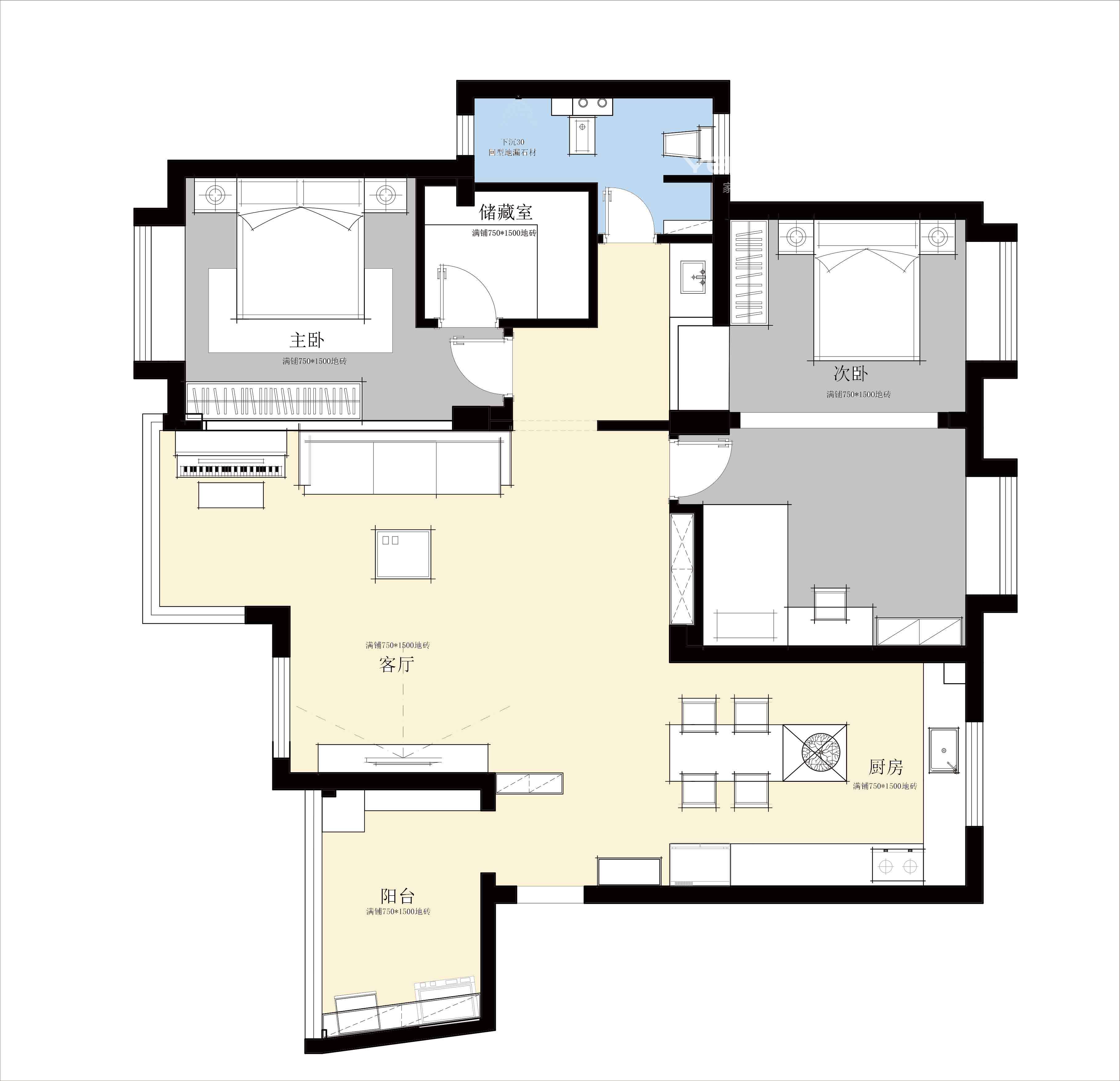 有一个储物间用来放杂物;厕所要干湿分离,并且需要马桶以及蹲便;客厅需要预留位置放一台钢琴。