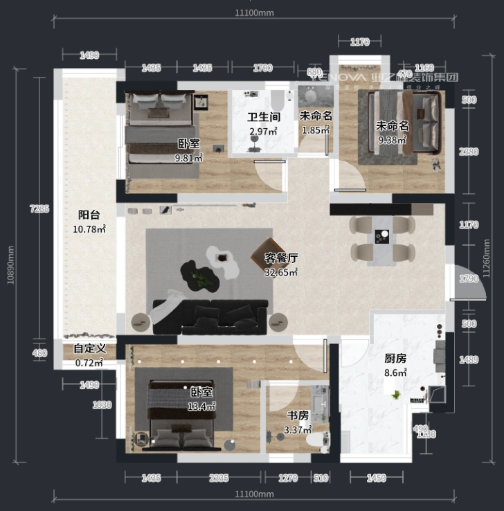 113㎡三居现代简约风格中交锦上