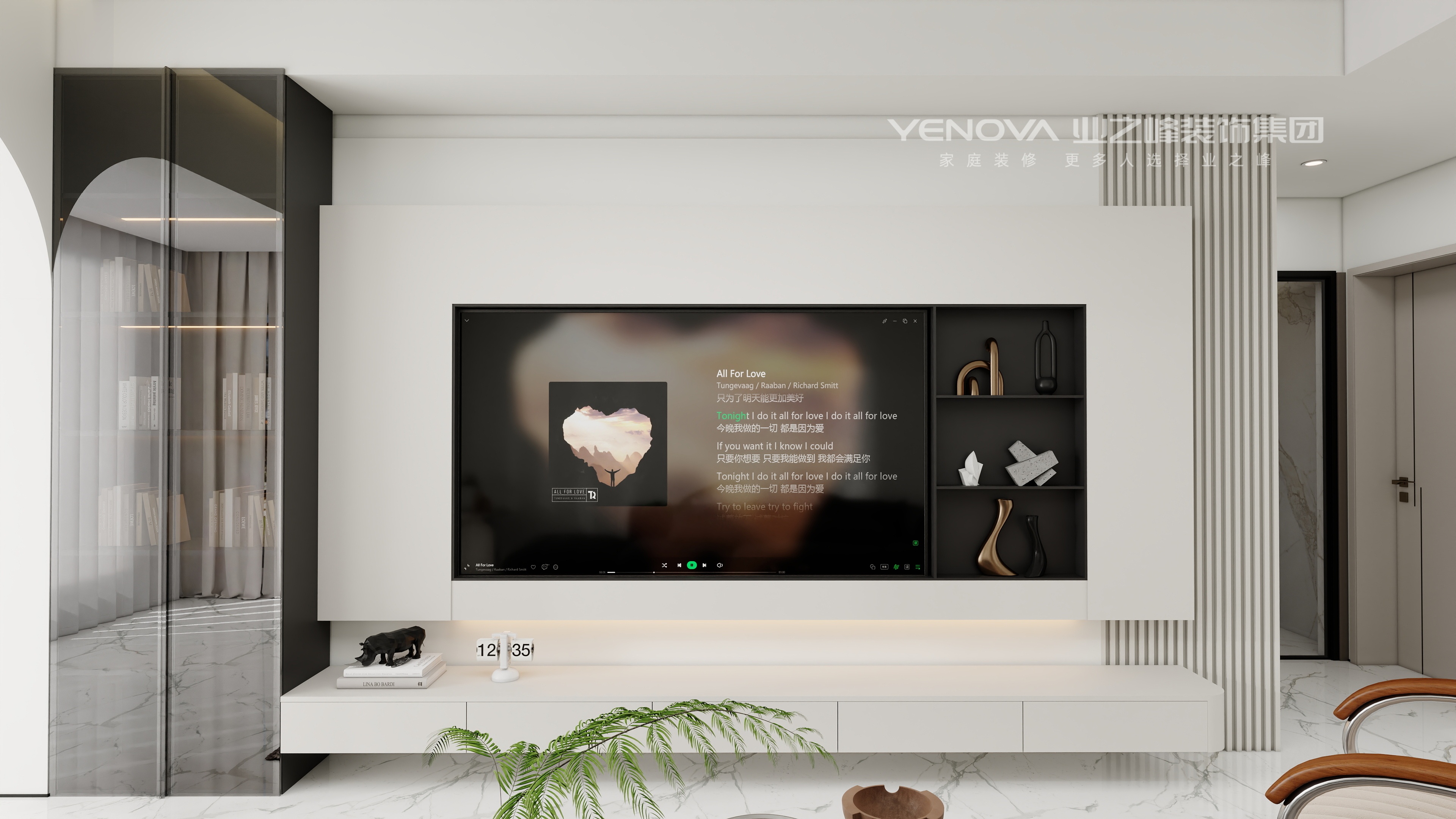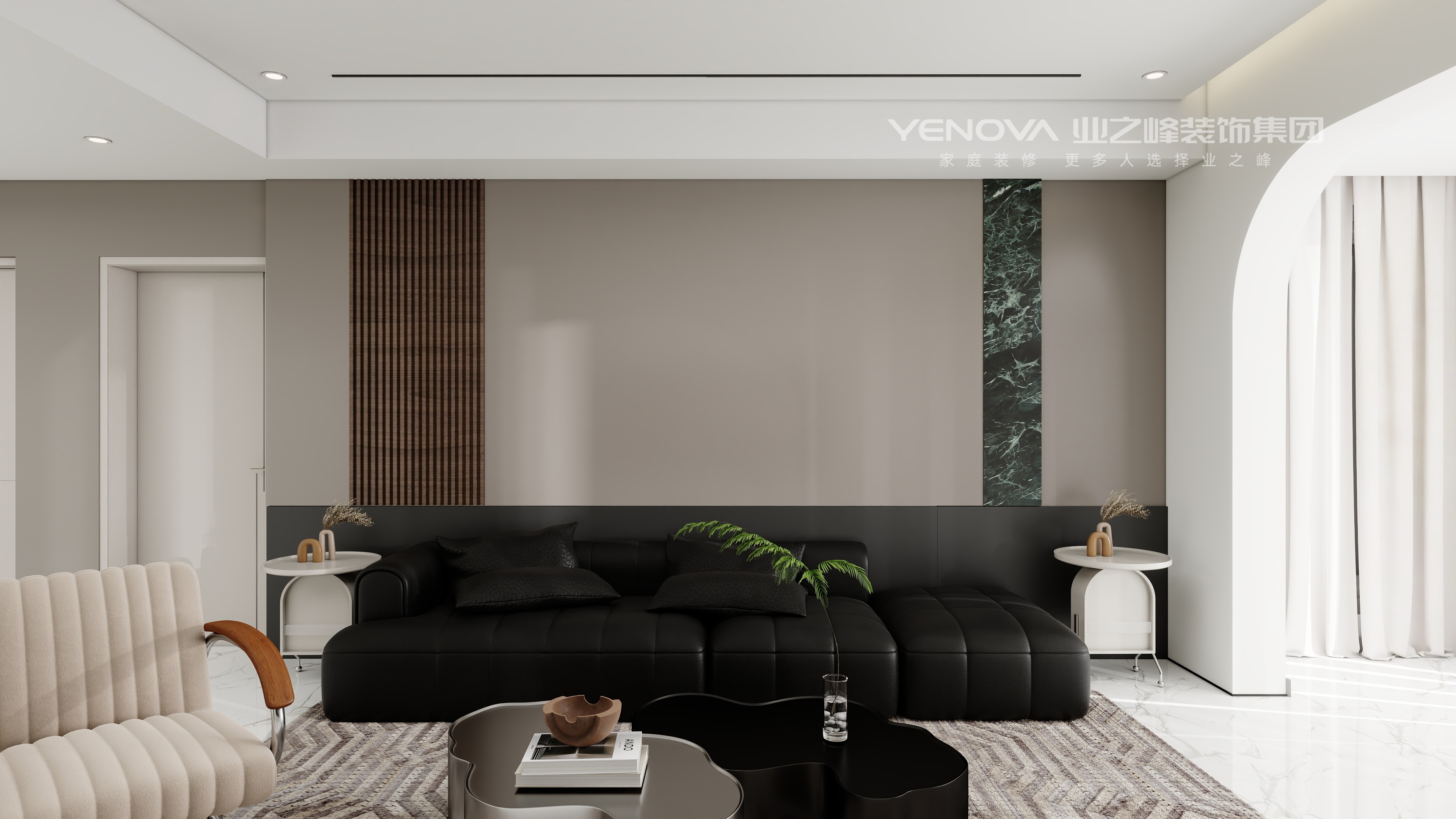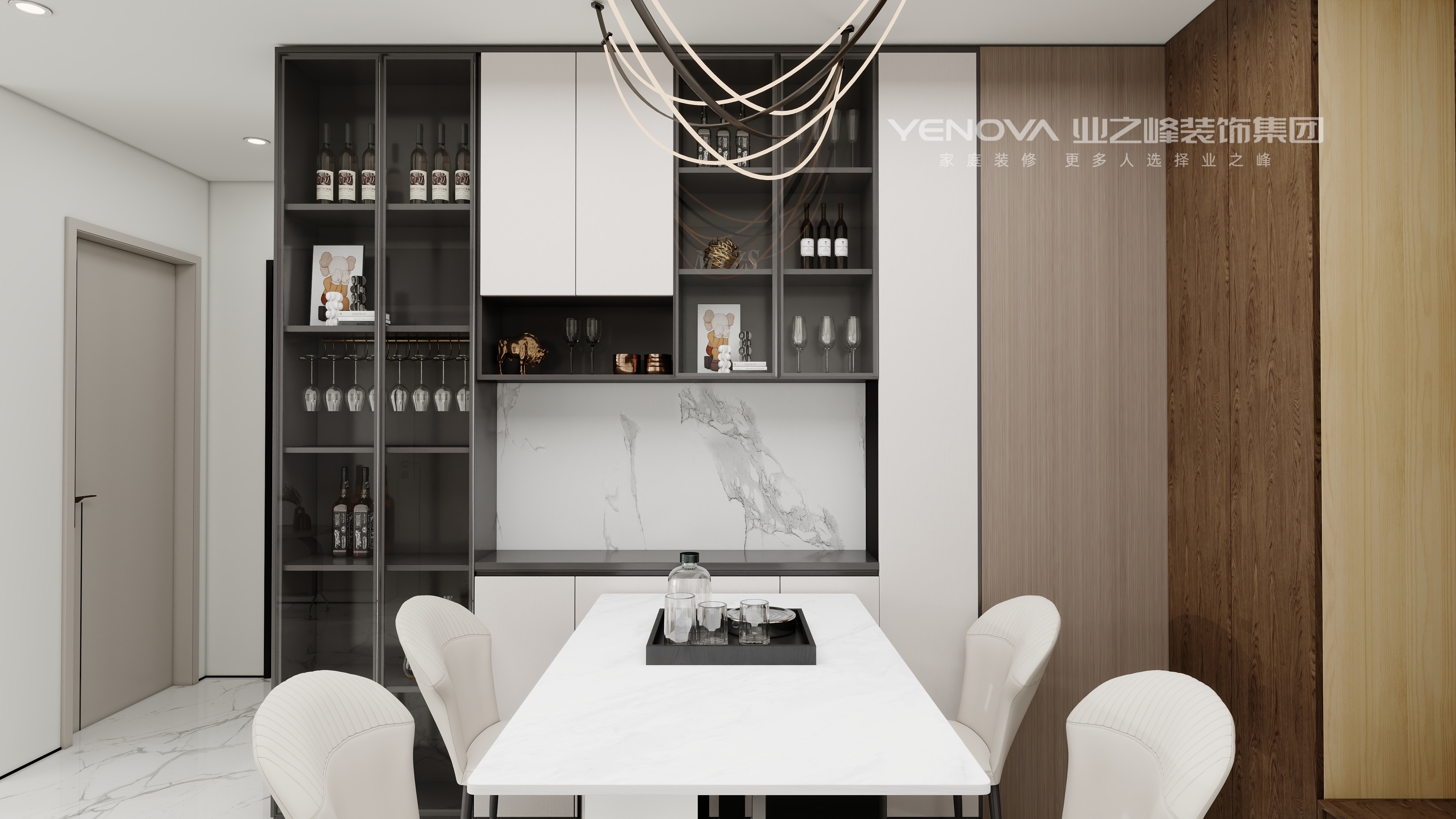 客厅采用黑白灰与木质元素的搭配,黑色皮质沙发大气稳重,搭配造型独特的茶几与绿植装饰,增添空间活力。电视背景墙设计简洁,内嵌展示柜摆放艺术摆件,提升空间格调。餐厅区域的酒柜设计精致,玻璃与金属材质的结合,展示美酒与饰品,搭配简约餐桌椅,营造出优雅的用餐氛围。