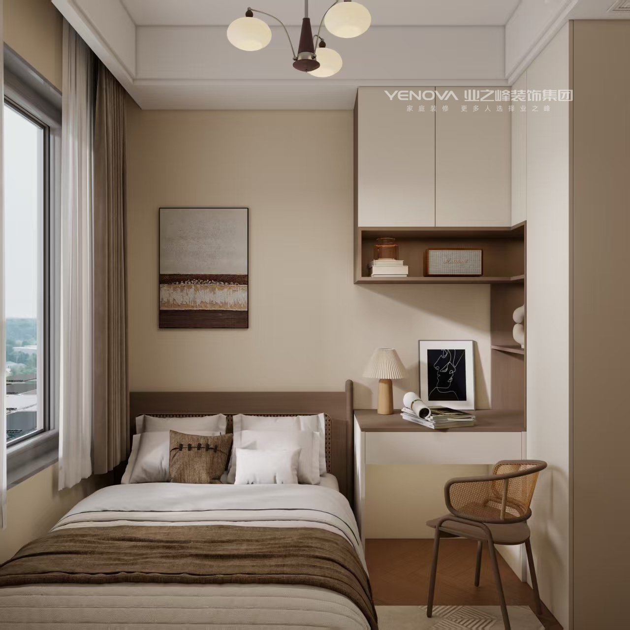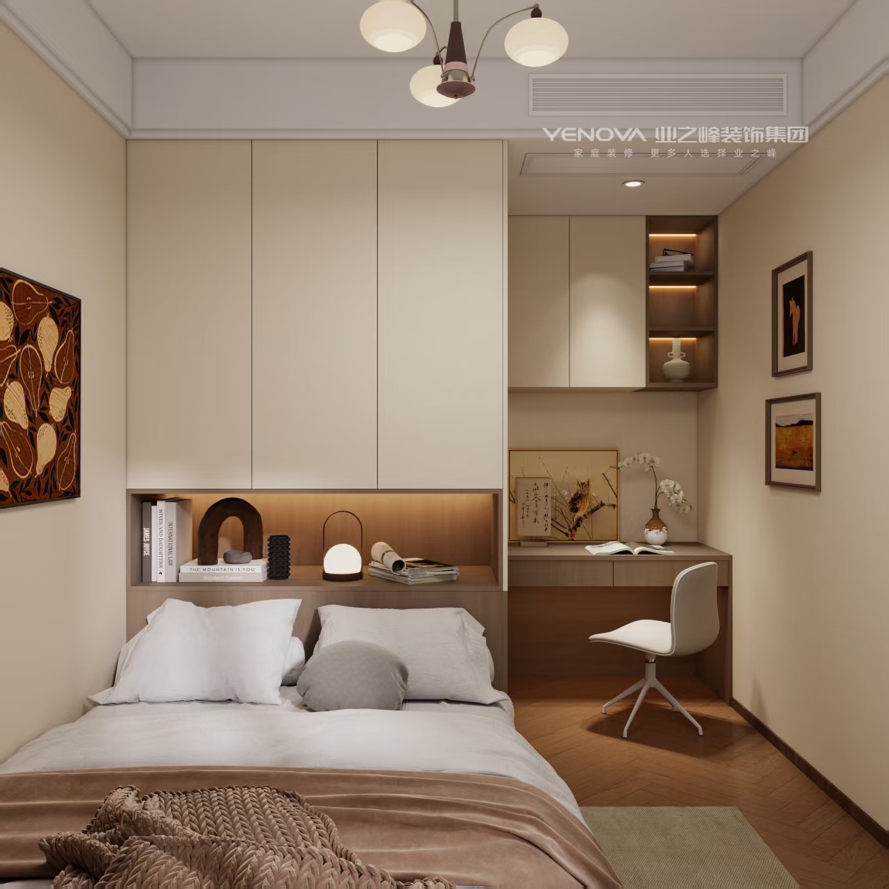 卧室基础色调以低饱和、暖色系为主,避免高饱和色彩刺激神经,影响睡眠质量。墙面刷浅杏色色乳胶漆,地面铺设实木地板天花板保留白色,通过统一的基础色调营造柔和、静谧的氛围,让居住者进入卧室后能快速放松。