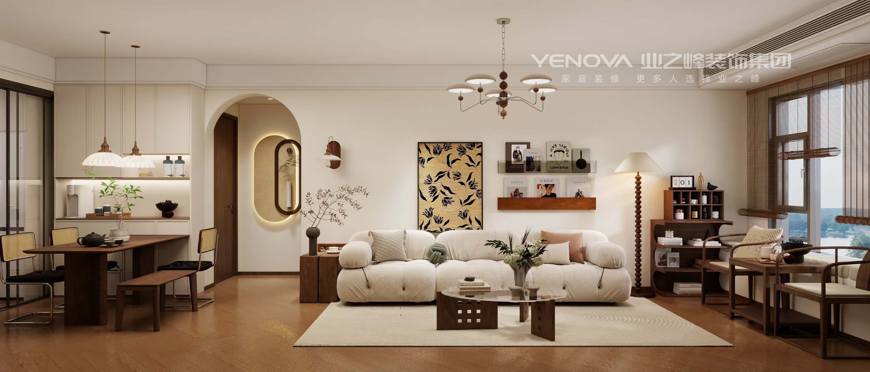 客厅沙发区用复古装饰画落地灯布置,餐厅餐桌则正对厨房出口,既方便用餐时的动线衔接,又能让两个区域的设计风格相互呼应,增强整体协调性。焦糖色的家具,搭配米色的沙发等软装,颜色上形成对比。
