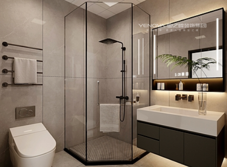卫浴空间的意式极简设计,着重于材质的质感与布局的整洁。墙面采用质感细腻的瓷砖,搭配极简的卫浴洁具,黑色五金件与白色洁具形成鲜明对比,玻璃淋浴房的利落线条拓展了空间视觉感。镜柜与收纳柜的一体化设计,将功能隐藏于简约造型之下,灯光的巧妙嵌入为空间增添了温馨感,让卫浴空间在极简中实现了舒适与美观的统一。