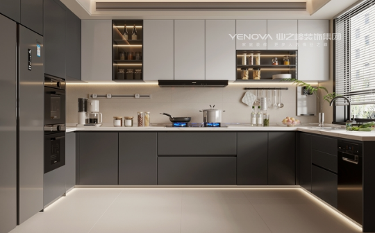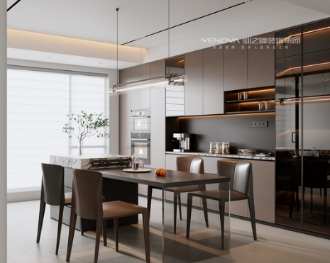 餐厨空间的设计则体现了意式极简在功能与美学上的平衡。橱柜采用简洁的平面门板,深灰与浅咖的色彩搭配沉稳大气,内嵌式电器与通透的玻璃柜门,既满足收纳需求,又增强了空间的通透感。餐桌椅造型简约,与厨房形成风格统一的整体,灯光设计暗藏于顶部与柜体,以柔和的光线勾勒空间轮廓,让餐厨区域在极简中尽显雅致与实用。