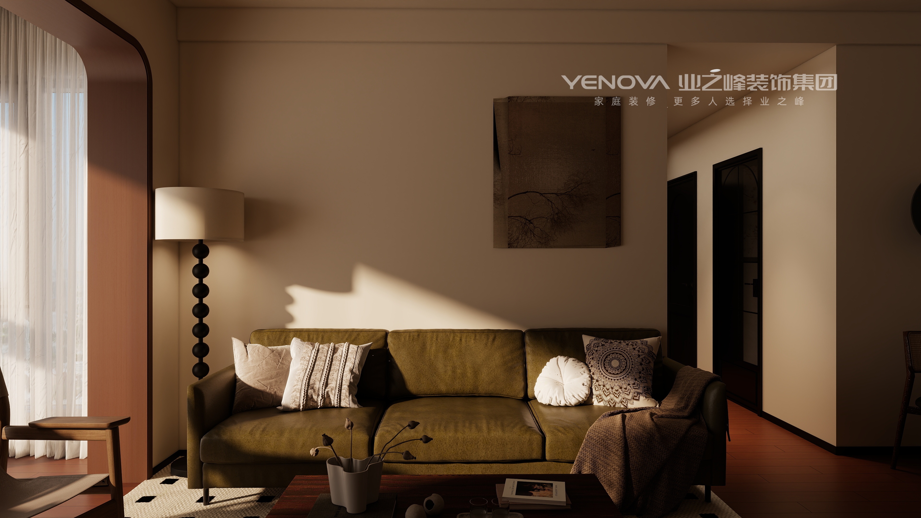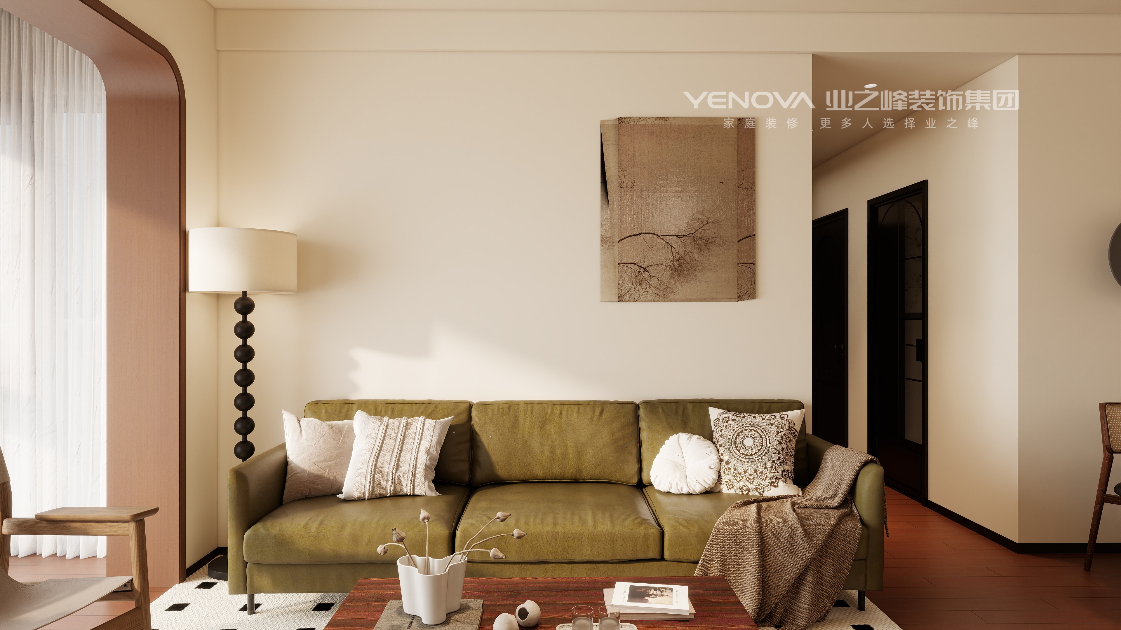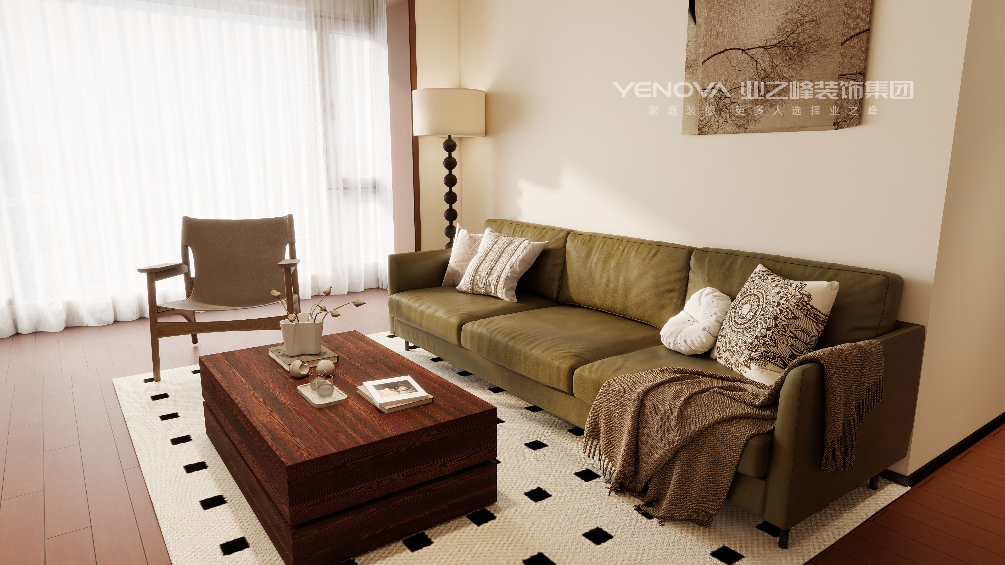 该设计呈现出复古温馨的中古风客厅空间。以橄榄绿绒面沙发为视觉核心,搭配带有编织纹理的木质单椅,传递出自然质朴的复古韵味。深棕色木质茶几纹理清晰,与黑白几何图案地毯形成视觉对比,增添空间层次。墙面装饰画风格素雅,落地灯造型独特,整体通过柔和的色调、复古的家具与精致的软装搭配,营造出舒适且富有怀旧气息的居住氛围。