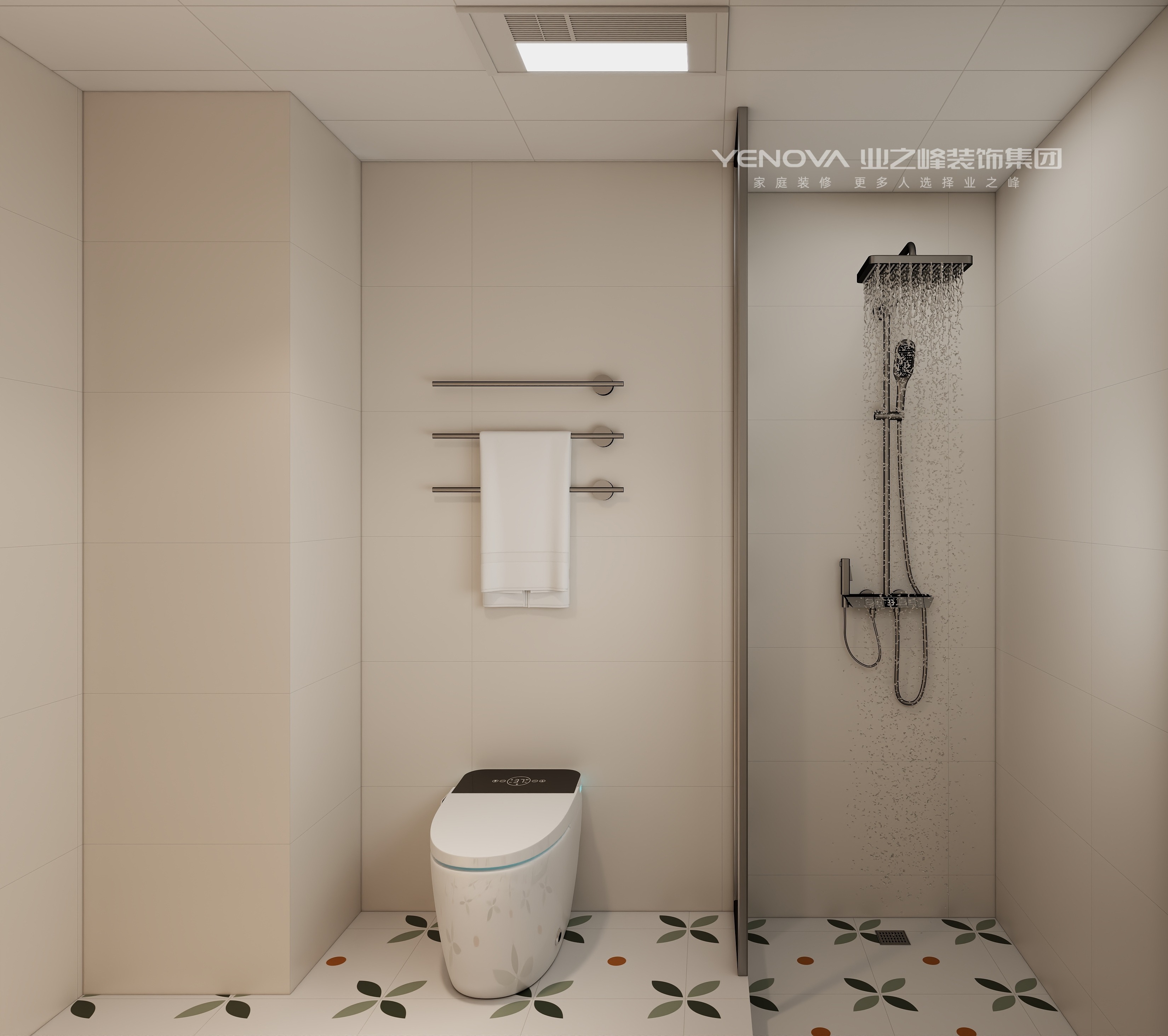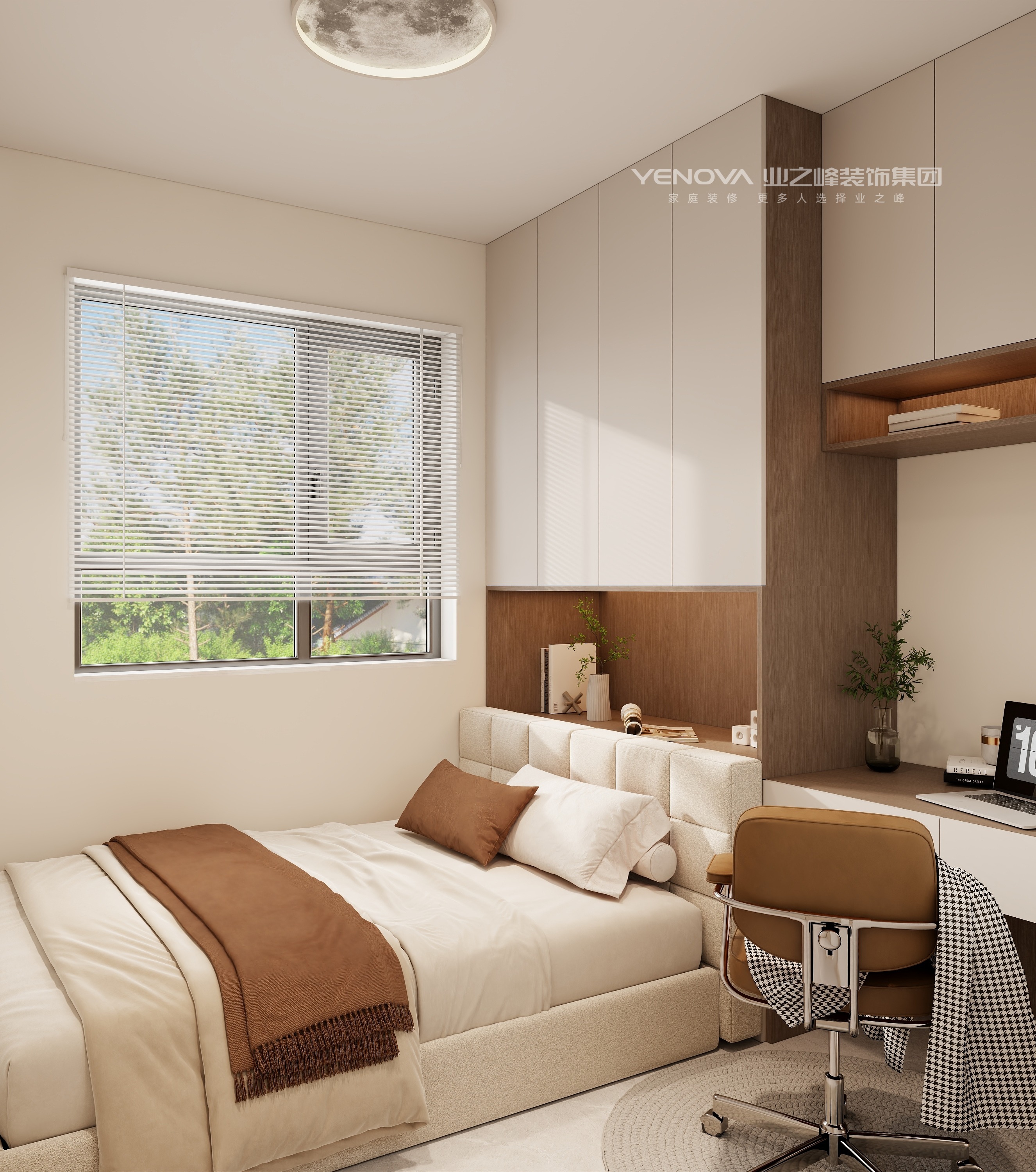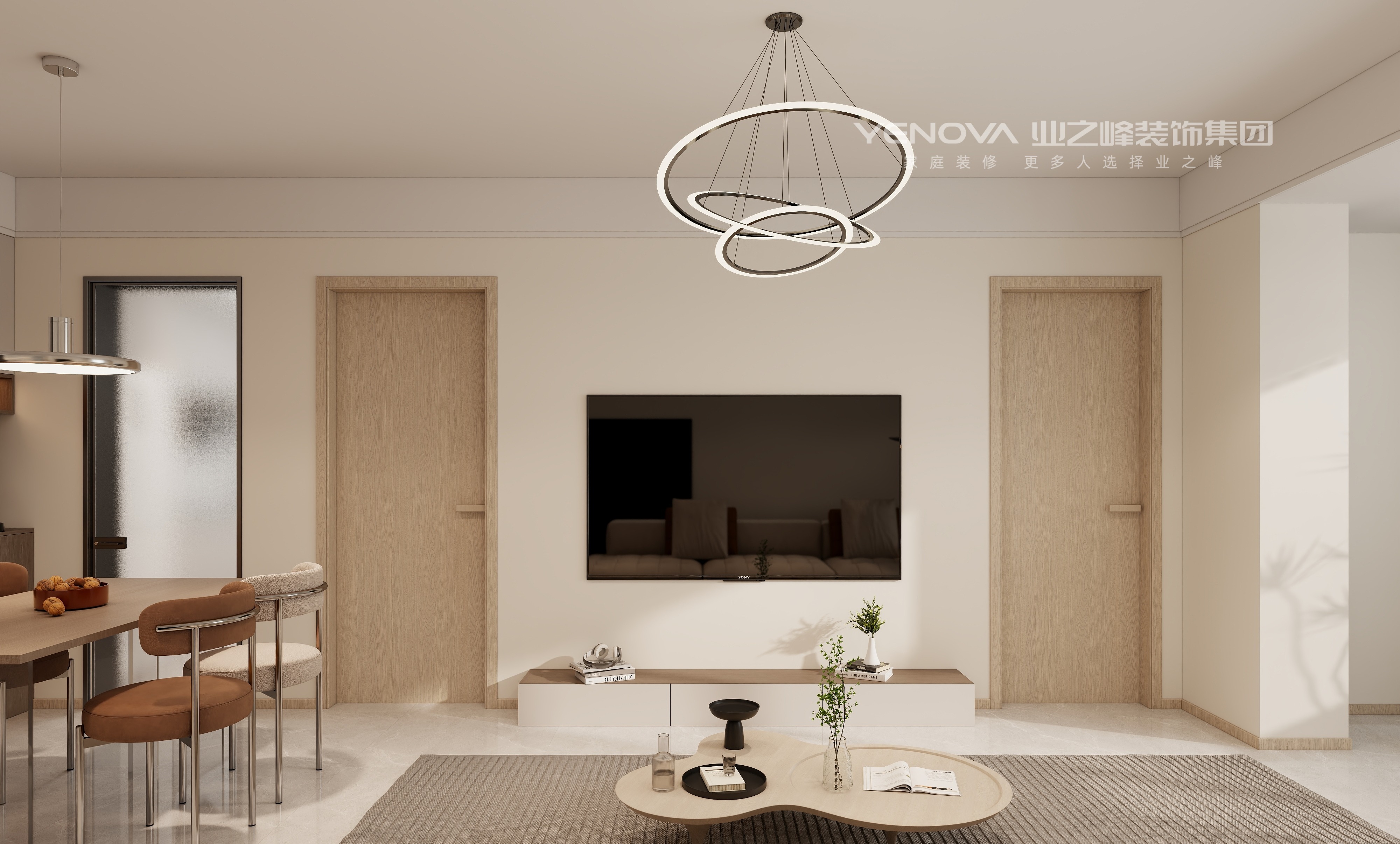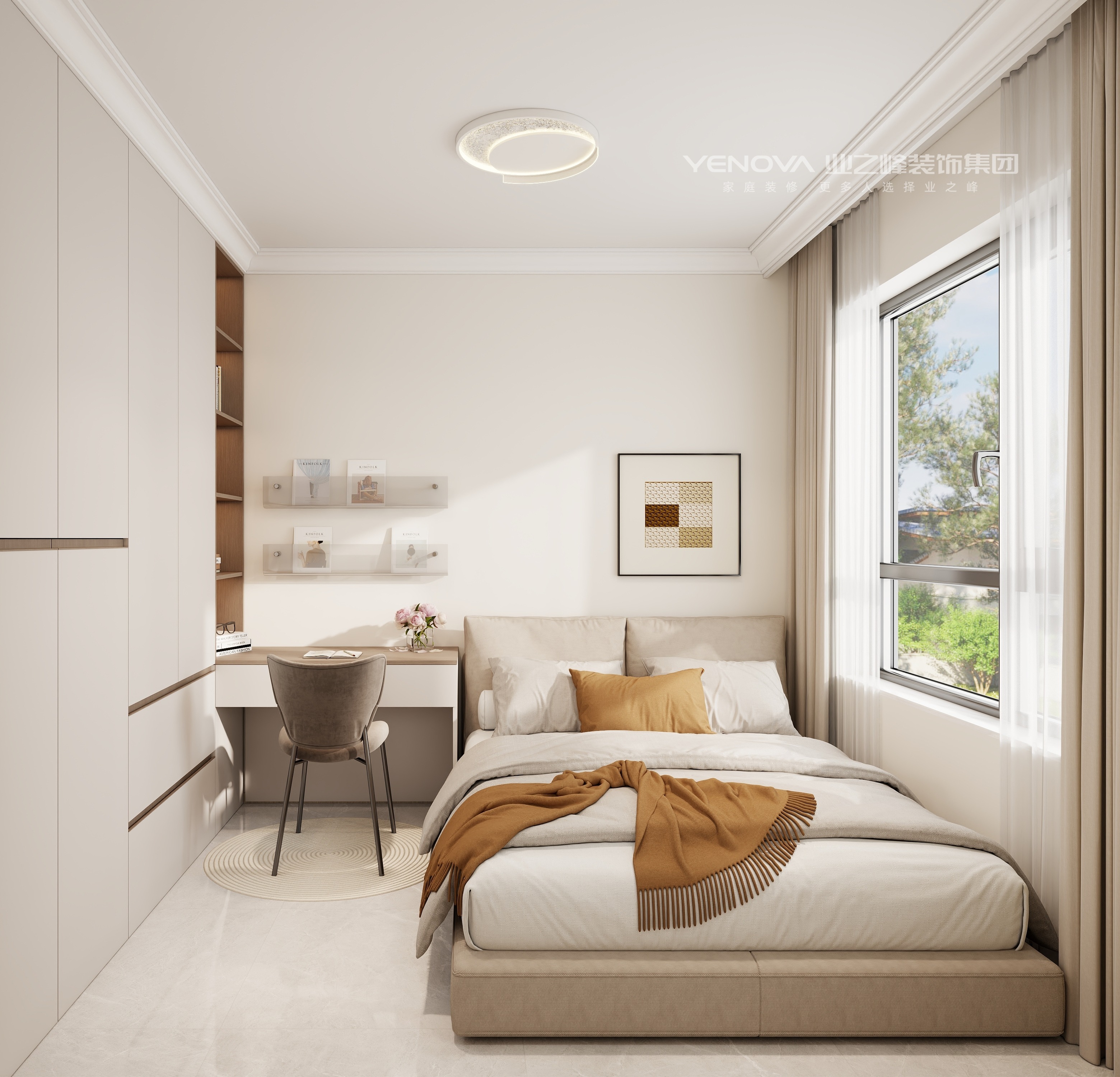公共区域的客餐厅采用一体化设计,最大化延伸空间尺度。客厅以米白色系为基底,造型别致的环形吊灯悬于中央,搭配软乎乎的方块布艺沙发与艺术感地毯,营造出松弛治愈的社交场域;一旁的落地灯与抽象装饰画,为空间注入艺术气息。餐厅区域,定制的木质餐边柜兼具收纳与展示功能,精致的金属吊灯照亮餐桌,搭配色彩协调的餐椅,让每一餐都充满仪式感。卧室空间呈现出差异化的温馨场景:主卧配置大气软包床头,对称式床头柜与满墙衣柜满足舒适休憩与强大收纳的双重需求,浅杏色床头背景墙搭配暖光壁灯,更添温馨助眠氛围;儿童房以童趣元素点缀,花朵抱枕、趣味装饰画与实用书桌结合,打造出孩子专属的“成长小天地”;另一间卧室将休憩与学习功能融合,定制书桌与衣柜一体设计,成为静谧的“充电角落”。卫浴间以简洁的 beige 系瓷砖营造整洁感,智能马桶、多功能淋浴系统提升使用便捷度,地面花形瓷砖与镜柜内置灯带的细节设计,既显灵动又具实用性。
