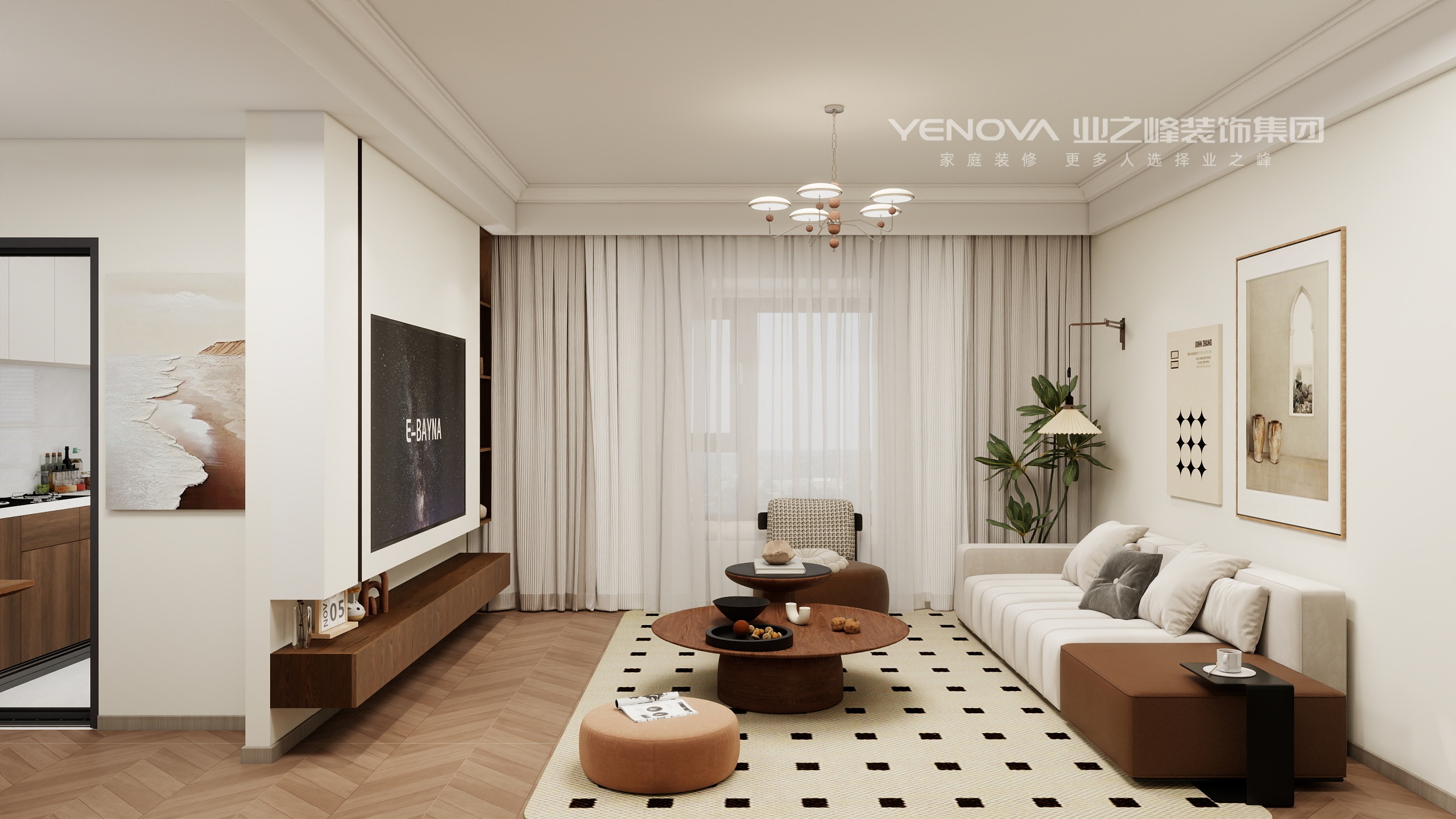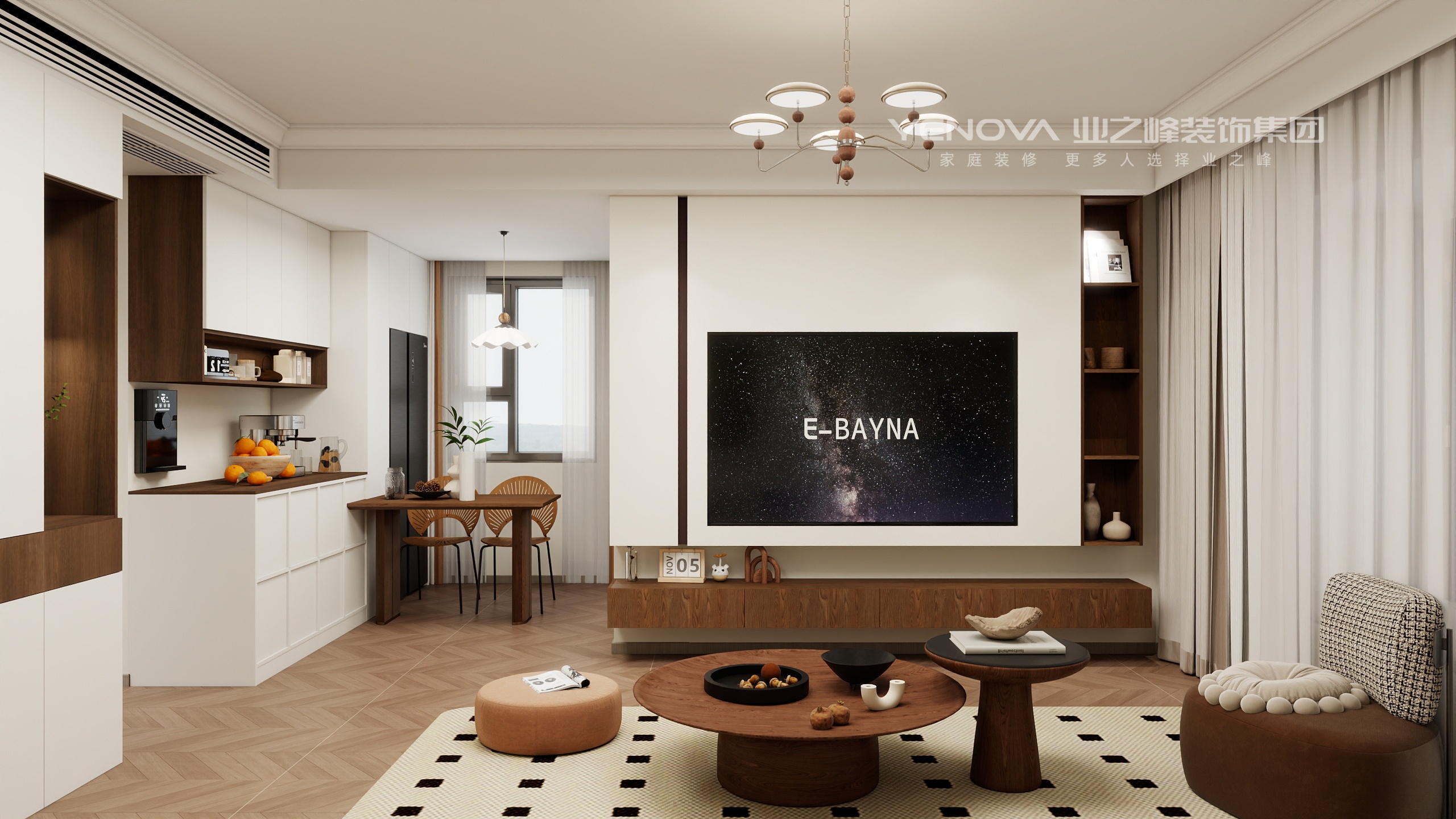 风格上,整体采用米白、深棕、黑色等中性色调构建和谐基底,搭配人字拼木质地板、复古纹理家具,将现代设计的简洁线条与复古元素的细腻质感巧妙融合。客厅中,复古造型的吊灯与几何图案地毯形成视觉焦点,木质圆形茶几和简约沙发的组合,既满足现代生活的功能性,又通过复古元素增添空间温度;电视背景墙的简约造型与嵌入式木质收纳,在实用中体现设计的精致感。
