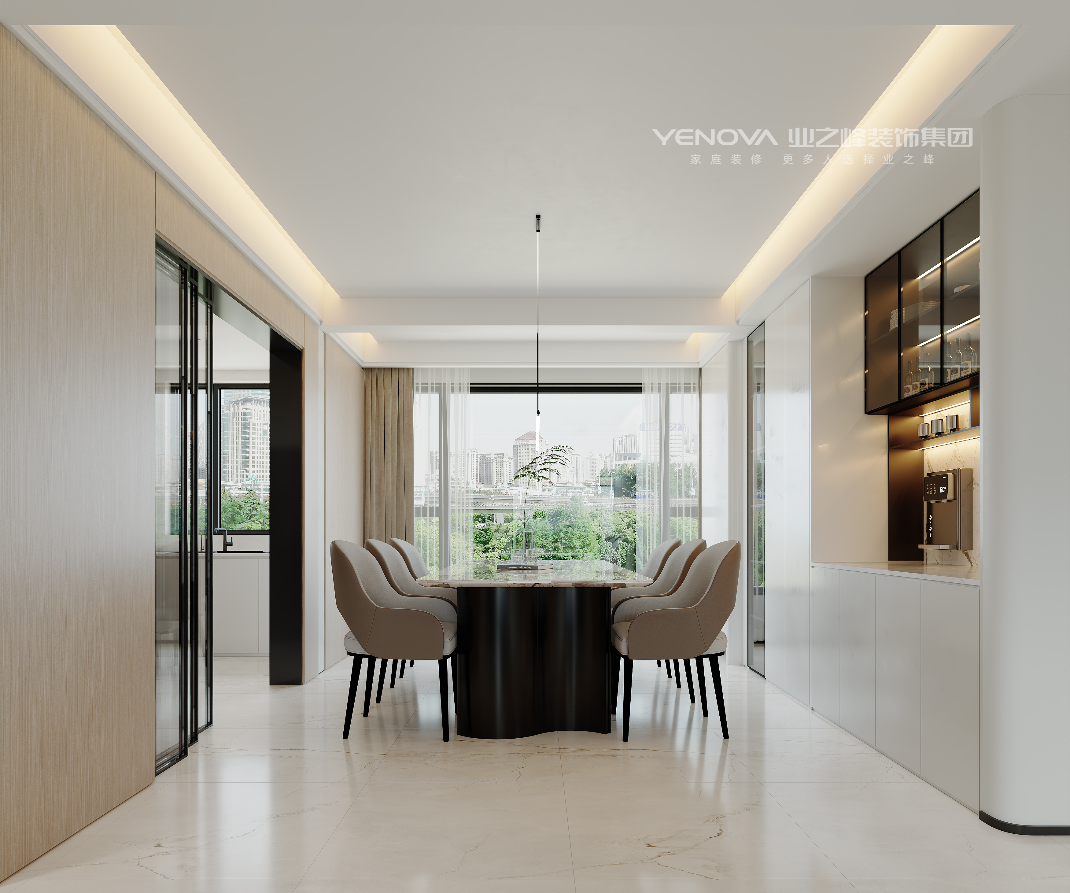 餐厅与客厅相连,采光良好,配有简约餐桌椅,上方线性吊灯设计感十足。餐边柜采用玻璃柜门与灯带结合,展示收纳兼具设计美学,提升空间精致感。