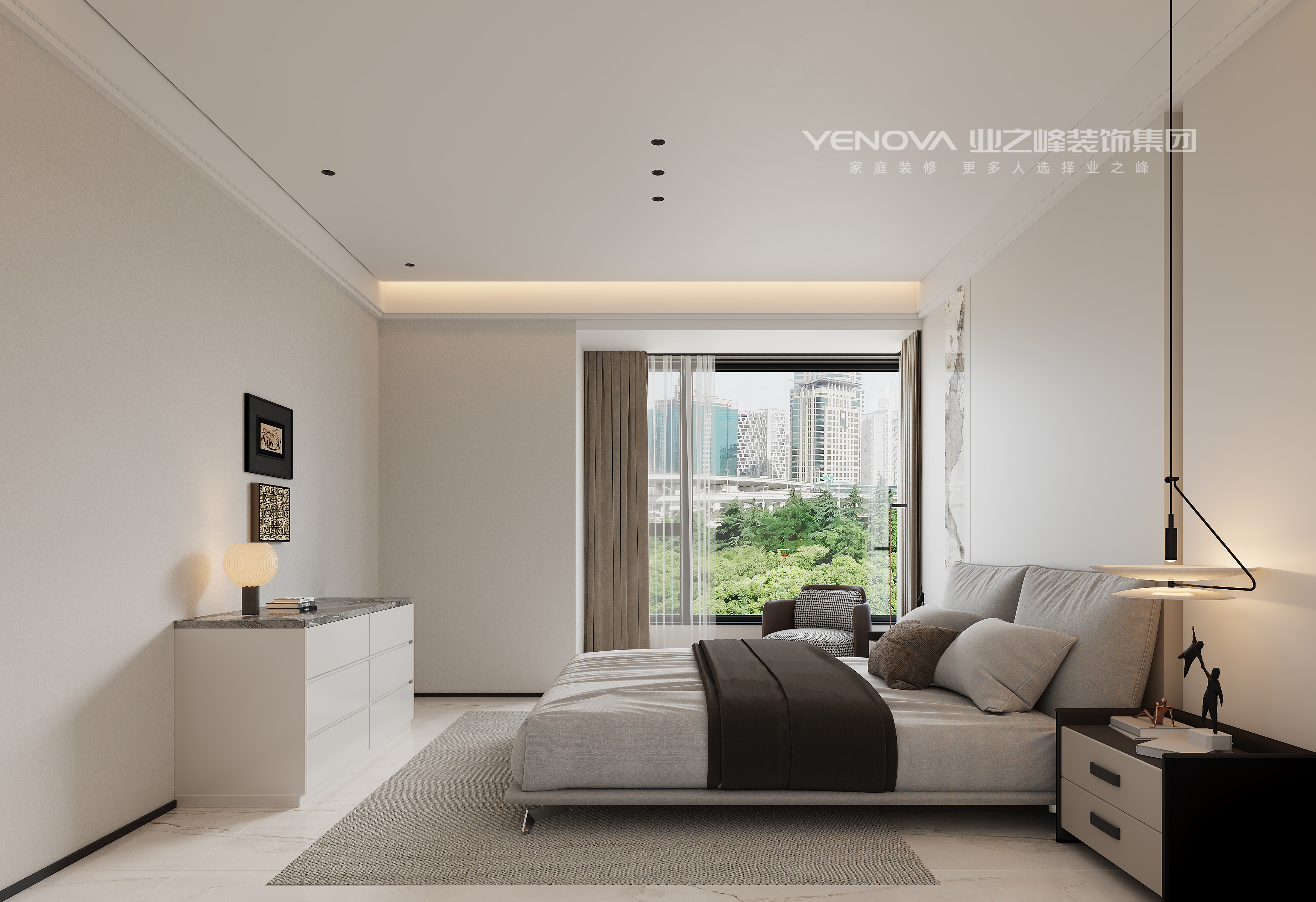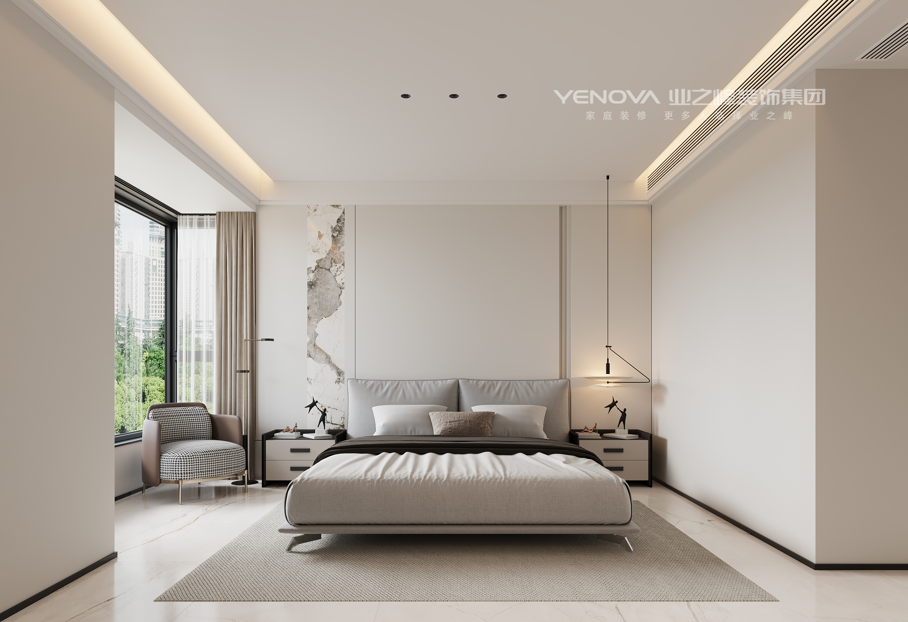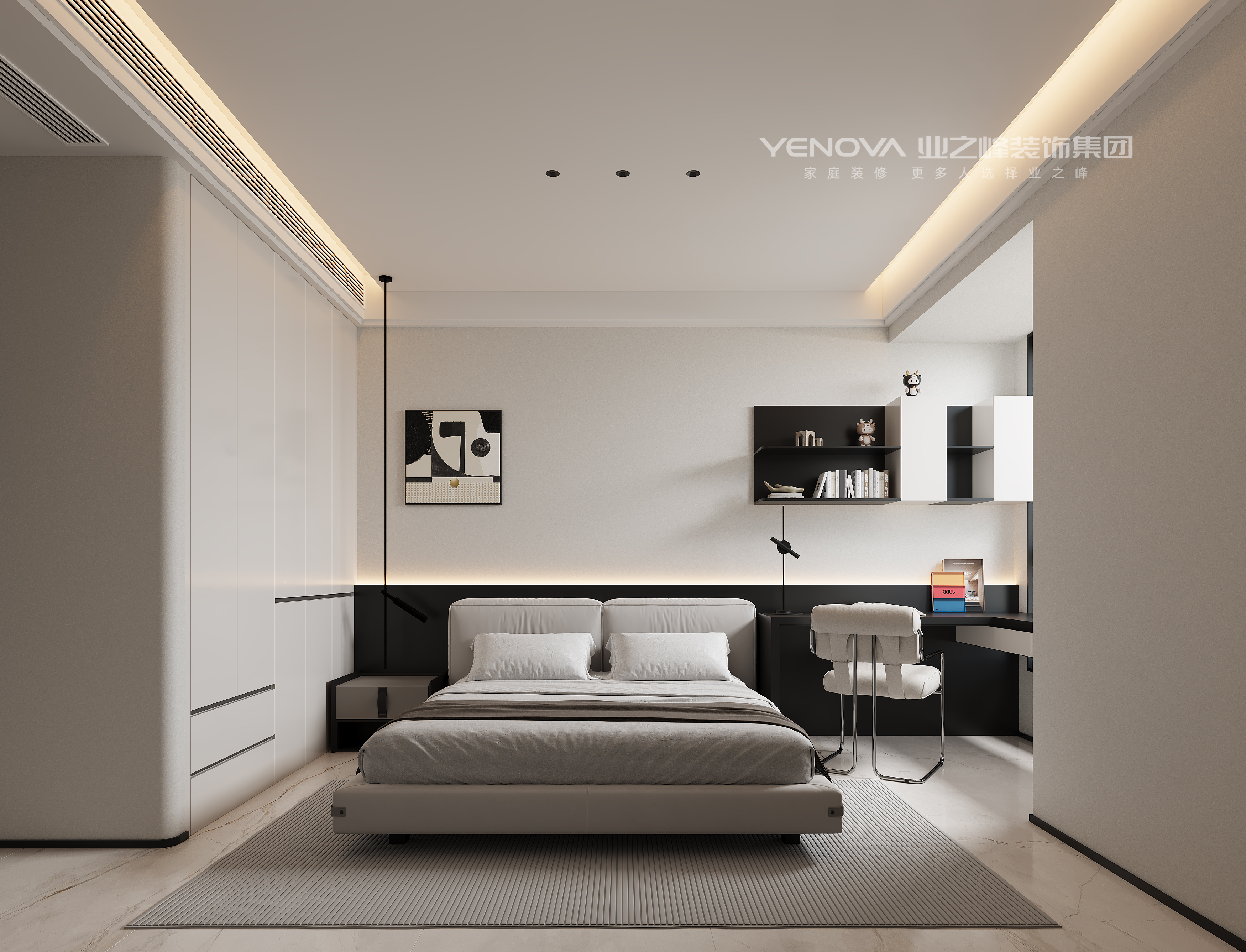 卧室整体以简洁的线条、纯净的色调为主,营造出舒适雅致的休憩空间,以白色、浅灰,黑色为主色调,搭配深灰、棕色等中性色软装,营造出简约大气又不失温馨的氛围。床具设计简约时尚.床头柜造型简洁,兼具实用收纳功能;卧室还搭配了休闲椅,为阅读或休憩提供舒适角落。
